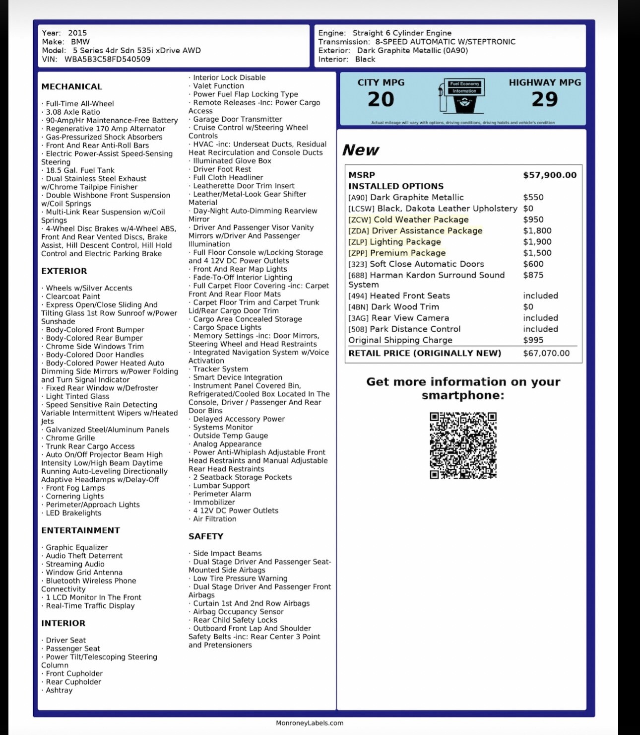 Meticulously maintained 2015 BMW 535i xDrive. All services are up to date with an oil change and all fluid flushes done about a month ago (transmission (fluid + filter),coolant, differentials, transfer case). Has brand new tires with warranty, new brakes + rotors, spark plugs +coils, high pressure fuel pump, and BMW battery. Calipers are painted red now. Car has a rebuilt title due to accident at 1-2k miles, was repaired by dealer and sold to previous owner. The odometer was damaged during accident but the new odometer installed by dealer during repair was very close to original odometer if Carfax is compared. Previous owner was a corporate executive that meticulously maintained vehicle from 2k miles to 86k miles at which time I purchased it. Since then I’ve done all maintenance every 3k miles. Engine oil analysis shows engine is in very good condition as a result. Always garaged and hardly ever driven in snow. It was mostly babied and used as a secondary car. New buyer has to do no repairs and is getting a vehicle that is absolutely gorgeous to look at and is fantastic to drive especially with the bulletproof N55 engine. Please do not waste my time with low ball offers. This vehicle is one of the cleanest BMWs. No trades. Local pickup or buyer responsible for arranging shipping.Vehicle Details