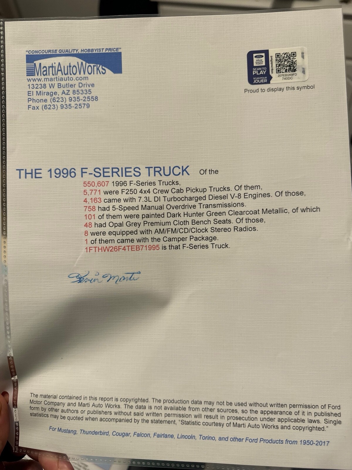 Ford Marti history report confirms the truck is a special ordered 1 of 1 with all selected options. Shows original special order date and the date it was delivered to buyers. Have owners manual and original documents form dealer including window sticker. Very cool looking rare truck you don’t see everyday in this condition that’s basically all new mechanically and ready to daily drive. CLEAN TITLE IN HAND