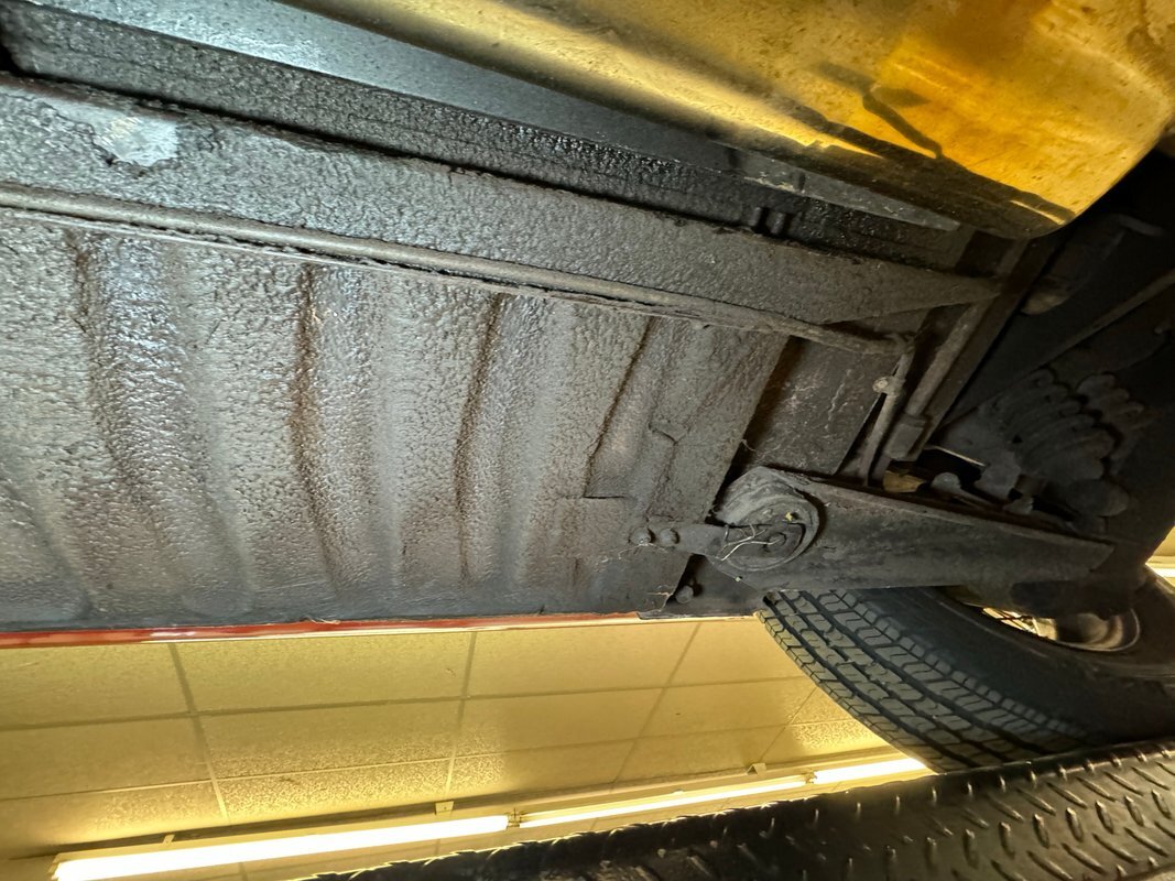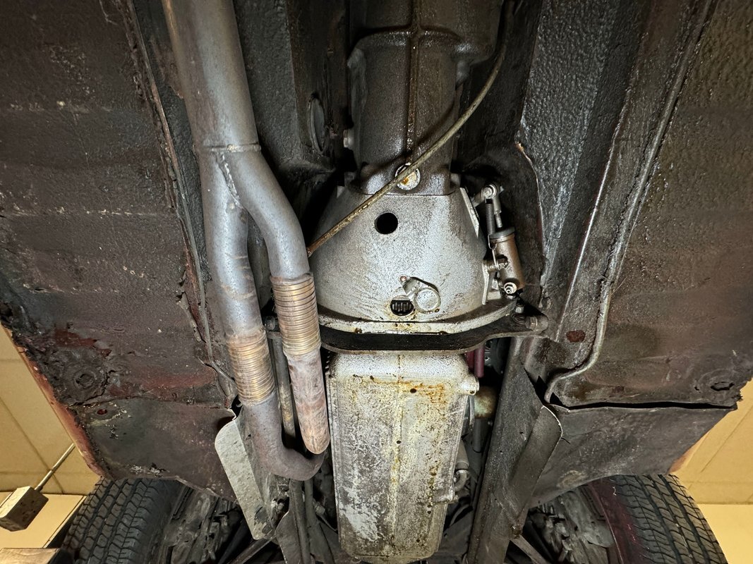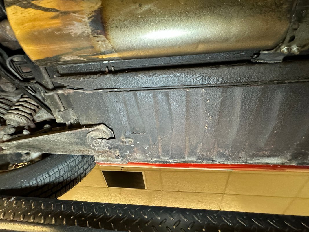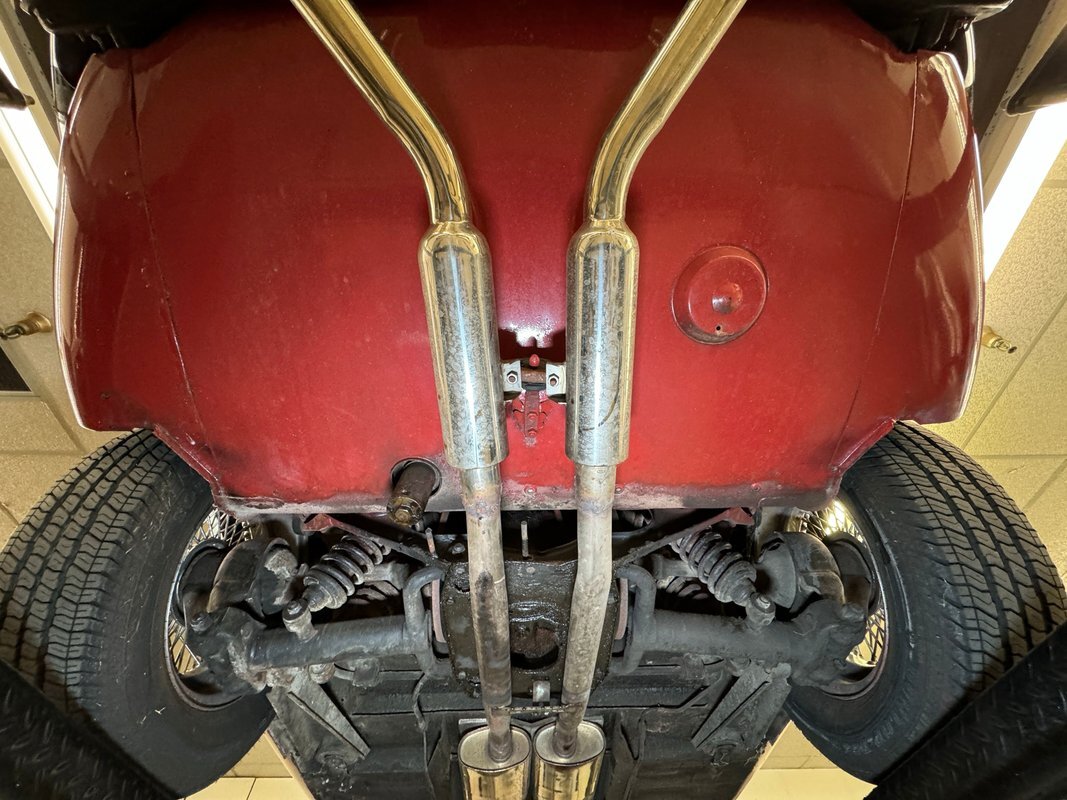 Driver quality underneath although the stainless steel mufflers and chrome tips provide glimmering tidbits of cleanliness for the dual exhaust. Surface rust is mostly reserved for the front cradle and a build up of grease is observed on the wheel and suspension components. Oil is noted on the rear differential, oil pan, and transmission pan, and we note areas of overspray. A bit of invasive and flaking rust is seen on a belly pan near a body mount and seems to be isolated in this area. Torsion bar suspension is provided up front while coil overs are equipped on the rear independent suspension.