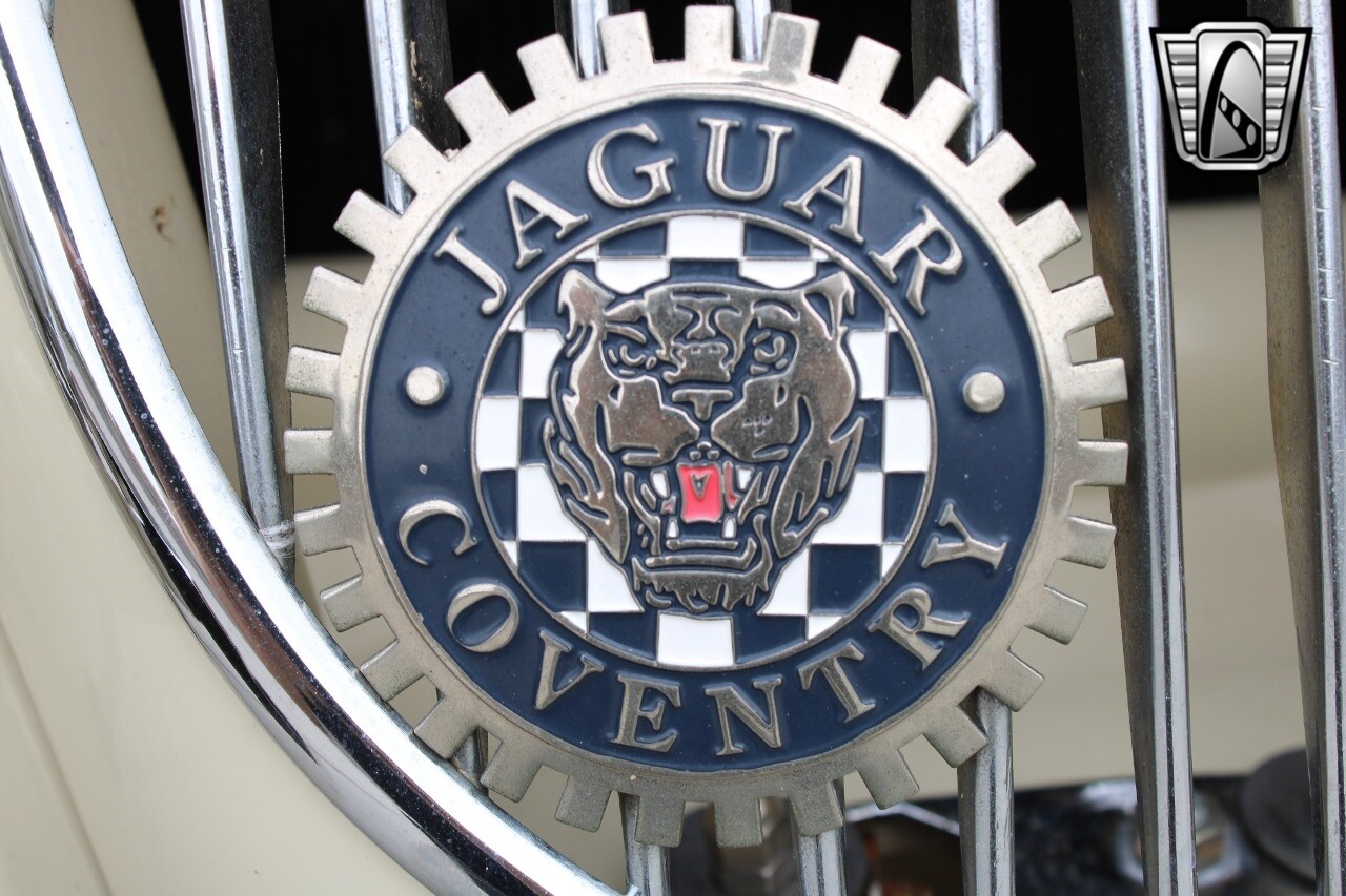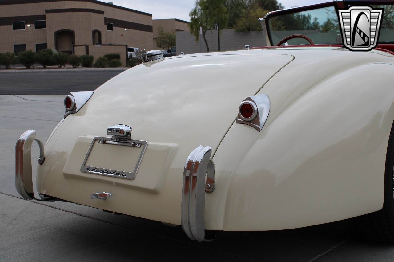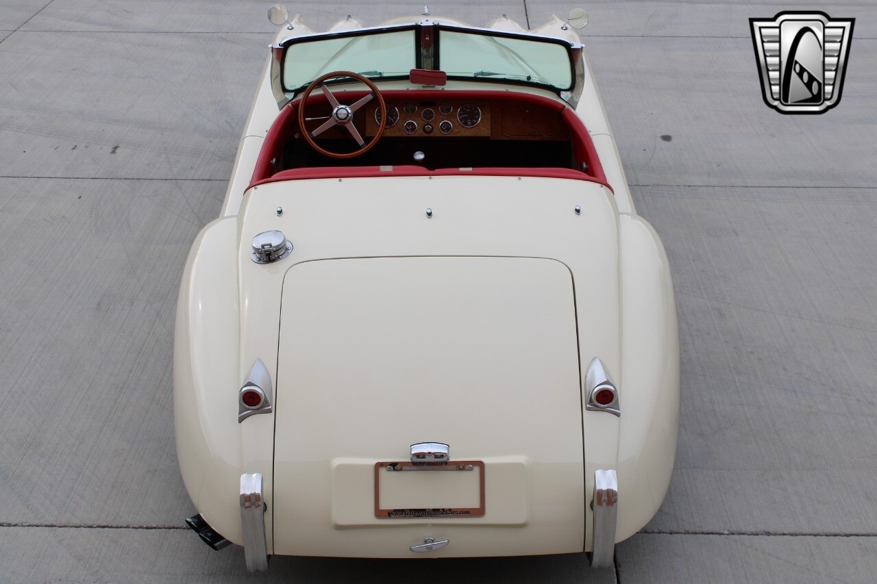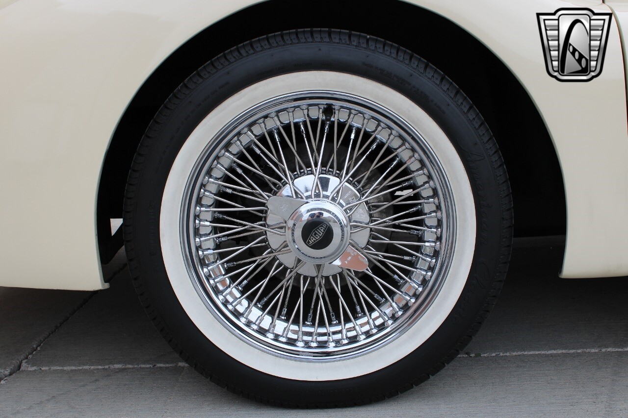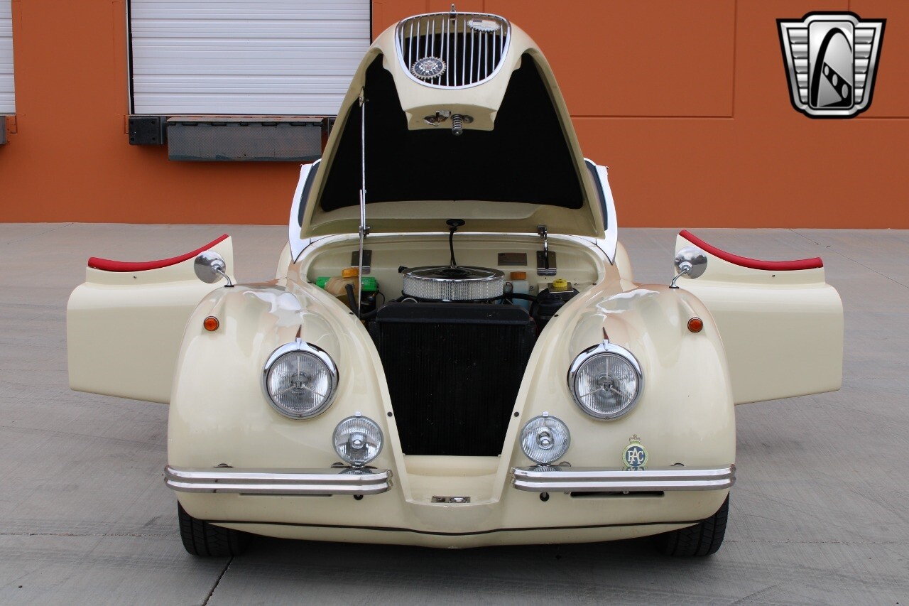 EXTERIOR: Beautiful looks, very true to the original. The details will fool most people. Very high quality fit and finishes. It is a Kevlar body, it's body is nice and the gaps are precise. Doors shut solid, it has sturdy stainless hinges. The Ivory paint is pristine. It is polished to a smooth, high gloss finish. I did not see any flaw. Up front it has the aluminum bumperettes, original style Lucas fog lamps and headlights. It even has the Jaguar ornament and correct mirrors on each fender. It has aluminum windshield frame with new laminated glass. In back it has the pop up gas cap, aluminum tail lights and bumperettes. Keeping it real is a set of genuine knock off spinner wire wheels. They are new 16x6 Dayton's with new radial white wall tires.