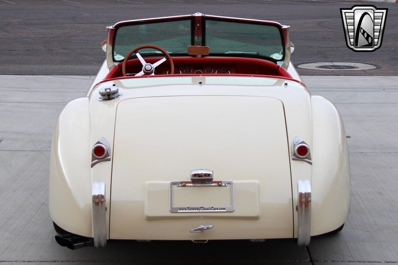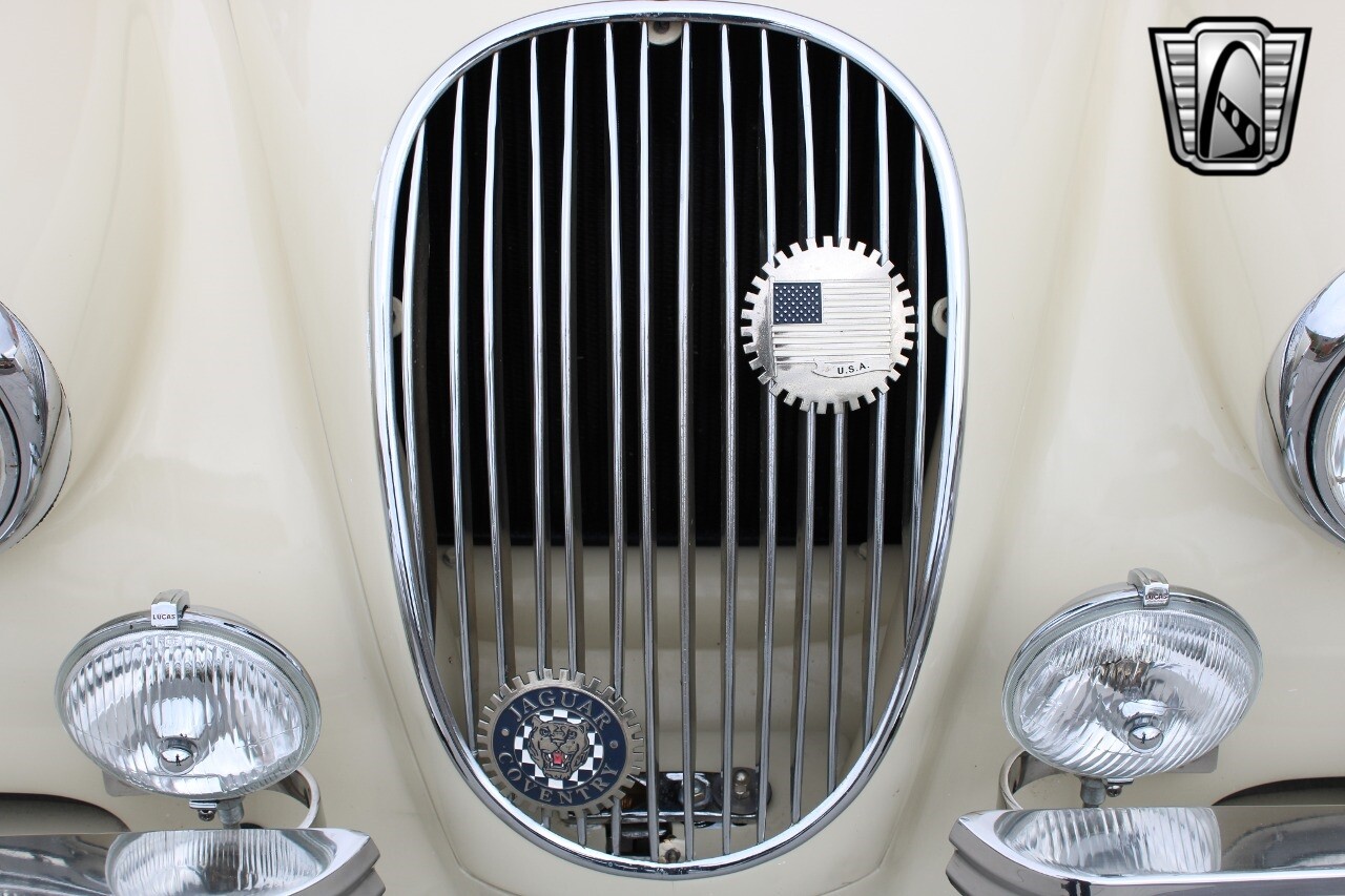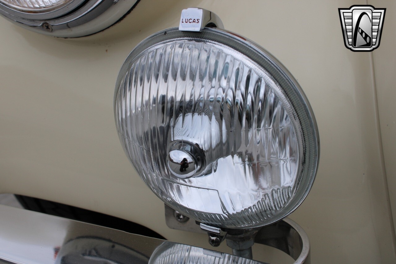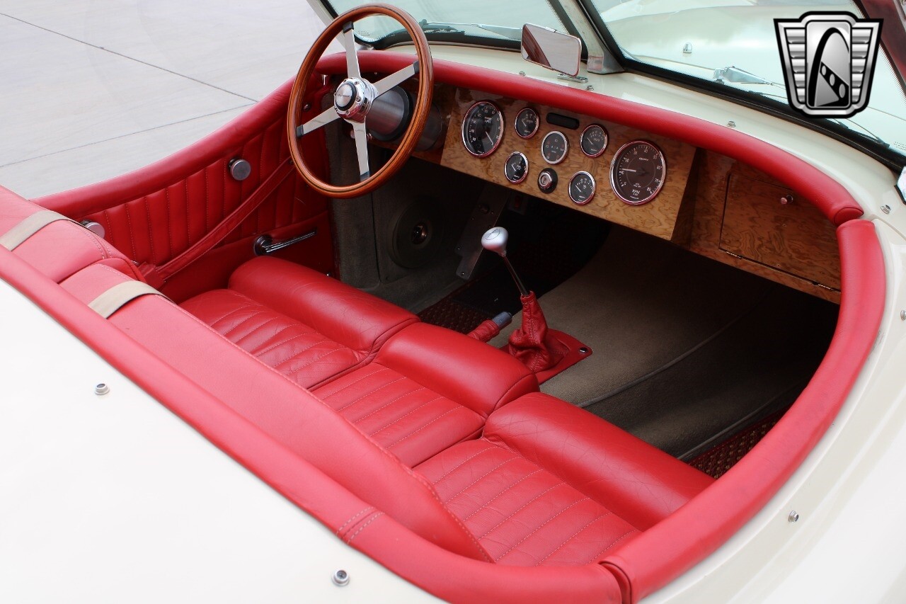 EXTERIOR: Beautiful looks, very true to the original. The details will fool most people. Very high quality fit and finishes. It is a Kevlar body, it's body is nice and the gaps are precise. Doors shut solid, it has sturdy stainless hinges. The Ivory paint is pristine. It is polished to a smooth, high gloss finish. I did not see any flaw. Up front it has the aluminum bumperettes, original style Lucas fog lamps and headlights. It even has the Jaguar ornament and correct mirrors on each fender. It has aluminum windshield frame with new laminated glass. In back it has the pop up gas cap, aluminum tail lights and bumperettes. Keeping it real is a set of genuine knock off spinner wire wheels. They are new 16x6 Dayton's with new radial white wall tires.