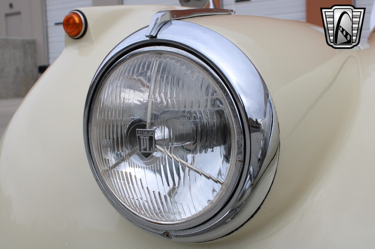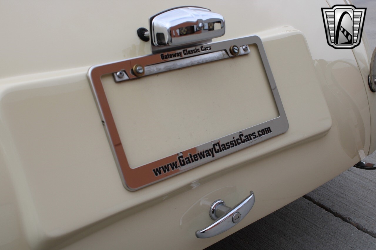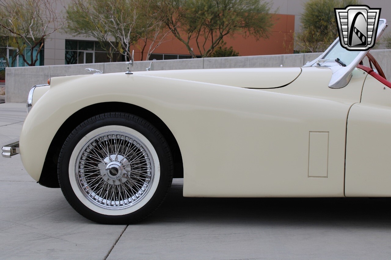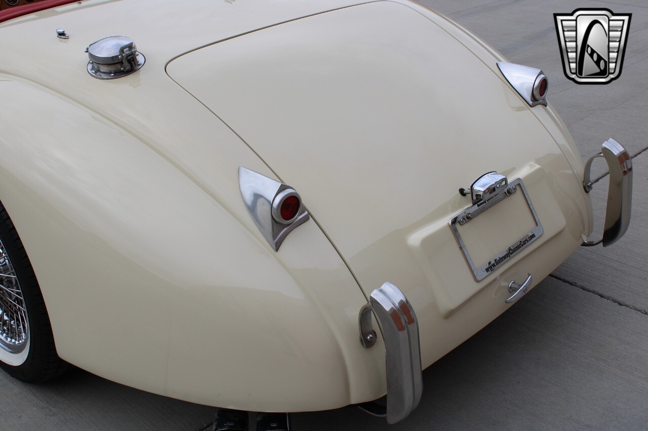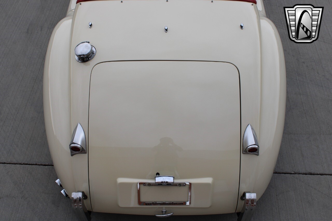 EXTERIOR: Beautiful looks, very true to the original. The details will fool most people. Very high quality fit and finishes. It is a Kevlar body, it's body is nice and the gaps are precise. Doors shut solid, it has sturdy stainless hinges. The Ivory paint is pristine. It is polished to a smooth, high gloss finish. I did not see any flaw. Up front it has the aluminum bumperettes, original style Lucas fog lamps and headlights. It even has the Jaguar ornament and correct mirrors on each fender. It has aluminum windshield frame with new laminated glass. In back it has the pop up gas cap, aluminum tail lights and bumperettes. Keeping it real is a set of genuine knock off spinner wire wheels. They are new 16x6 Dayton's with new radial white wall tires.