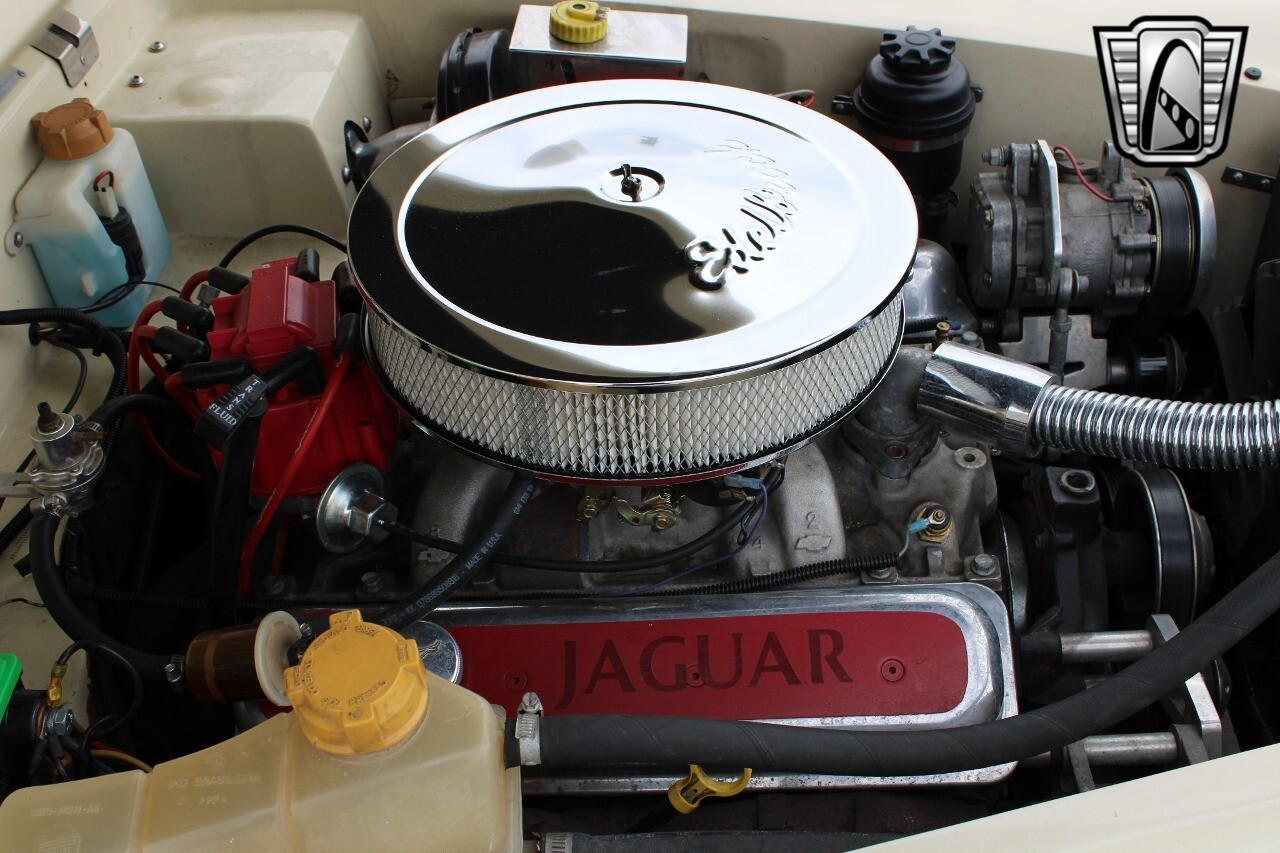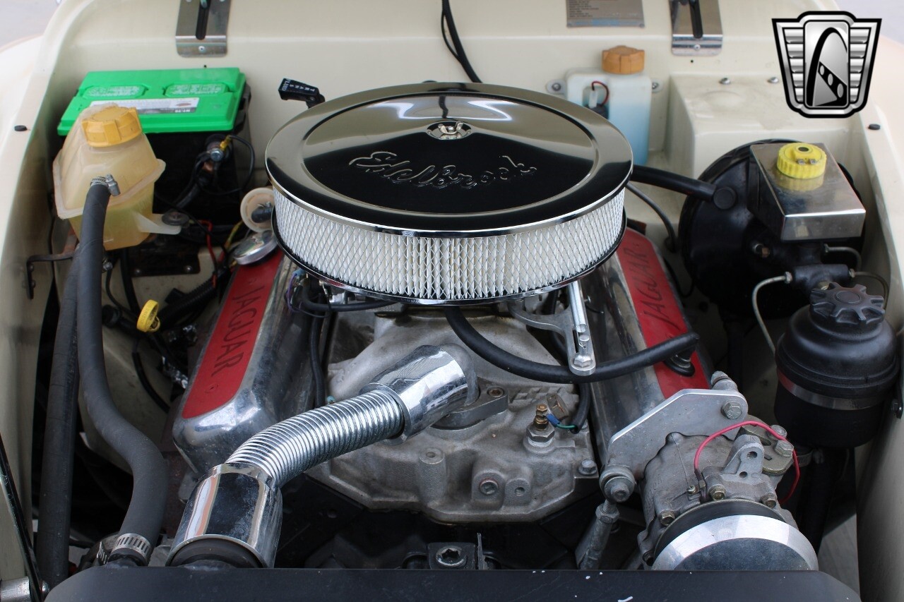 ENGINE COMPARTMENT: New GM crate 350 motor offers maximum reliability. Dressed with aluminum Jaguar valve covers. New serpentine belt and pulleys. New aluminum radiator keeps it running cool. New wiring. It features power steering and brakes. It is a very tidy and proper looking motor compartment. The firewall is slick like the exterior.