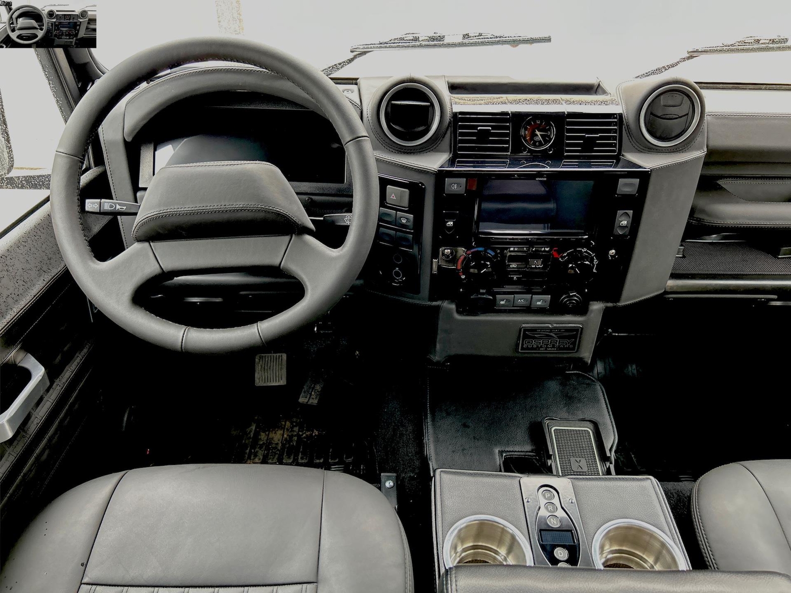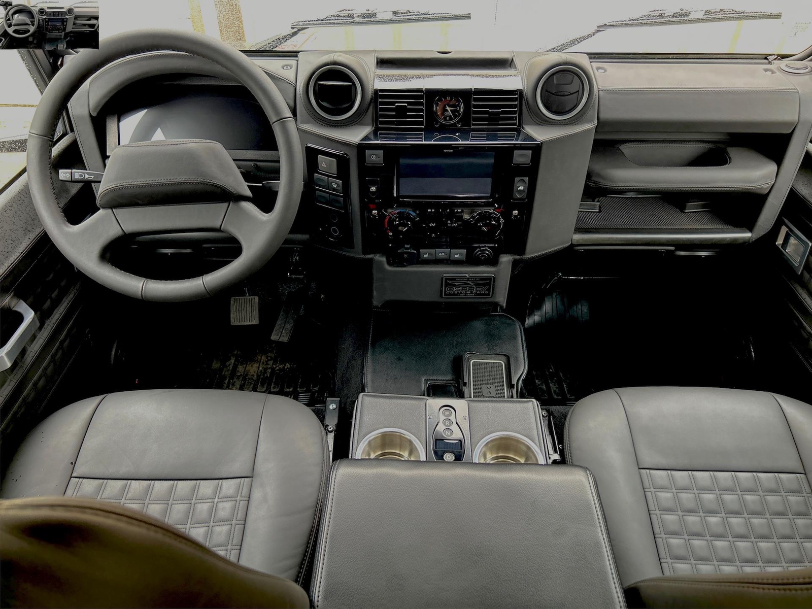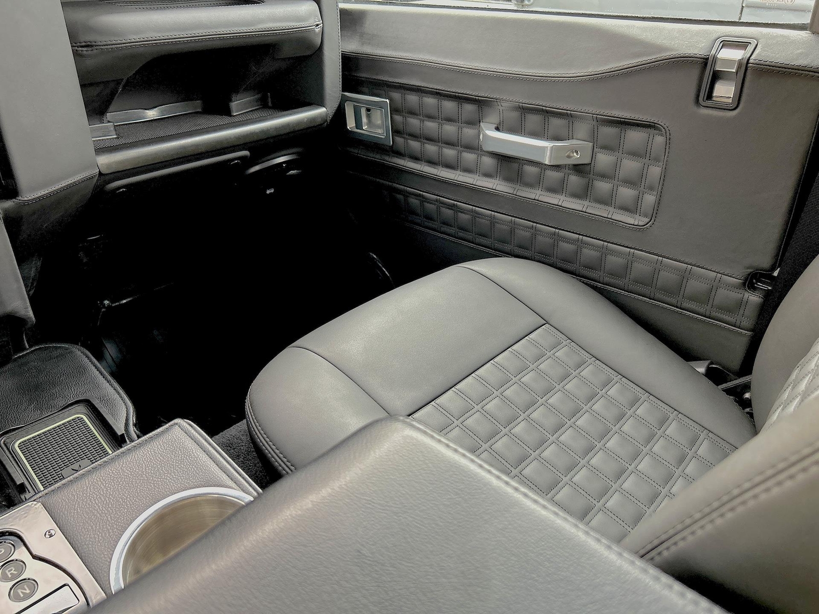 The special 4-door-with-a-bed body was expertly finished in sleek, modern Corris Gray Metallic paint, exuding a sense of sophistication and luxury, with a timeless look and a touch of contemporary flair. It is complemented by color-matched wheel arches and trim, as well as a Line-X® treated bed, all completed at our in-house body and paint facility. At the front end, this rugged-yet-refined SUV showcases a gloss black grille with satin silver inserts, body color-matched light surrounds, and satin black side intake and wing top vents. Optimill® black anodized billet aluminum door, bonnet, and windscreen hinges add to the understated color palette. The impressive front is completed with a satin black powder-coated slim-line bumper featuring two integrated LED daytime running lamps.