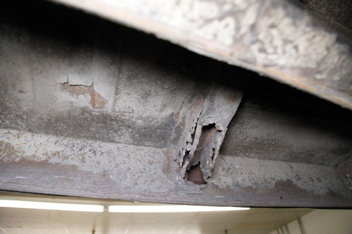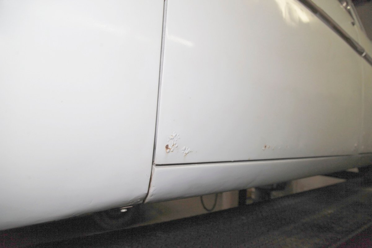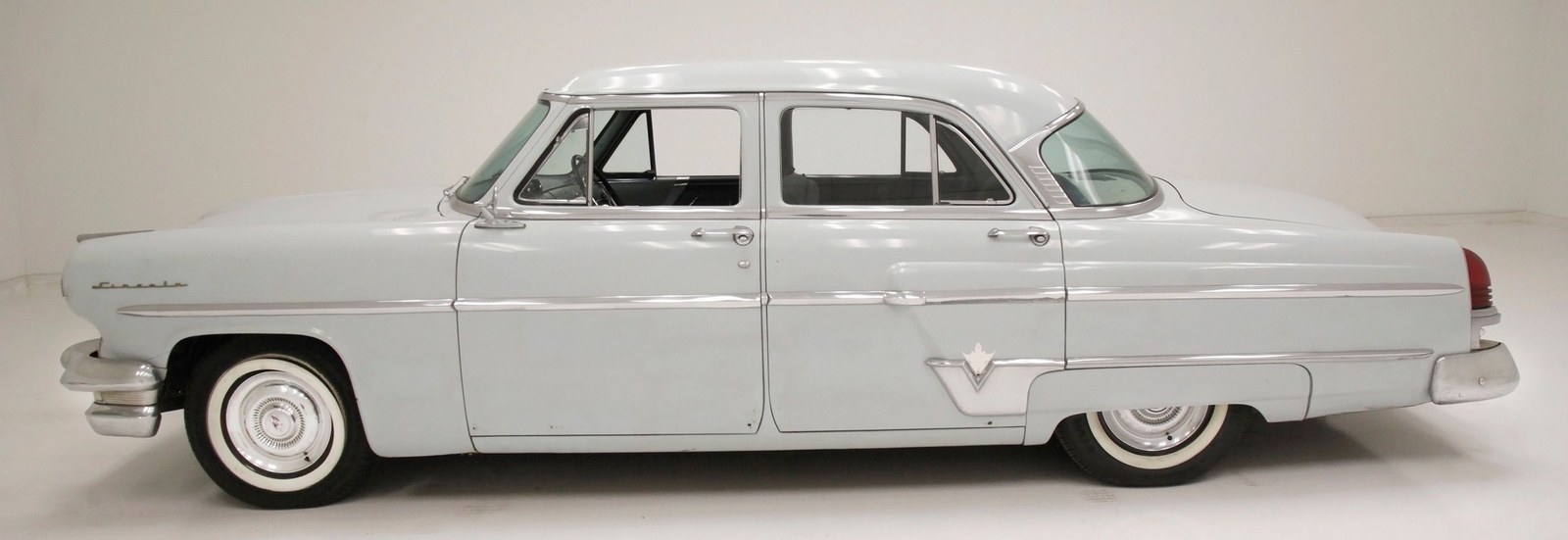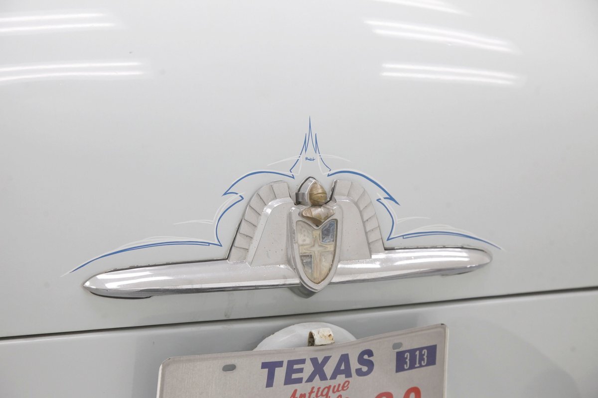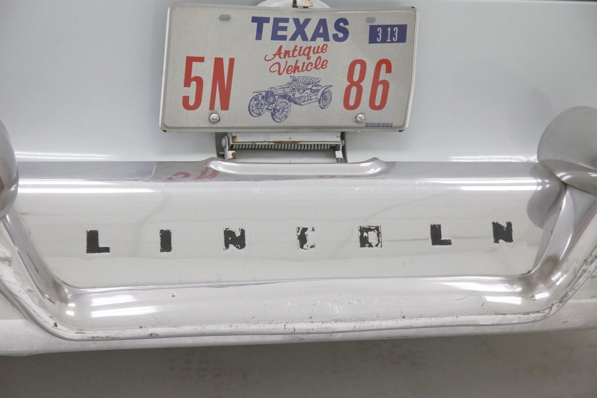Leading the way is an imposing dual tier chrome front bumper. Vertical struts with mini dagmar toppers point forward and the bumper and even the marker lenses wrap around the sides. The hood cascaded downward and has a large chrome V and partially missing Lincoln crest that edges the front of the hood. Simple single headlights grace the front of each quarter and the long lean hood gracefully makes its way back to approach the beginnings of a wrap-around windshield. All glass has thick chromed surrounds and this continues for the side and rear glass, simulating the bubble windows yet to come. On either side is a large trim spear running the length, and on the back are fender skirts with some stainless trimmings to simulate motion in static form. On back, a large rear bumper cradles the chrome trimmed cathedral style taillights and small chrome dagmars are on just above. All bathed in Wellington Gray with straight steel, but showing several areas of rust bubbling on the sides near the rockers, evidence of filler on the rockers, and chip offs throughout. Rounding out our exterior tour are 15-inch steel wheels with standard Lincoln covers and slightly askew porta-walls.