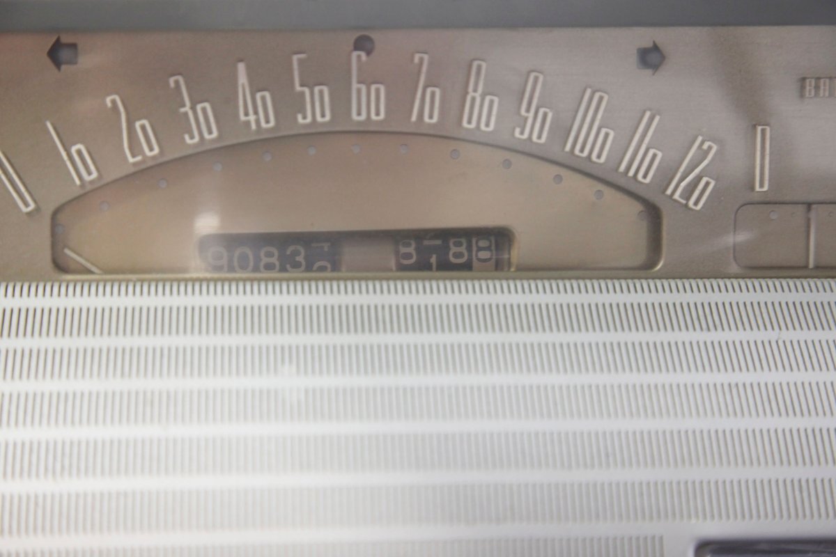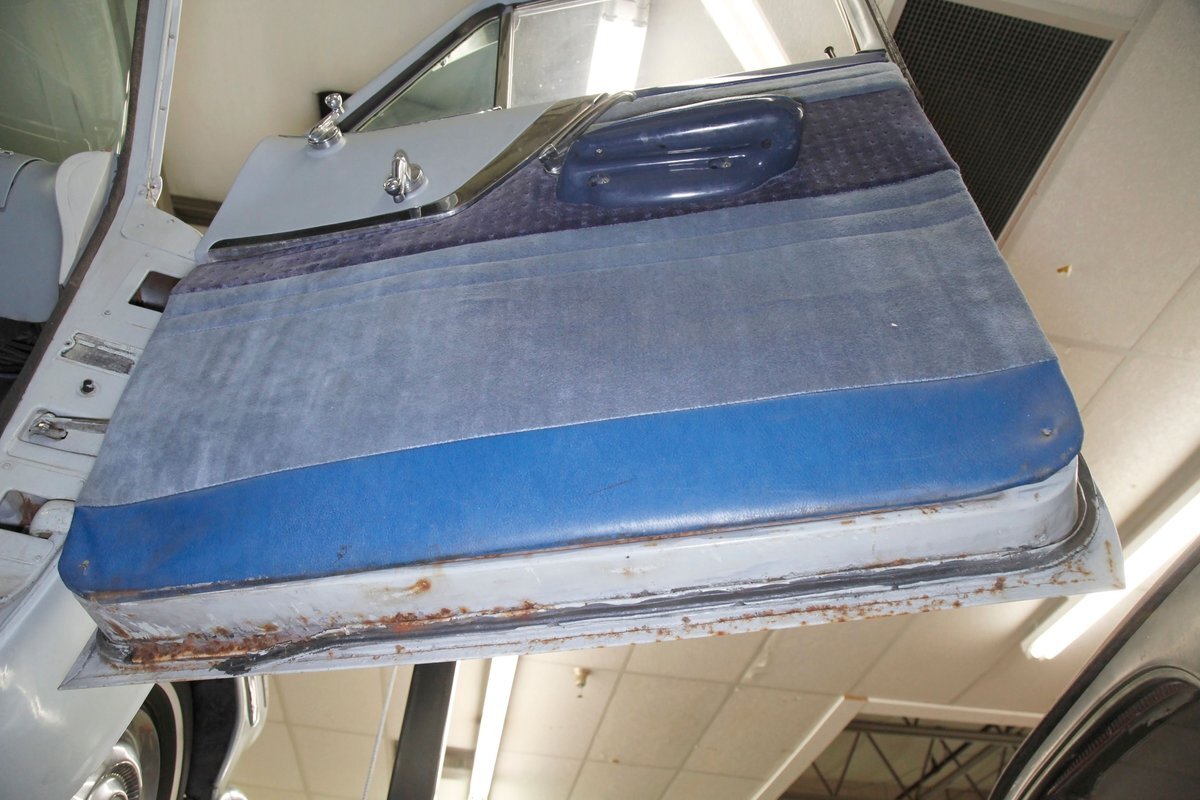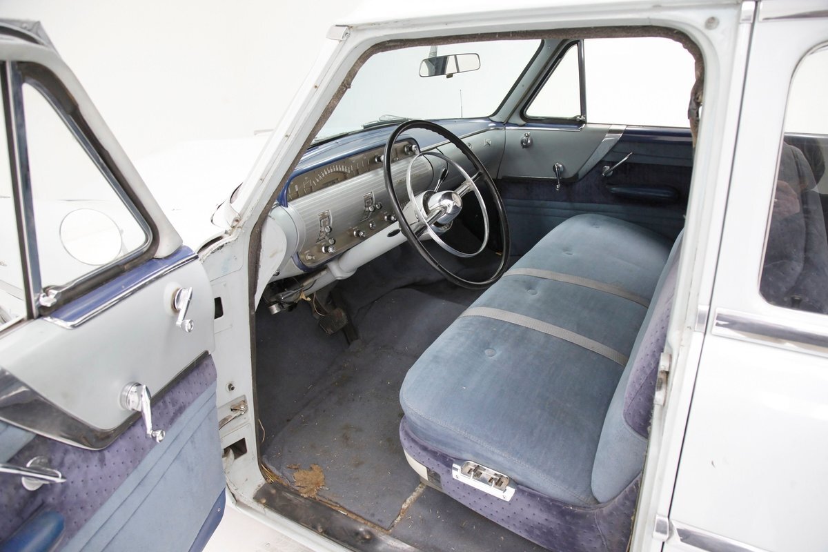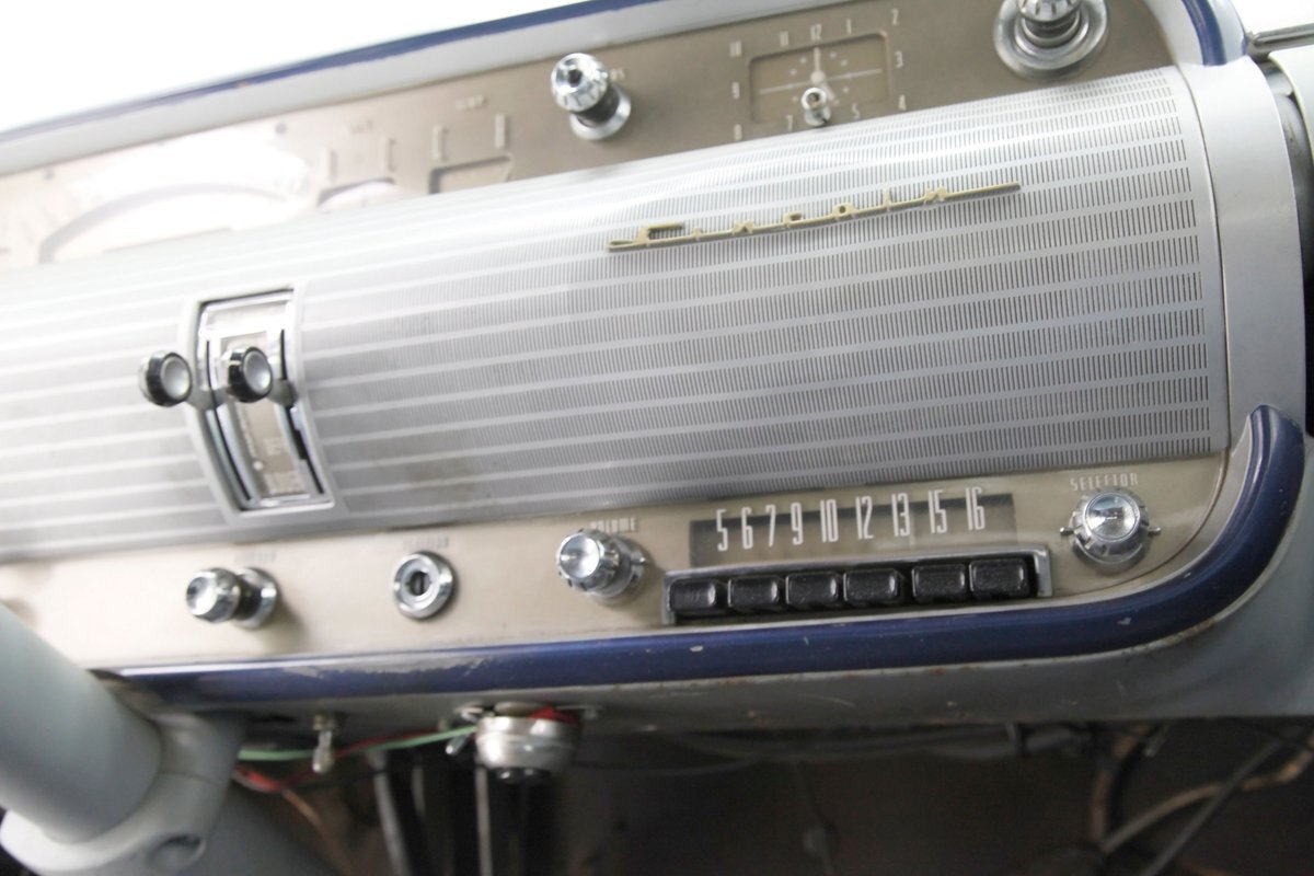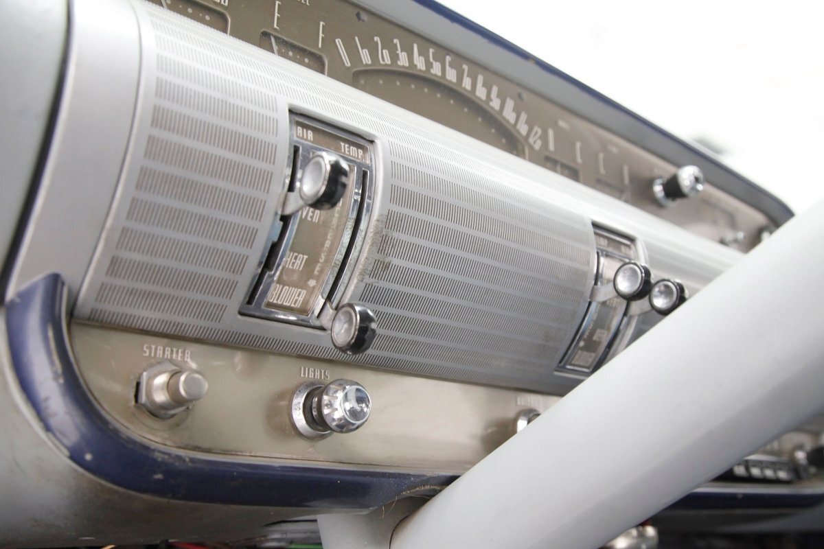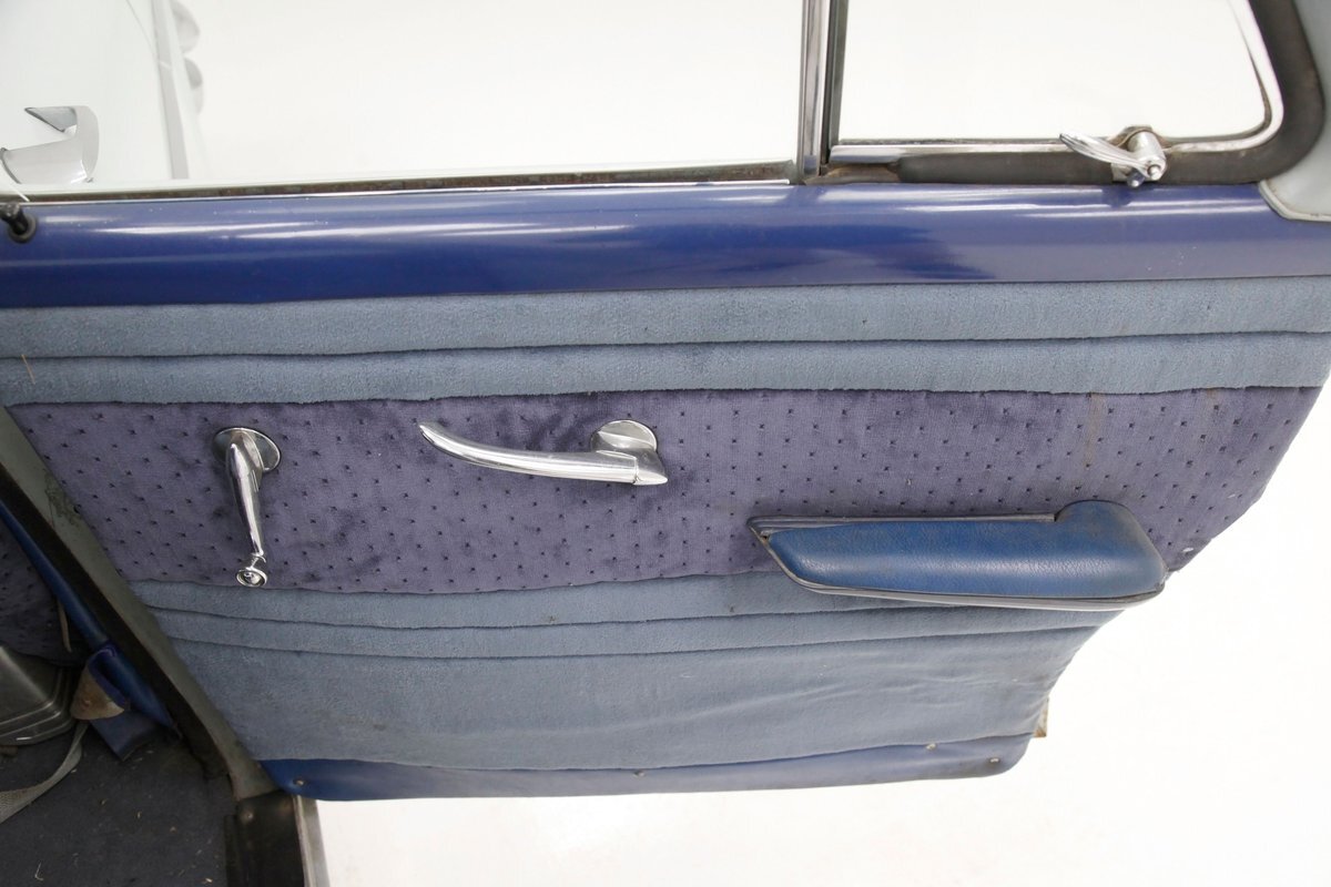 A swing of the doors allows us to view the foursome of color and materials making up the panels These also sport swoop spear shaped chrome trim for an accent, as well as shiny cranks and actuators, a blue painted steel sill, gray painted inserts, and a varying hue and textured broadcloth in blue. Inside on the sprawling benches are nicely done light blue broadcloth lower cushions that work their way half up the backs before changing over to a darker blue perforated cloth. A wide rear bench awaits the passengers, and it is beautifully preserved in the same pattern as the front bench, but holds a central fold down armrest. A full metal dash painted gray and blue has a single eyebrow bump up in front of the driver. Here we note the gold tinted gauge cluster which is nice and clean along with the heater slides, a few knobs and pulls and the factory AM radio. An original black steering wheel with nice chromed horn rings and center is fronting the futuristic dash. Blue carpeting, soiled and wrinkled, floods the floors and a lightly soiled blue/gray headliner hangs above.