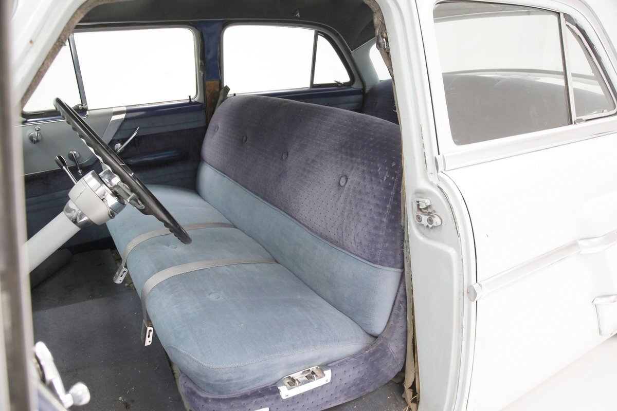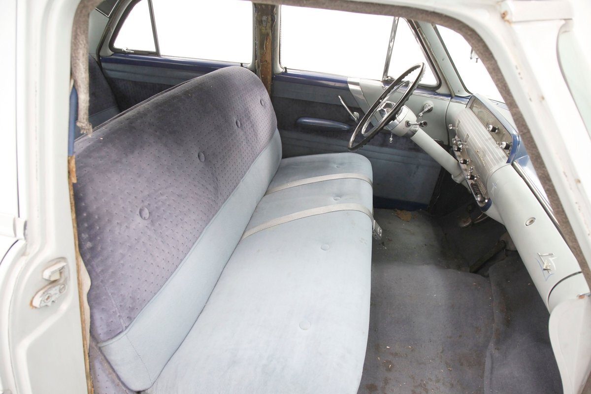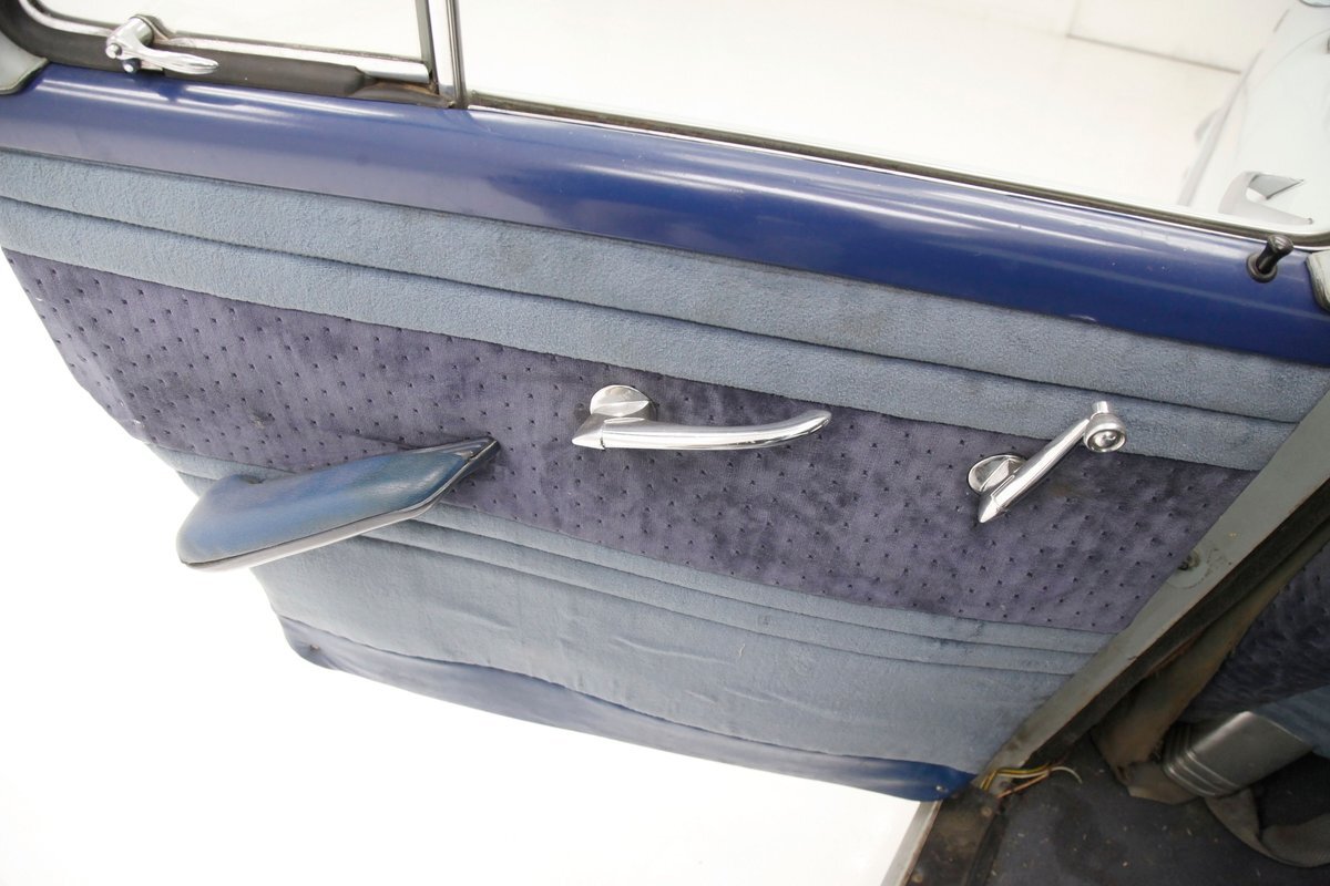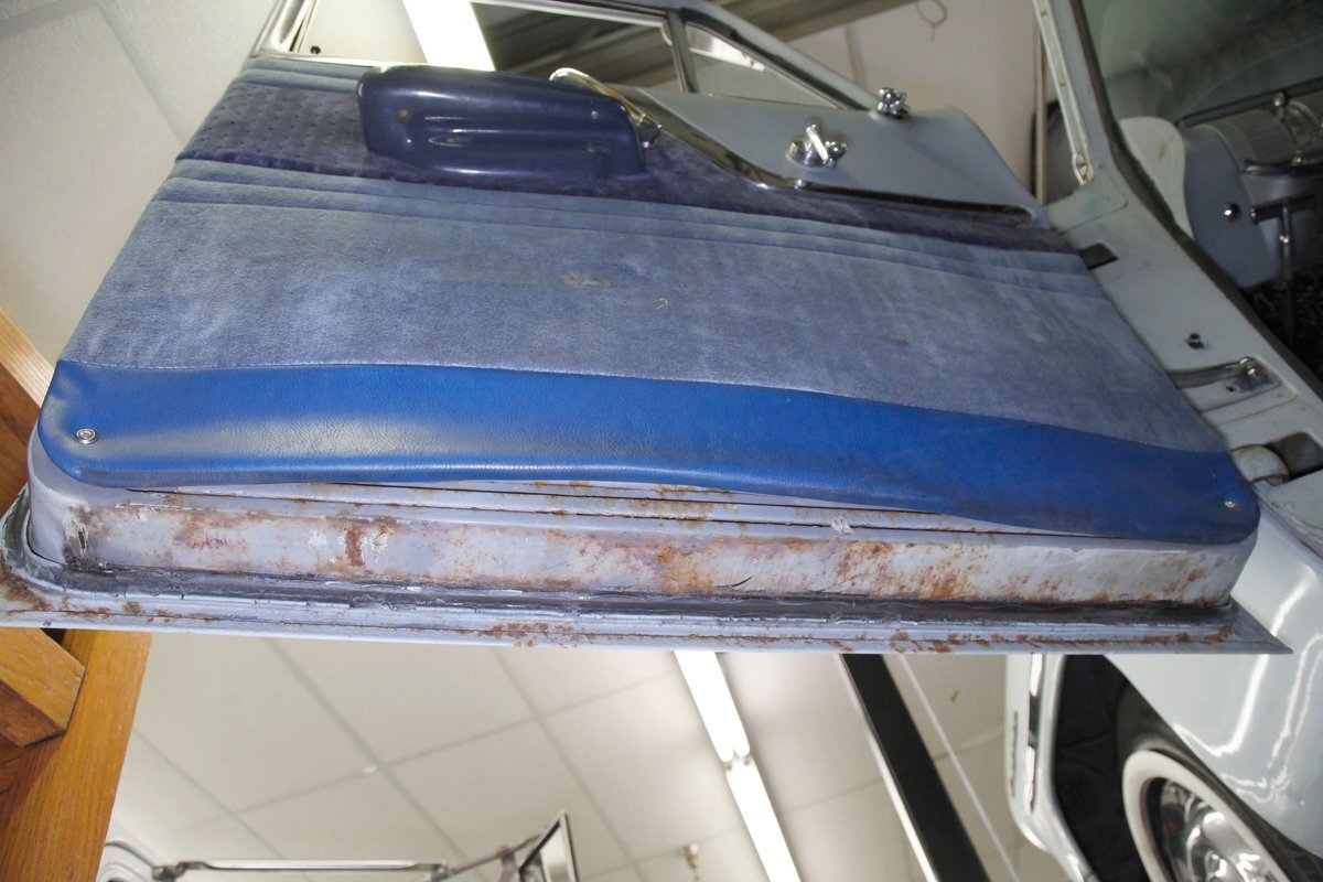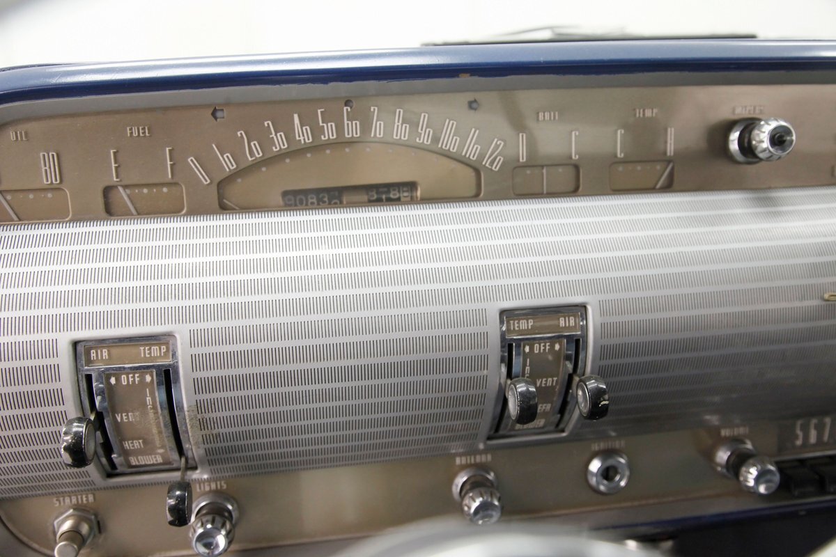 A swing of the doors allows us to view the foursome of color and materials making up the panels These also sport swoop spear shaped chrome trim for an accent, as well as shiny cranks and actuators, a blue painted steel sill, gray painted inserts, and a varying hue and textured broadcloth in blue. Inside on the sprawling benches are nicely done light blue broadcloth lower cushions that work their way half up the backs before changing over to a darker blue perforated cloth. A wide rear bench awaits the passengers, and it is beautifully preserved in the same pattern as the front bench, but holds a central fold down armrest. A full metal dash painted gray and blue has a single eyebrow bump up in front of the driver. Here we note the gold tinted gauge cluster which is nice and clean along with the heater slides, a few knobs and pulls and the factory AM radio. An original black steering wheel with nice chromed horn rings and center is fronting the futuristic dash. Blue carpeting, soiled and wrinkled, floods the floors and a lightly soiled blue/gray headliner hangs above.