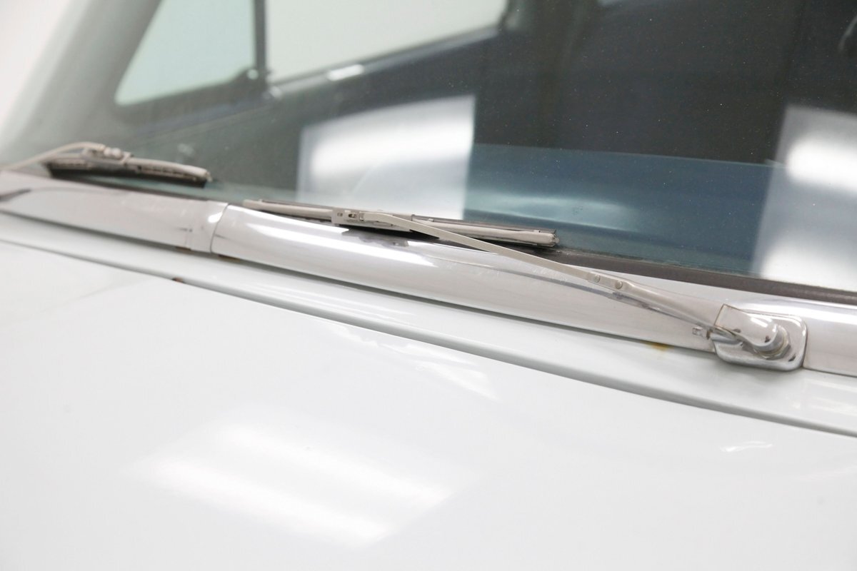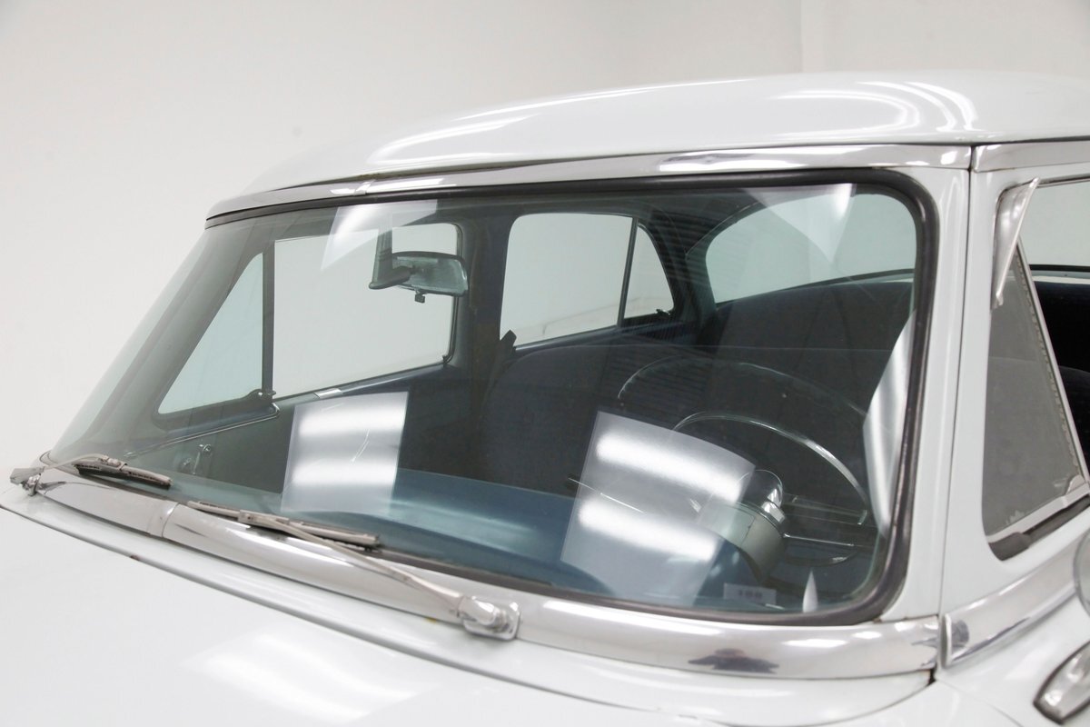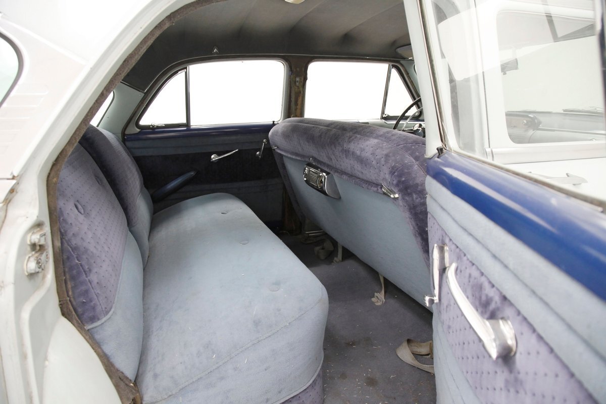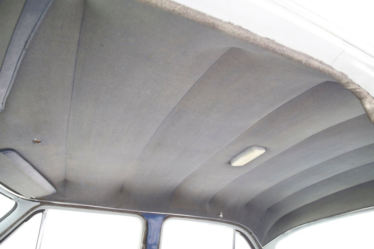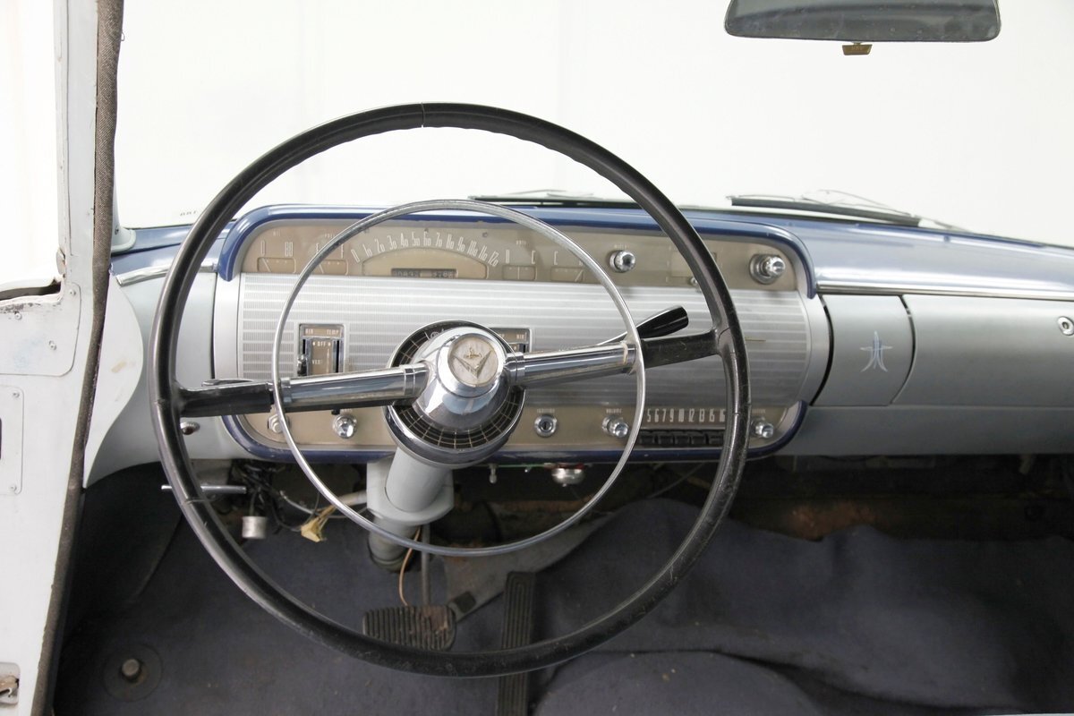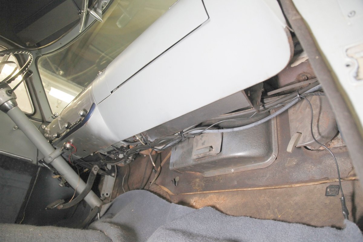 A swing of the doors allows us to view the foursome of color and materials making up the panels These also sport swoop spear shaped chrome trim for an accent, as well as shiny cranks and actuators, a blue painted steel sill, gray painted inserts, and a varying hue and textured broadcloth in blue. Inside on the sprawling benches are nicely done light blue broadcloth lower cushions that work their way half up the backs before changing over to a darker blue perforated cloth. A wide rear bench awaits the passengers, and it is beautifully preserved in the same pattern as the front bench, but holds a central fold down armrest. A full metal dash painted gray and blue has a single eyebrow bump up in front of the driver. Here we note the gold tinted gauge cluster which is nice and clean along with the heater slides, a few knobs and pulls and the factory AM radio. An original black steering wheel with nice chromed horn rings and center is fronting the futuristic dash. Blue carpeting, soiled and wrinkled, floods the floors and a lightly soiled blue/gray headliner hangs above.