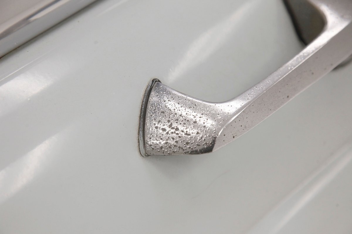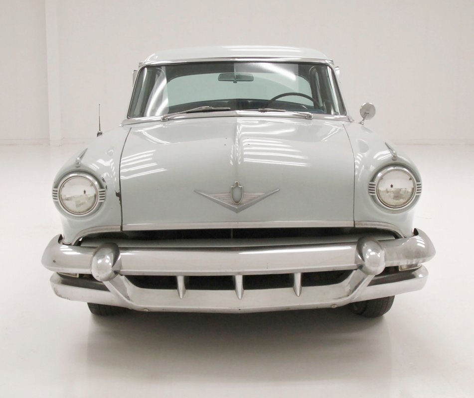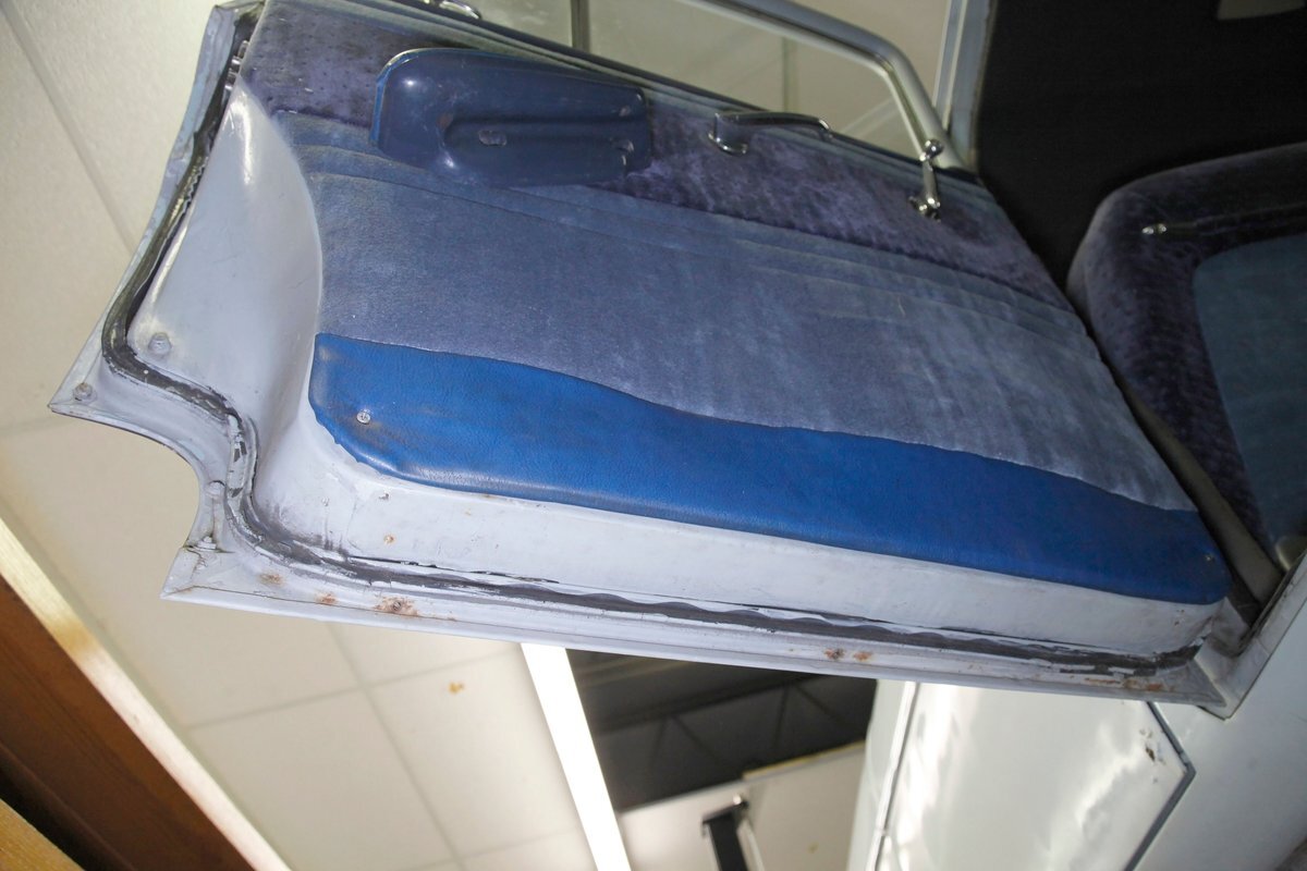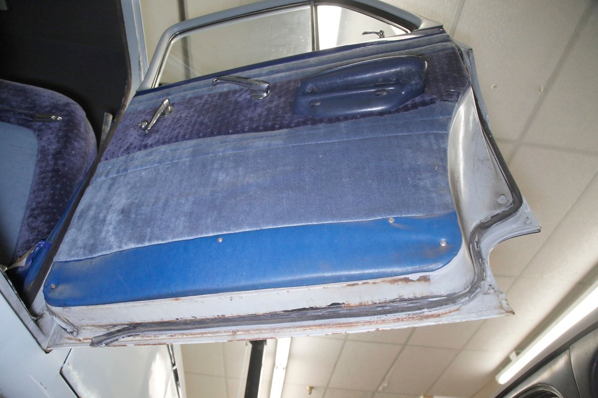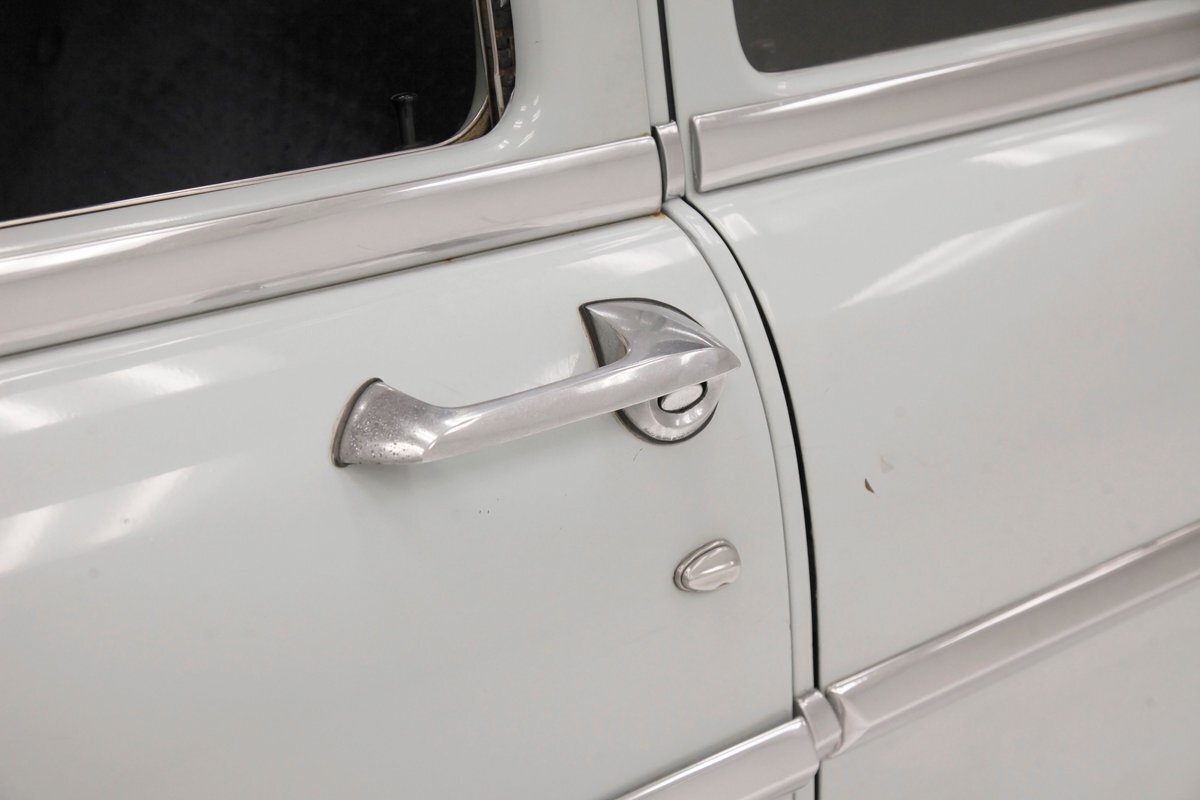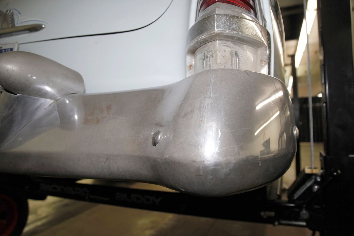 A swing of the doors allows us to view the foursome of color and materials making up the panels These also sport swoop spear shaped chrome trim for an accent, as well as shiny cranks and actuators, a blue painted steel sill, gray painted inserts, and a varying hue and textured broadcloth in blue. Inside on the sprawling benches are nicely done light blue broadcloth lower cushions that work their way half up the backs before changing over to a darker blue perforated cloth. A wide rear bench awaits the passengers, and it is beautifully preserved in the same pattern as the front bench, but holds a central fold down armrest. A full metal dash painted gray and blue has a single eyebrow bump up in front of the driver. Here we note the gold tinted gauge cluster which is nice and clean along with the heater slides, a few knobs and pulls and the factory AM radio. An original black steering wheel with nice chromed horn rings and center is fronting the futuristic dash. Blue carpeting, soiled and wrinkled, floods the floors and a lightly soiled blue/gray headliner hangs above.