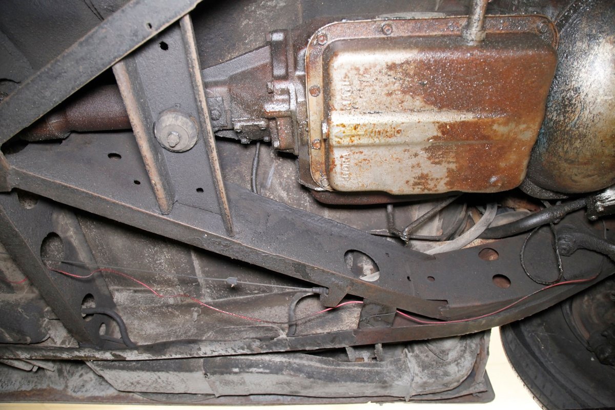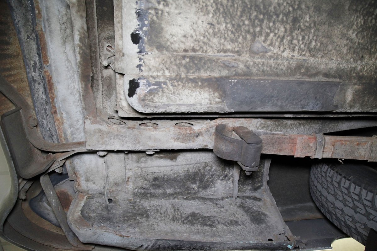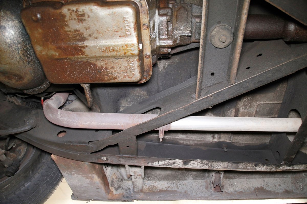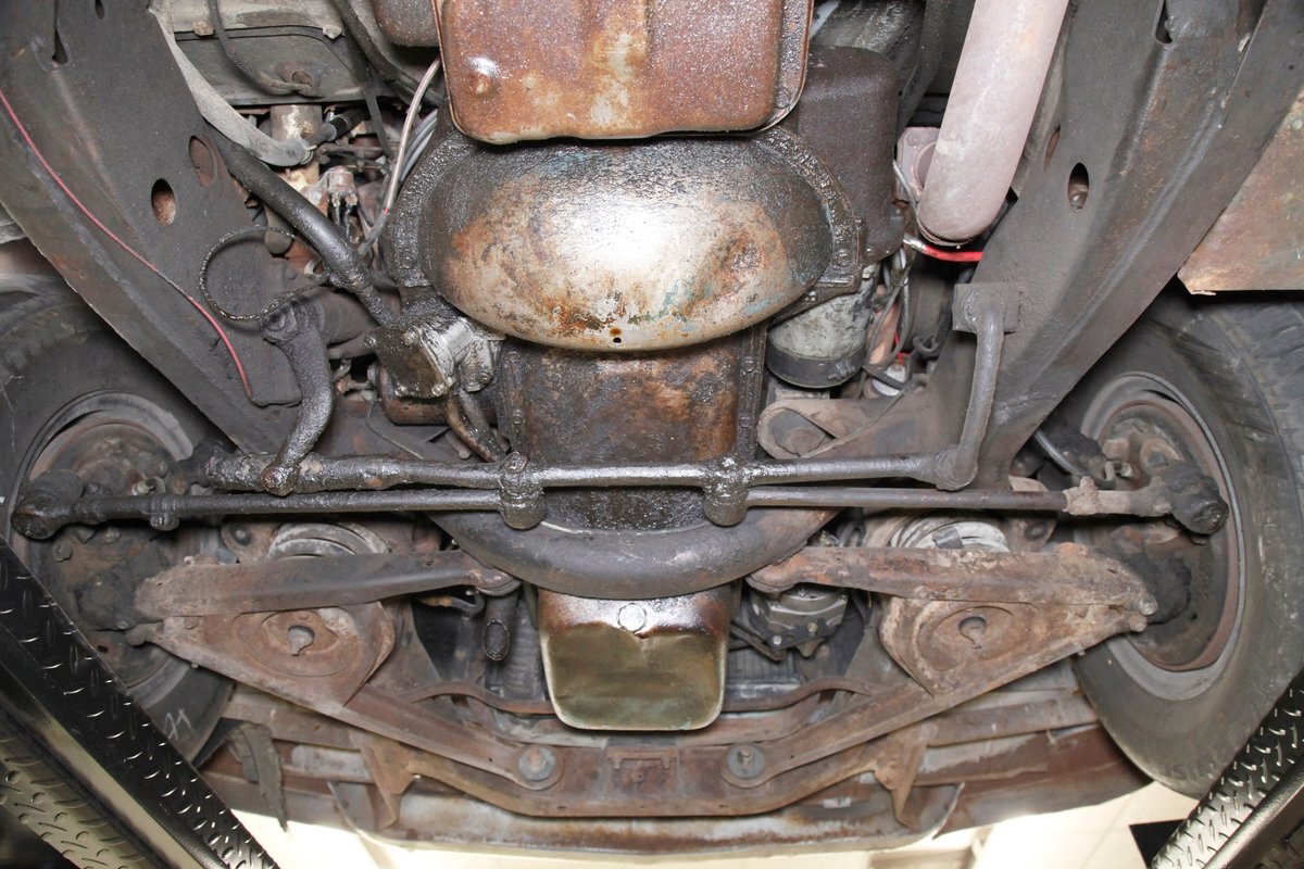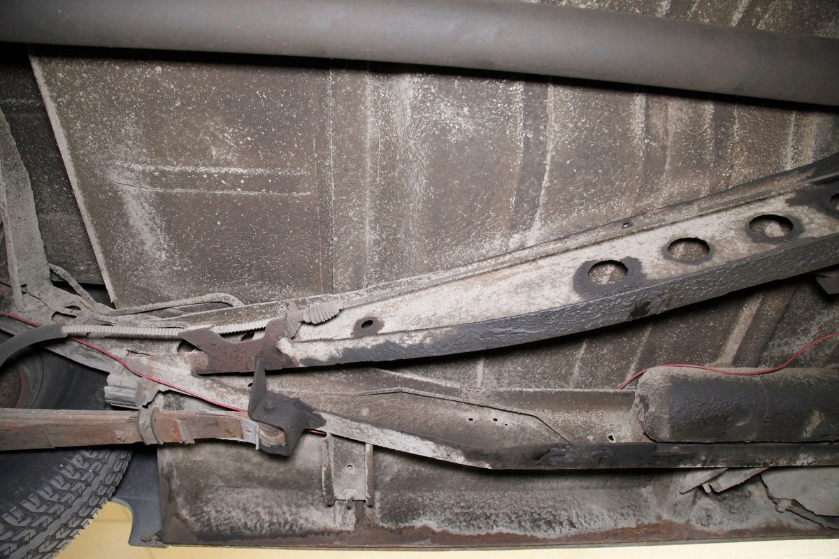 Solid steel framing and floor pans underneath have a nice coating of factory undercoating. Single stock style exhaust snakes its way rearward, past independent coil springs upfront and to the rear leaf springs. Drum brakes are on all 4 corners. It is mostly rust free with the majority of the flaws being patina and surface rust on the usual suspects.