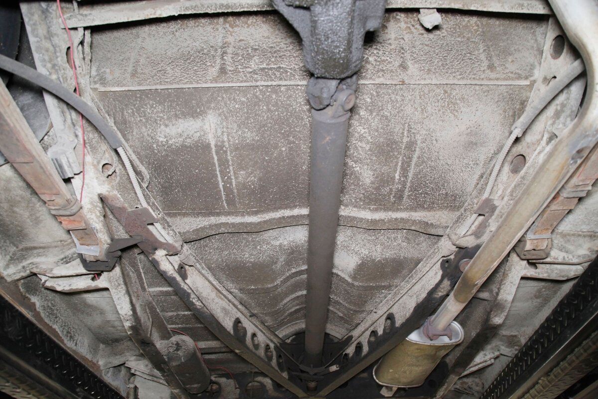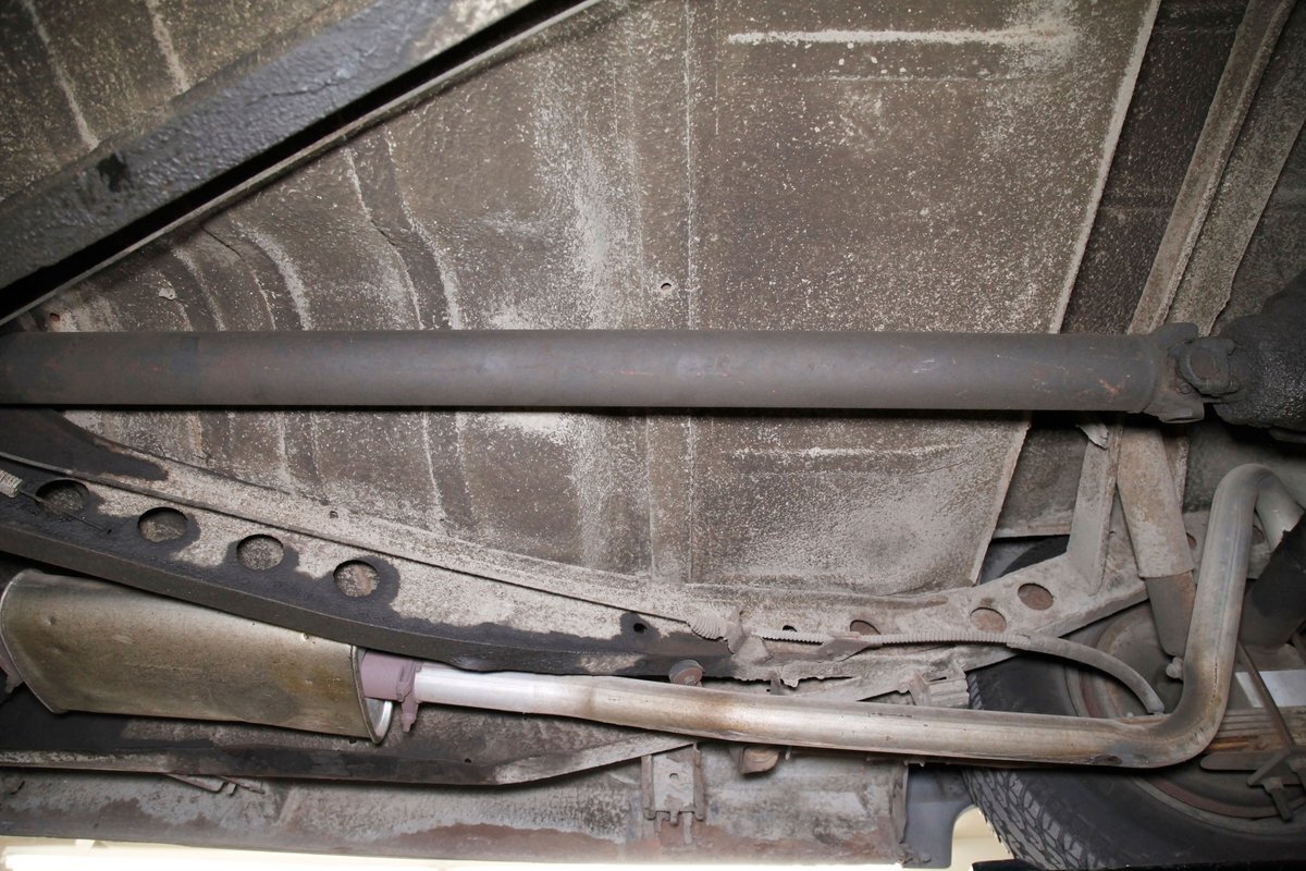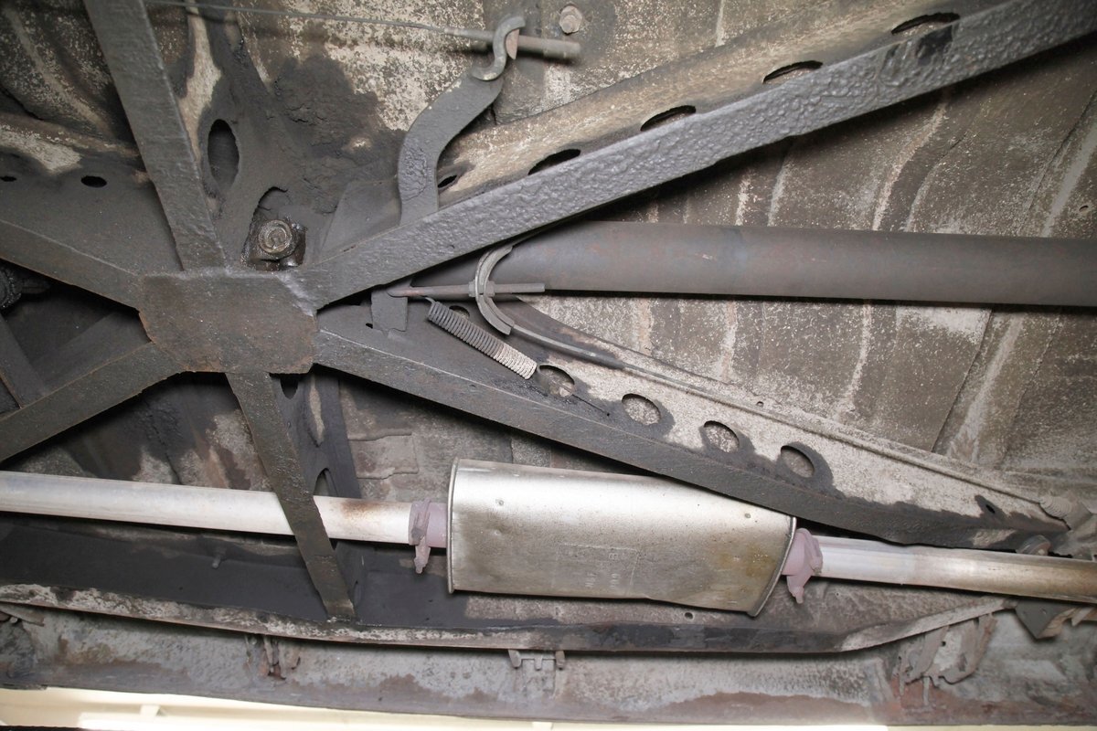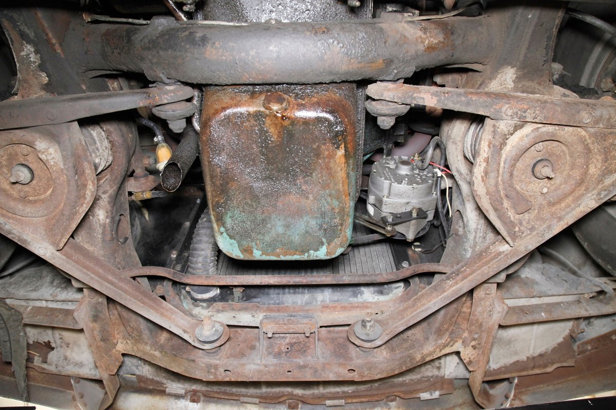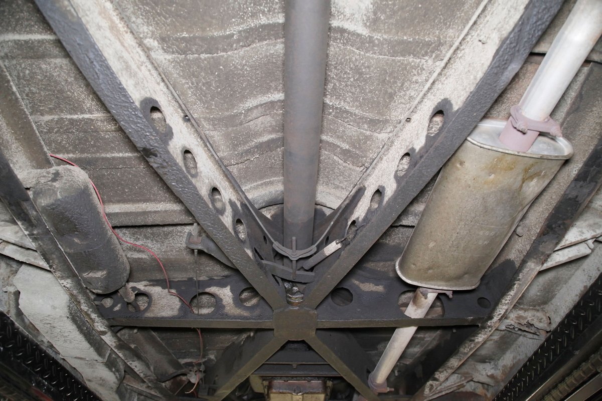 Solid steel framing and floor pans underneath have a nice coating of factory undercoating. Single stock style exhaust snakes its way rearward, past independent coil springs upfront and to the rear leaf springs. Drum brakes are on all 4 corners. It is mostly rust free with the majority of the flaws being patina and surface rust on the usual suspects.