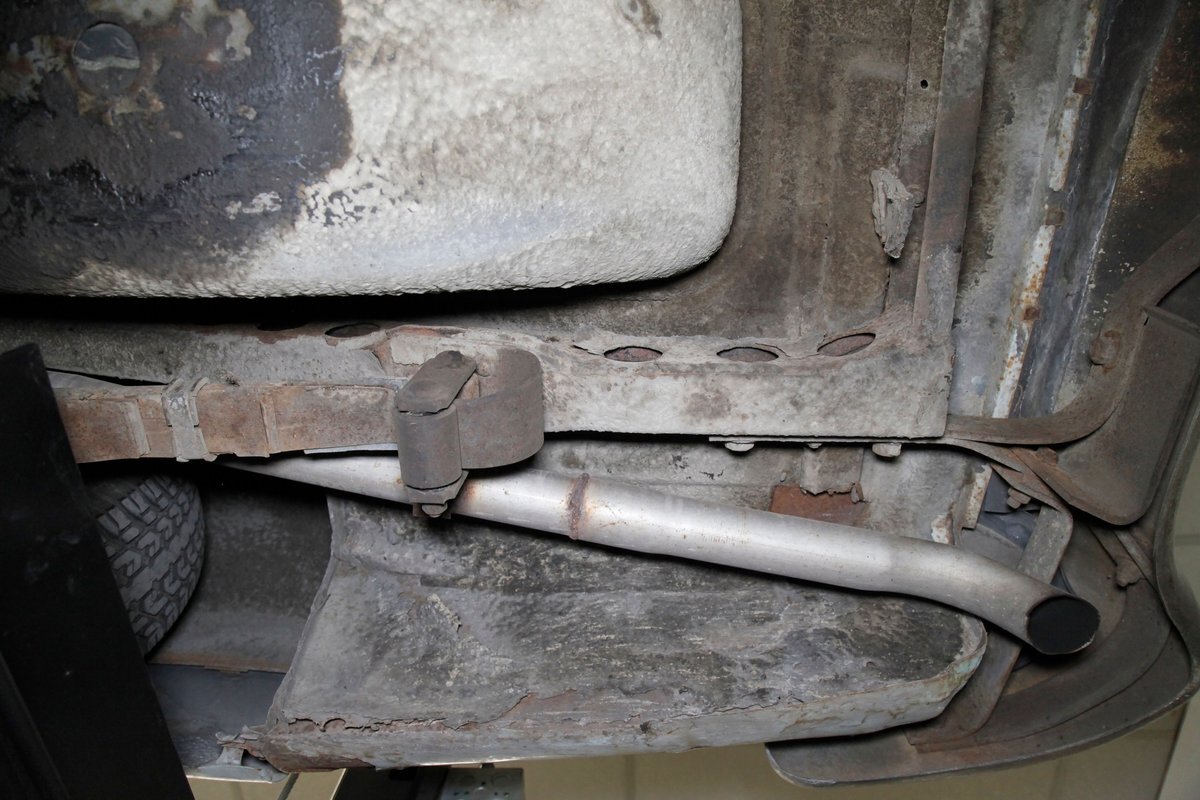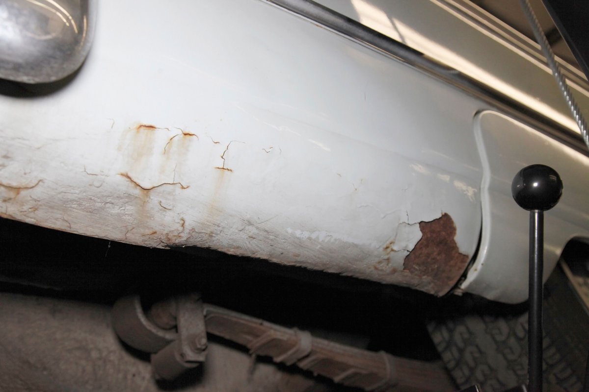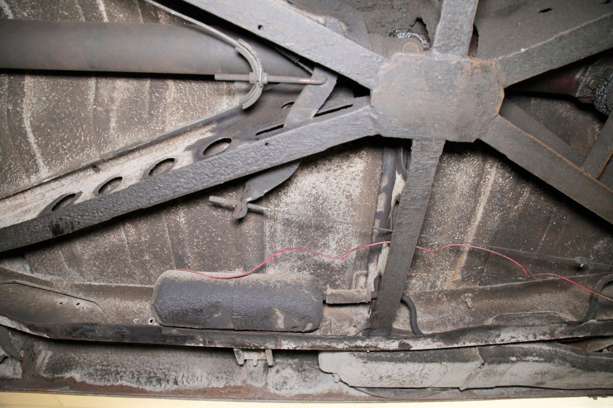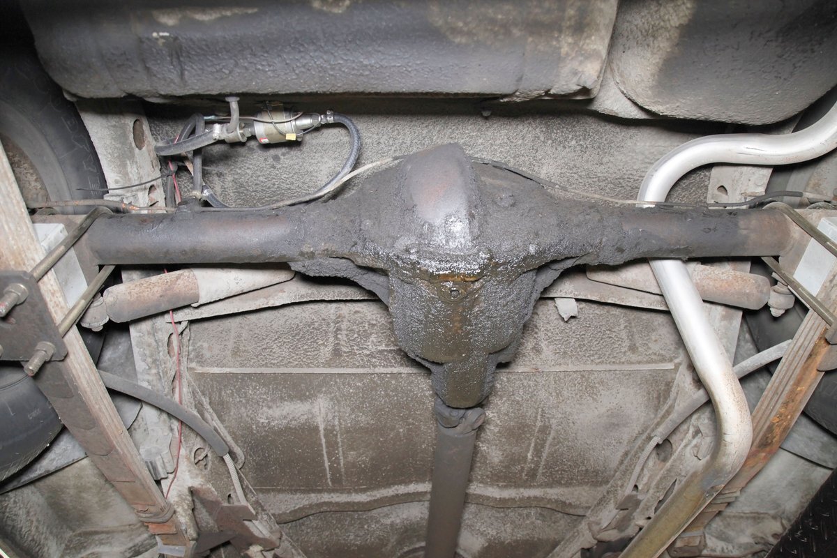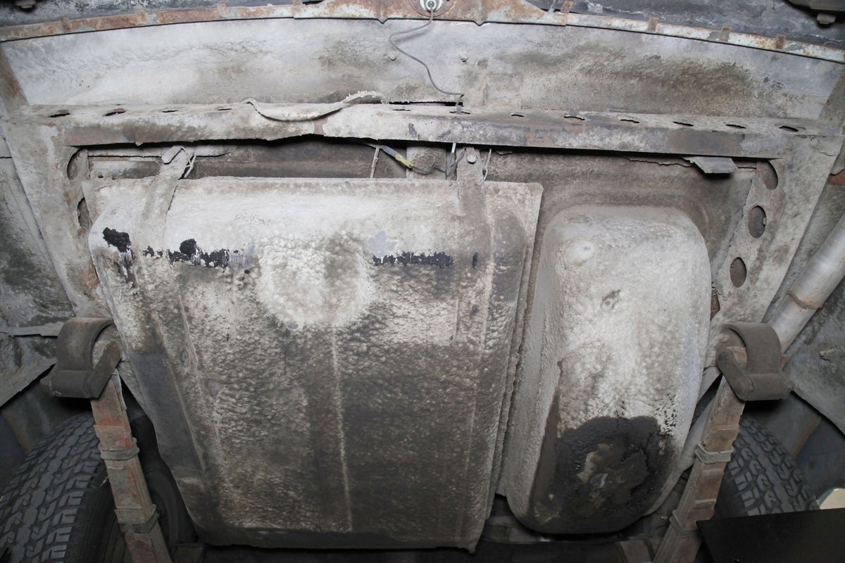 Solid steel framing and floor pans underneath have a nice coating of factory undercoating. Single stock style exhaust snakes its way rearward, past independent coil springs upfront and to the rear leaf springs. Drum brakes are on all 4 corners. It is mostly rust free with the majority of the flaws being patina and surface rust on the usual suspects.