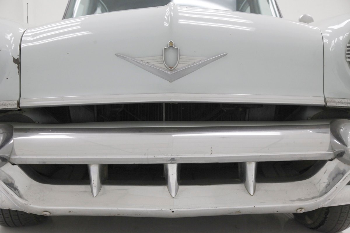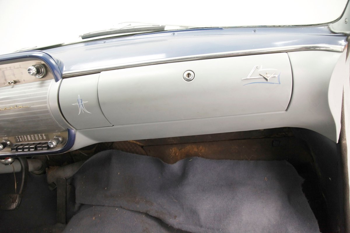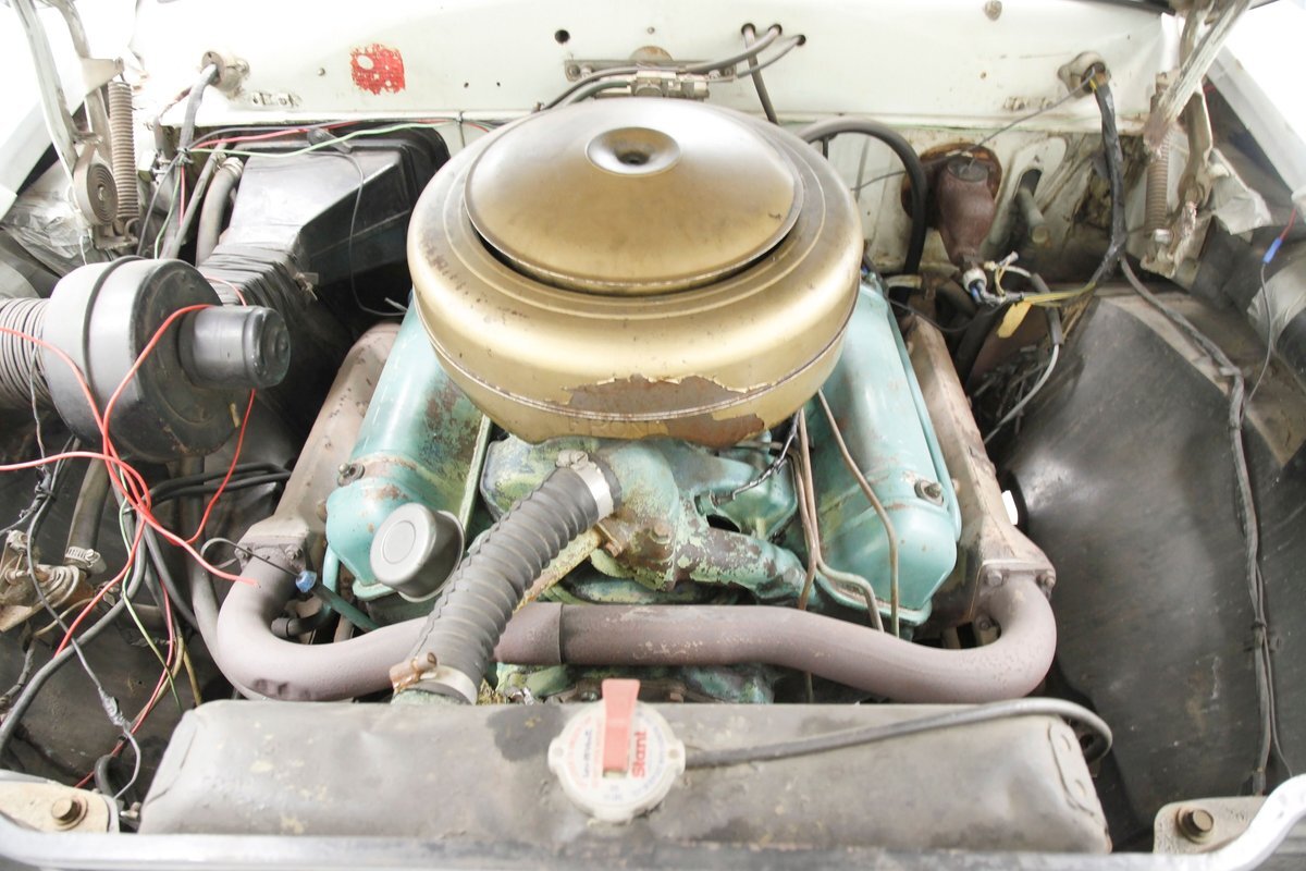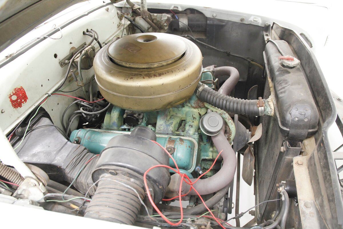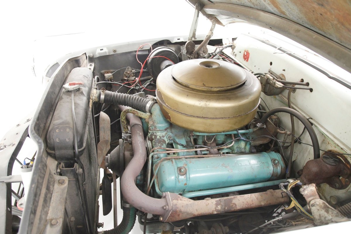 Under the hood in a patina presenting engine bay is an aquamarine painted Y block V8 in 317.5ci displacement. It is topped with a gold air cleaner assembly covering the factory 4-barrel carburetor. An engine cross over exhaust feeds down to join into a single pipe providing the exhale. On the back of this aqua Y block is a Hydramatic 4-speed automatic transmission. The rear axle on this car is a 3.31 ratio.
