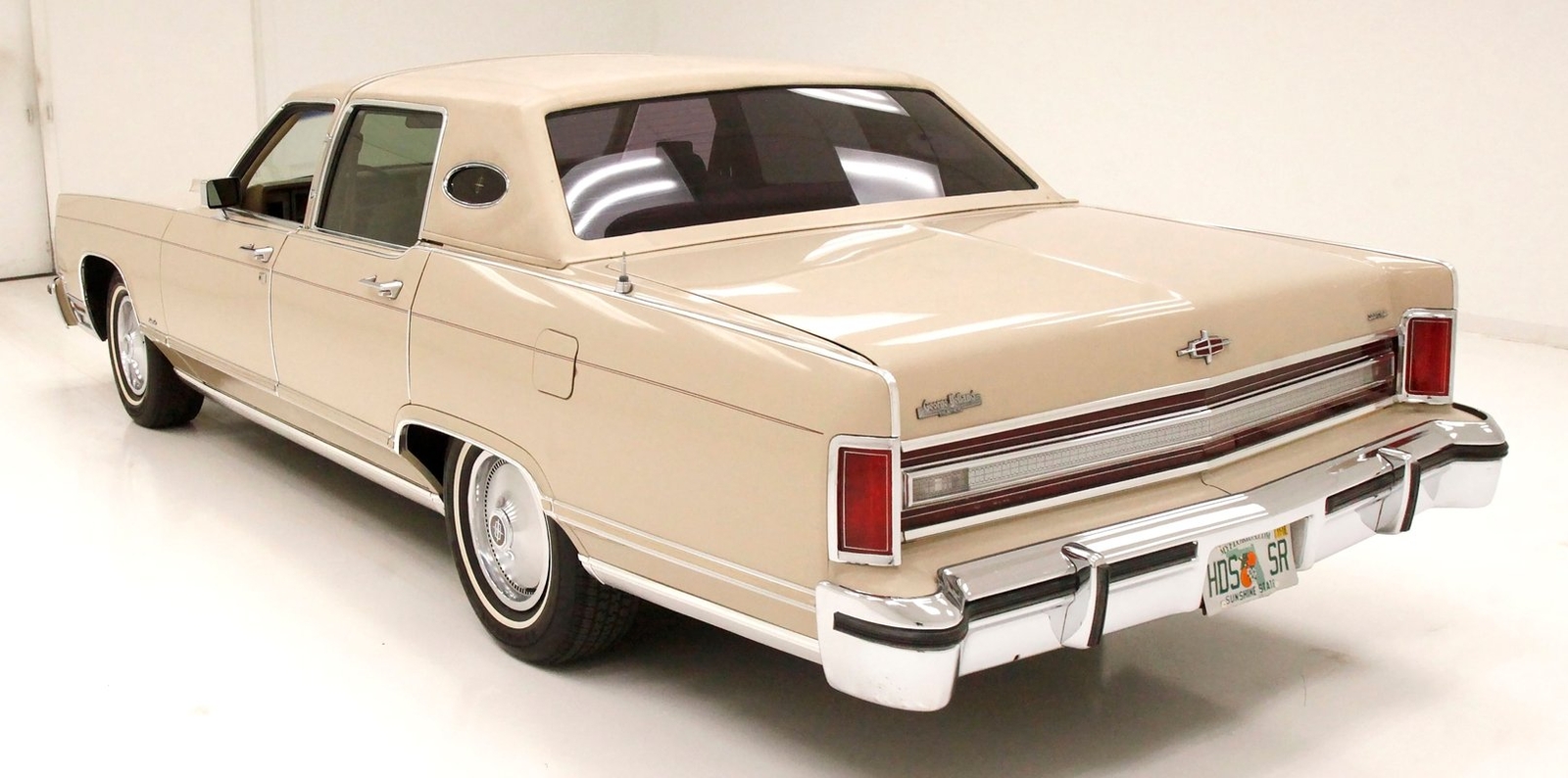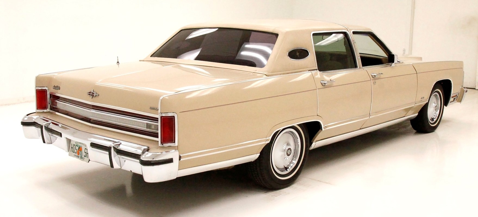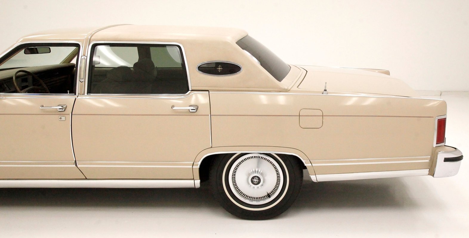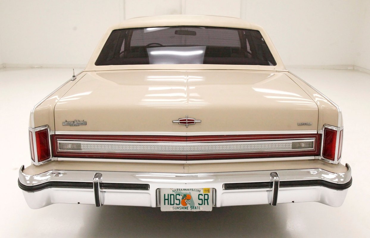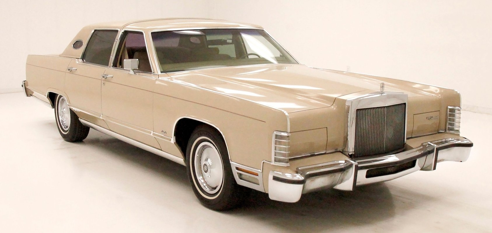 Dressed up to the nines this square and rectangle gentleman wears a sport coat in Light Chamois and lots of trimmings in near perfect chrome. With barely a ding on its straight steel large panels, and fastidiously minded gaps, you have arrived. The big square front chromed grille and old fashion styled radiator surround topped with the Lincoln star and flanked by hidden headlights, corner signal lights wrapped in horizontal ribbings, and a massive mirror-like bumper below, this is only the beginning. Moving back, we can take a drive on the large hood and front quarters which have below the belt line trim in chrome and beige vinyl, along with some running lights, wheel well trim surrounds and a brown dual pinstripes. This drops us off at the front doors, straight and true, more below the belt line trim, pinstripe and now rocker trim moving rearward to two more doors. This rear set of doors backs up to the rear quarter, and the 2 bedroom apartment sized trunk with a single cathedral styled rear taillight on each corner. Another big pristine bumper, and some rear panel trimmings and a horizontal reflector is way back, and up top a padded vinyl landau styled top for the rear passenger area roof. This sports tinted glass on the sides and rear, an opera light on the B pillar and an oval opera window in the C pillar. Standard Lincoln wheel covers in their full splendor cover all 4 corners, and now you too can be the escort to the Belle-of-the-ball.