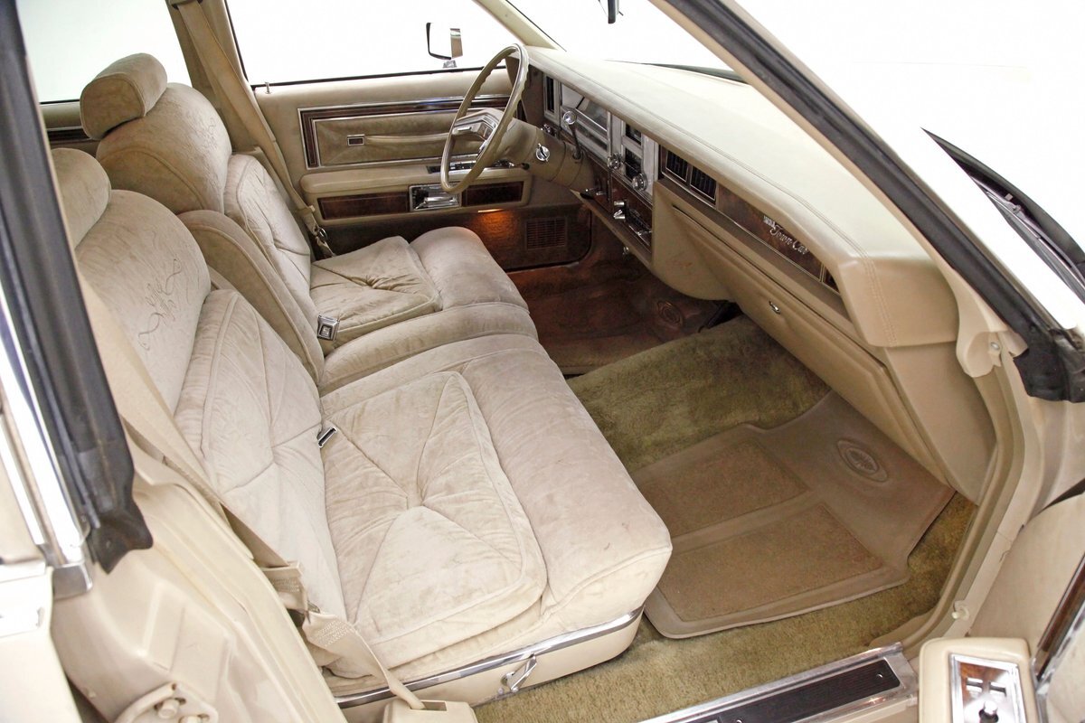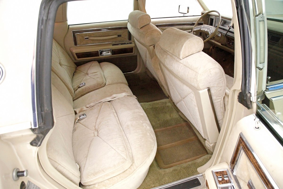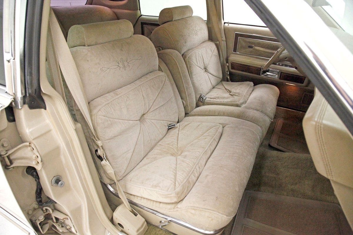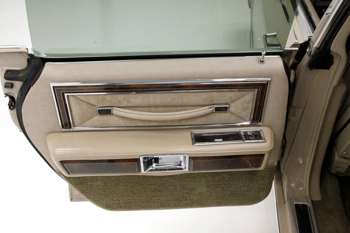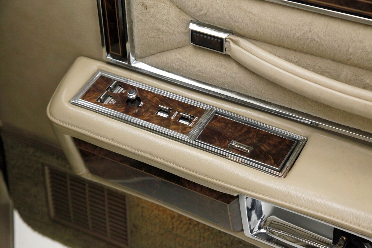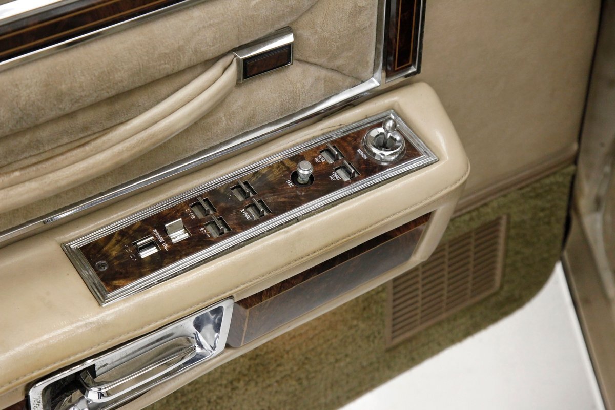 A fine mix of tufted crushed velour, tan smooth vinyl, wood applique trimmings and of course more chrome, more applique, and some tan carpet on the bottoms, and we have just opened the door. Here a plethora of toggles await your fingers to tickle and actuate the windows, locks, mirrors, and seats. Slipping inside on the driver's side I can view the long hood and it actually makes me feel important. I also feel comfort due to the pillowed, tufted, dual cushioned, buttoned crushed velour big daddy bucket seats dyed in wonderful tan. Massive armrests fold down, and I could nearly fall asleep, although there is not a TV to prompt me to do so...but I digress. Looking forward toward the original dash, plenty more wood applique in a fanned burl grain houses the instruments and knobs and switches. This plays with some more tan covered vinyl and a padded dashtop also in tan. Super clean would best describe this dash, which has a brushed aluminum speedometer located directly in front of the original steering wheel. Climate controls, power antenna, AM/FM/Cassette radio, and a Cartier clock, all are inserted for your pleasures while driving this land yacht. Wonderful fluffy tan carpet covers all floors front and rear, and a really nice tan headliner in tight vinyl is covering the inside of the roof. In back, an expanse of tan velour on an extra large bench seat with individual pillows and another central fold down armrest that lets the back passengers be in their own world as it goes by through the opera windows.