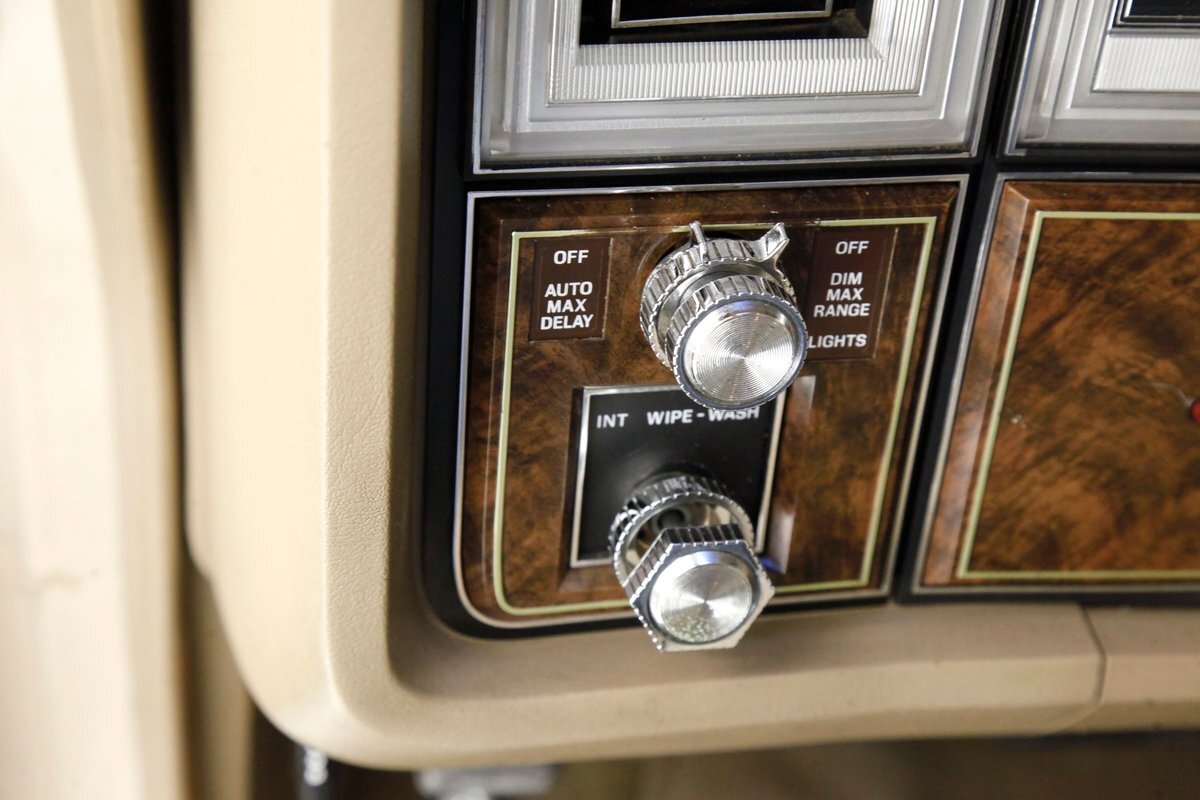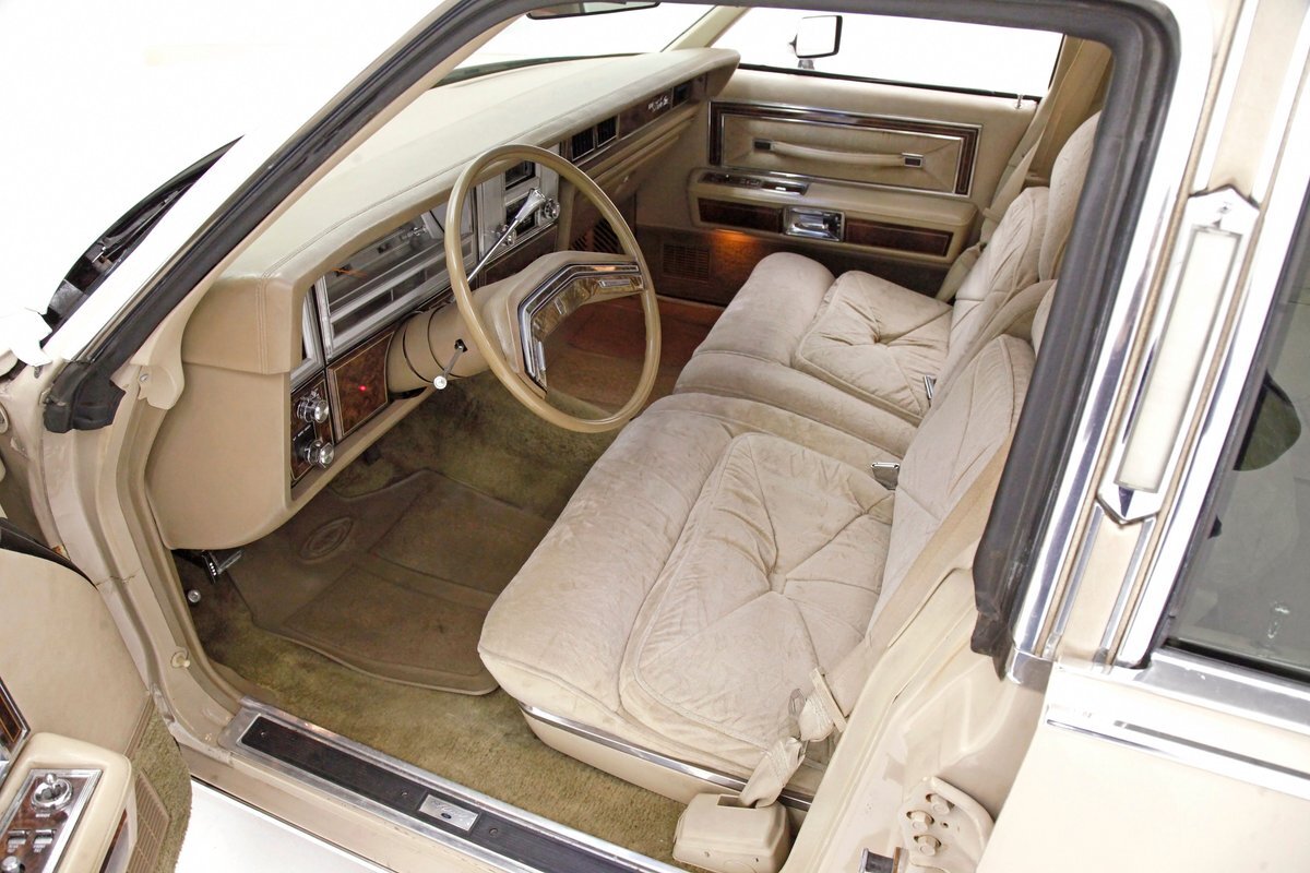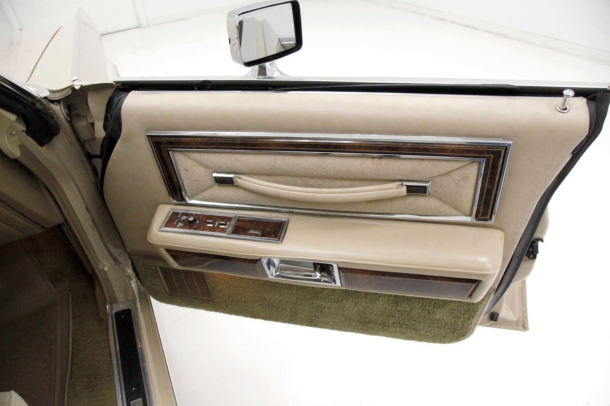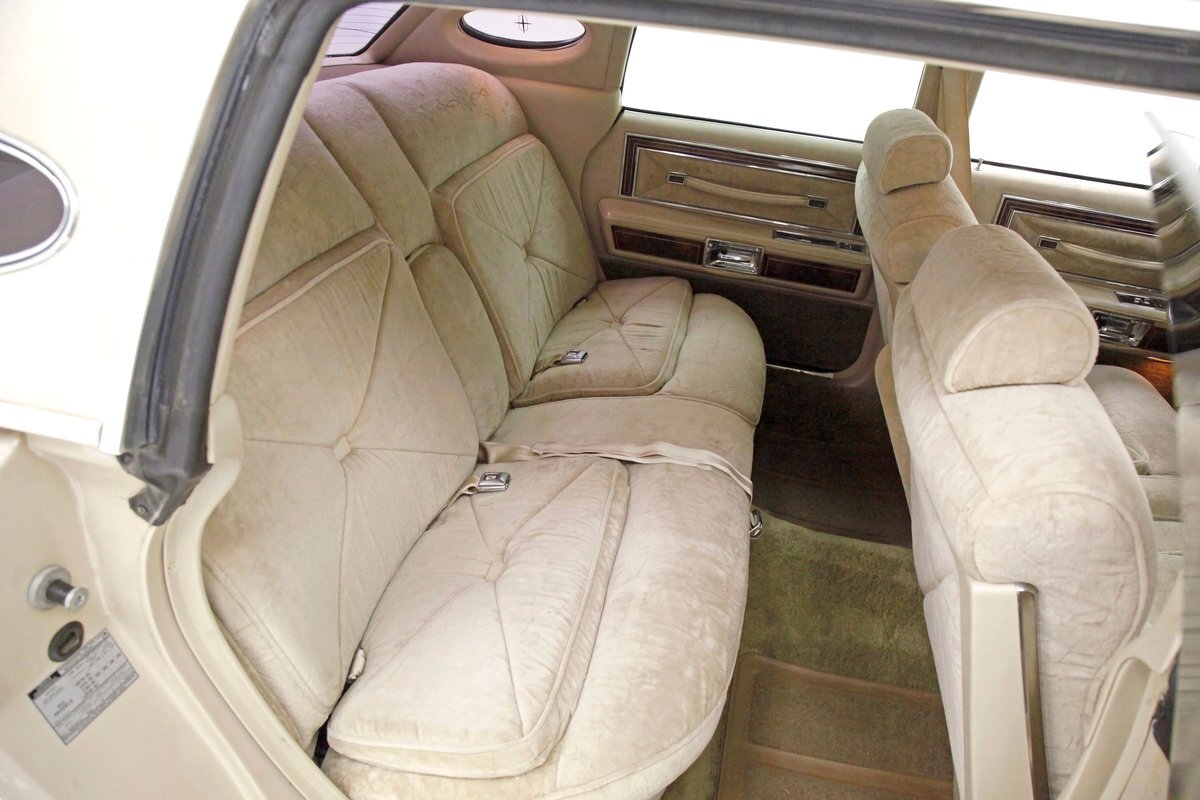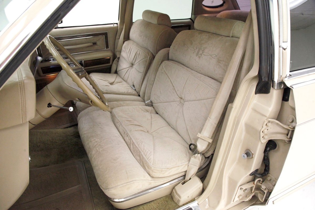 A fine mix of tufted crushed velour, tan smooth vinyl, wood applique trimmings and of course more chrome, more applique, and some tan carpet on the bottoms, and we have just opened the door. Here a plethora of toggles await your fingers to tickle and actuate the windows, locks, mirrors, and seats. Slipping inside on the driver's side I can view the long hood and it actually makes me feel important. I also feel comfort due to the pillowed, tufted, dual cushioned, buttoned crushed velour big daddy bucket seats dyed in wonderful tan. Massive armrests fold down, and I could nearly fall asleep, although there is not a TV to prompt me to do so...but I digress. Looking forward toward the original dash, plenty more wood applique in a fanned burl grain houses the instruments and knobs and switches. This plays with some more tan covered vinyl and a padded dashtop also in tan. Super clean would best describe this dash, which has a brushed aluminum speedometer located directly in front of the original steering wheel. Climate controls, power antenna, AM/FM/Cassette radio, and a Cartier clock, all are inserted for your pleasures while driving this land yacht. Wonderful fluffy tan carpet covers all floors front and rear, and a really nice tan headliner in tight vinyl is covering the inside of the roof. In back, an expanse of tan velour on an extra large bench seat with individual pillows and another central fold down armrest that lets the back passengers be in their own world as it goes by through the opera windows.