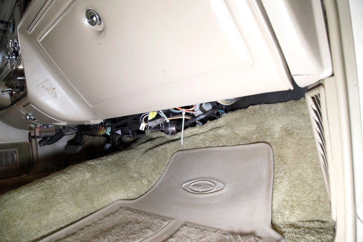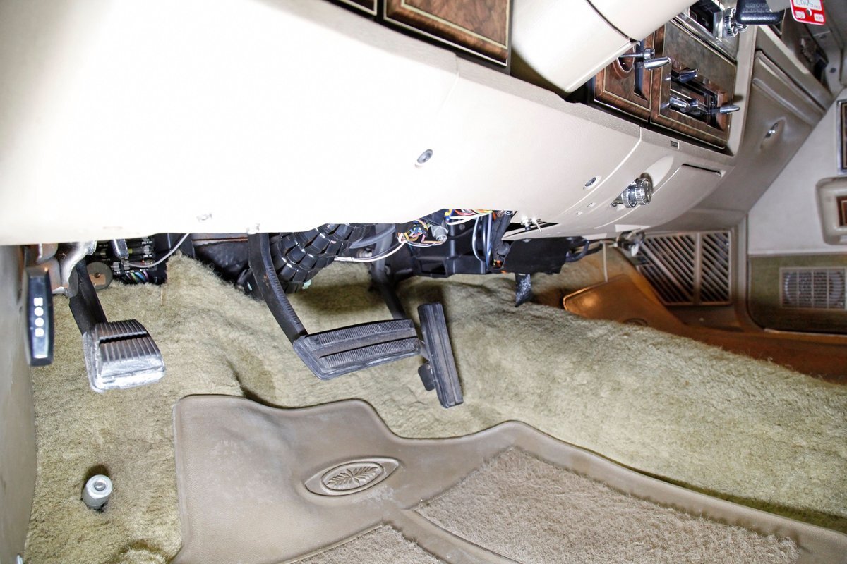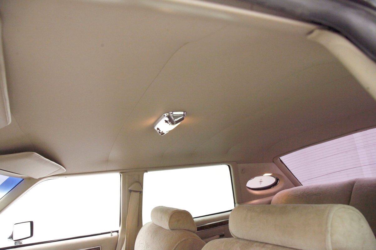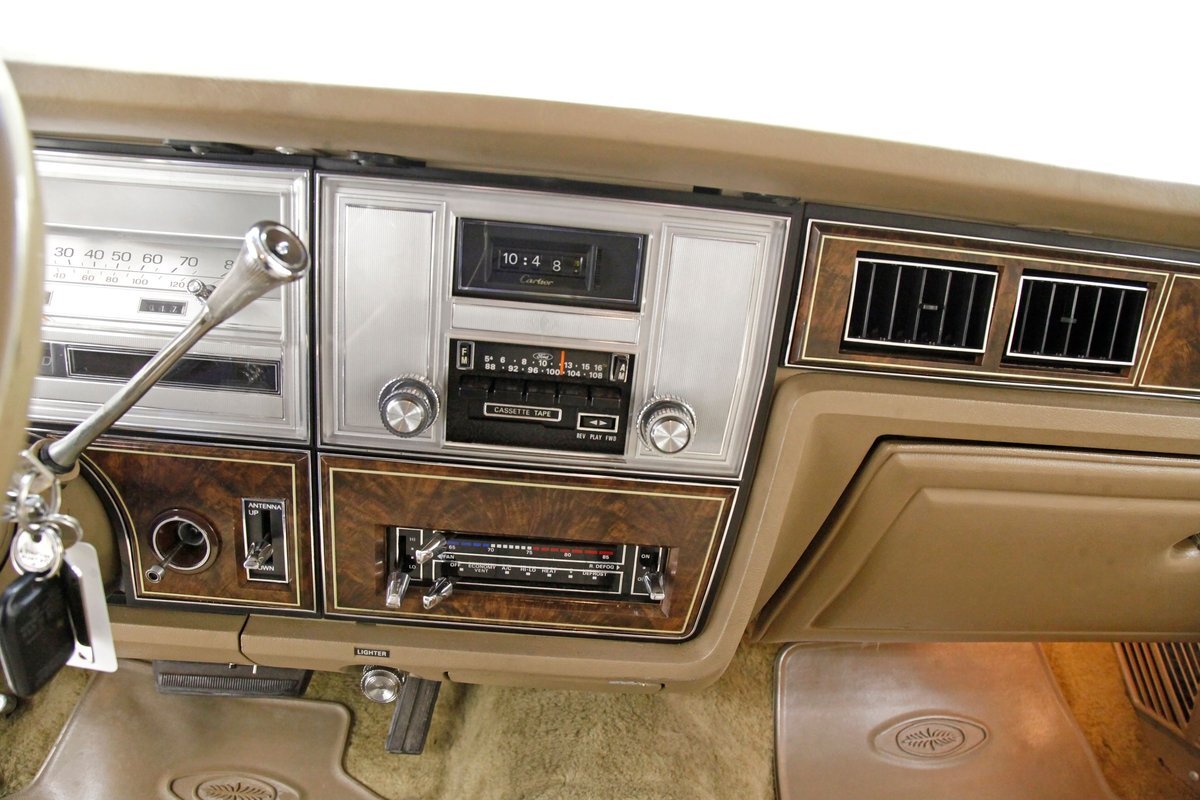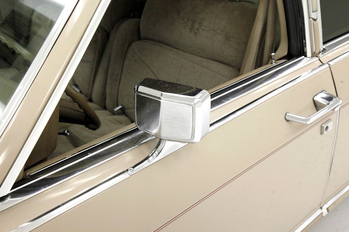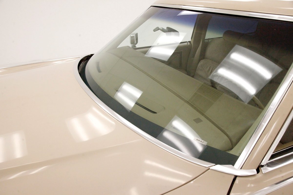 A fine mix of tufted crushed velour, tan smooth vinyl, wood applique trimmings and of course more chrome, more applique, and some tan carpet on the bottoms, and we have just opened the door. Here a plethora of toggles await your fingers to tickle and actuate the windows, locks, mirrors, and seats. Slipping inside on the driver's side I can view the long hood and it actually makes me feel important. I also feel comfort due to the pillowed, tufted, dual cushioned, buttoned crushed velour big daddy bucket seats dyed in wonderful tan. Massive armrests fold down, and I could nearly fall asleep, although there is not a TV to prompt me to do so...but I digress. Looking forward toward the original dash, plenty more wood applique in a fanned burl grain houses the instruments and knobs and switches. This plays with some more tan covered vinyl and a padded dashtop also in tan. Super clean would best describe this dash, which has a brushed aluminum speedometer located directly in front of the original steering wheel. Climate controls, power antenna, AM/FM/Cassette radio, and a Cartier clock, all are inserted for your pleasures while driving this land yacht. Wonderful fluffy tan carpet covers all floors front and rear, and a really nice tan headliner in tight vinyl is covering the inside of the roof. In back, an expanse of tan velour on an extra large bench seat with individual pillows and another central fold down armrest that lets the back passengers be in their own world as it goes by through the opera windows.