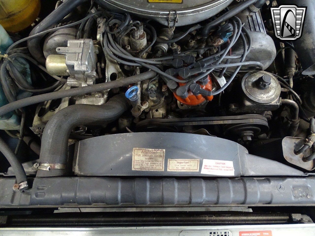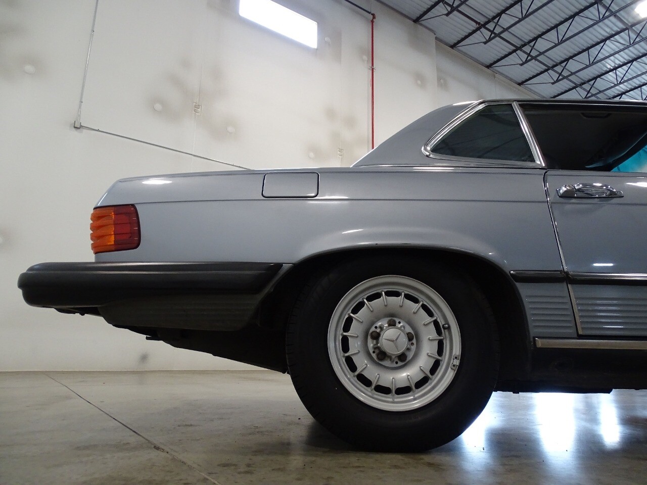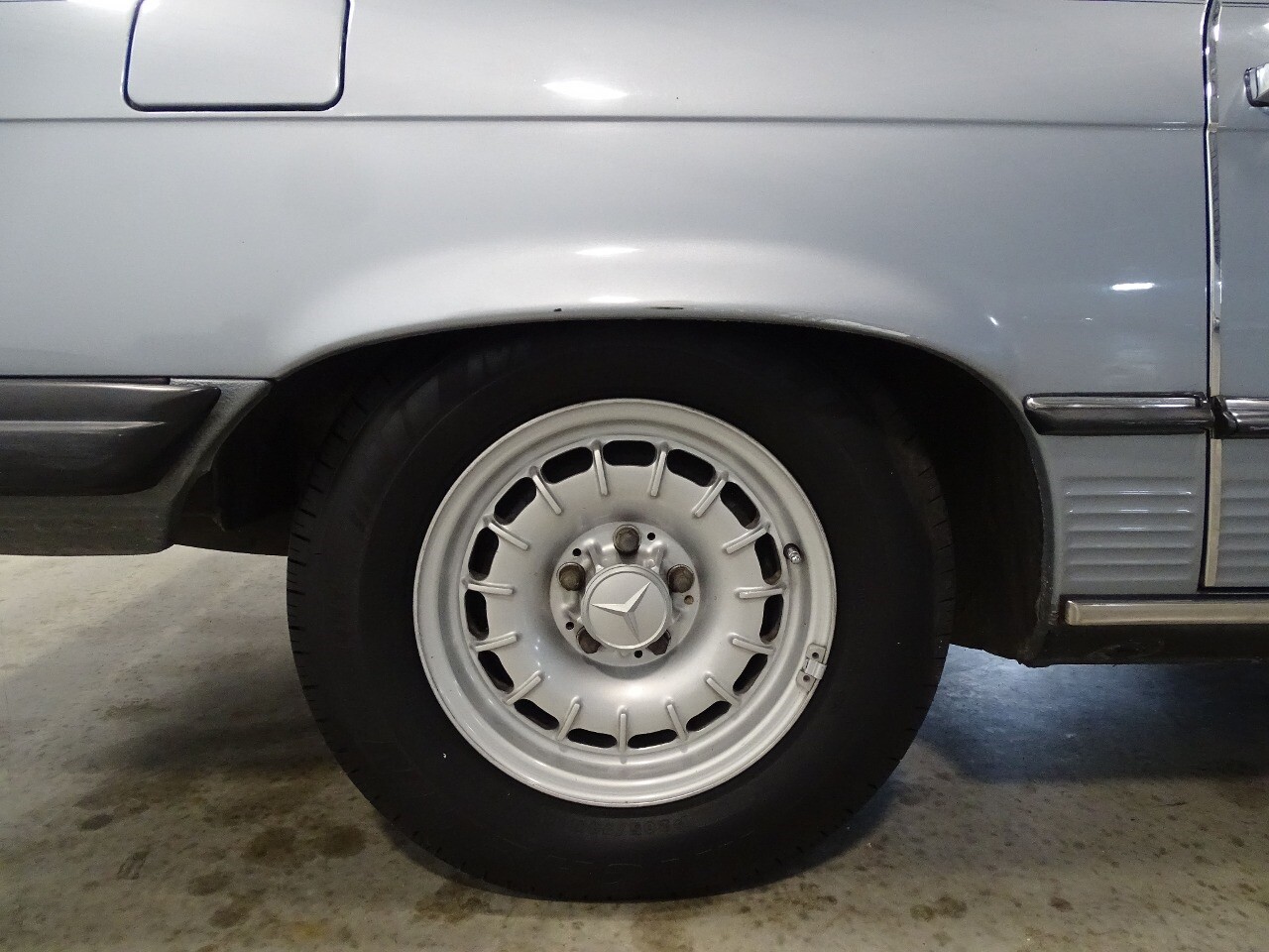 This 1983 Mercedes Benz 380SL is painted in light blue with a dark blue leather interior. Under the hood is a 3.8L fuel-injected V-8 attached to a four-speed automatic transmission. Added features include power steering, power four-wheel disk brakes, power windows. power locks, power mirrors, air conditioning, cruise control, Am/Fm/ cassette radio, alloy wheels and a manual cloth convertible top.