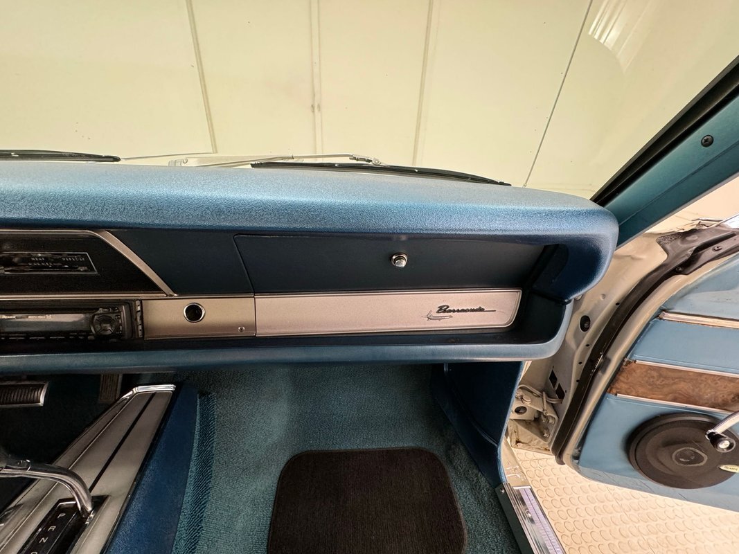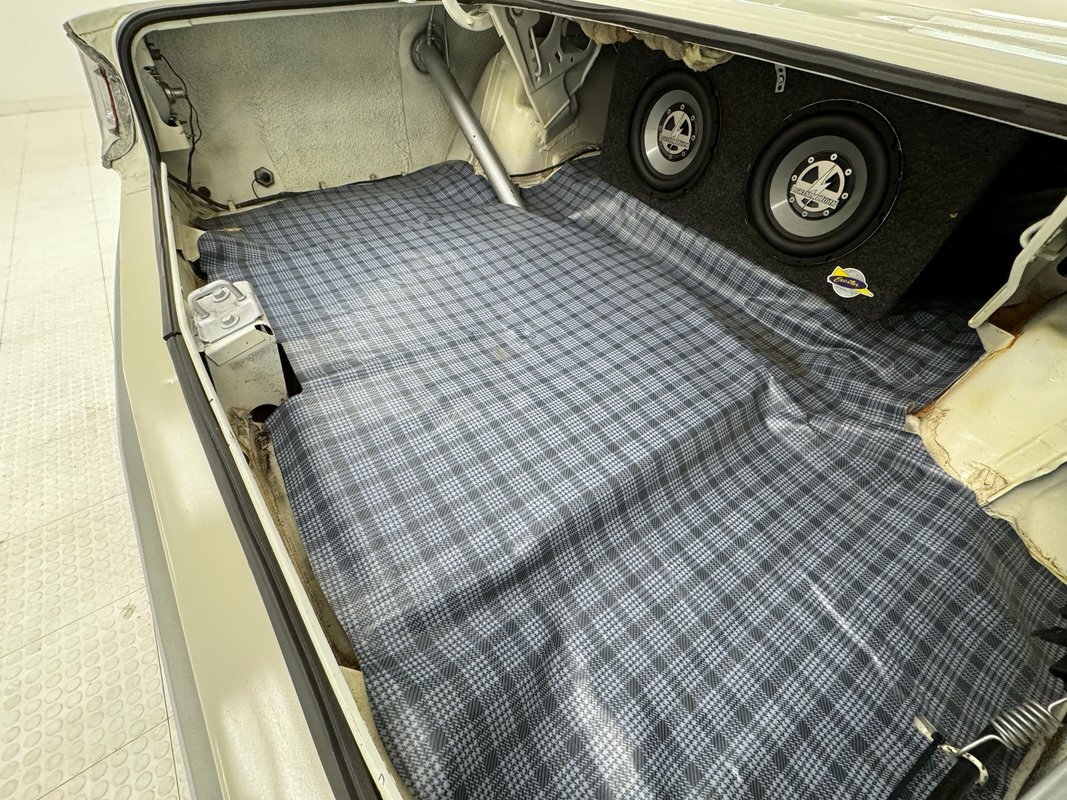 Light blue vinyl covers the door panels with various embossed patterns and are intersected by a faux burlwood panel just above a pleated map pocket. The same blue is used on the low back front bucket seats which show very little usage along with the back bench which looks pristine. A wood colored plastic rimmed steering wheel tops a narrow column on its way to the standard dash cluster with a speedometer that starts with 1 representing 10mph and goes to 12, or 120 mph. A second gauge contains four points of information, and a Premiere AM/FM/CD radio is to the driver's right, where we find a cracked piece of dash. The top of the dash looks great and the center console, shaped a bit like a snake head, houses the chrome shifter and storage bin, all over blue loop carpet that shows some wear on the driver's side. We note one tear in the headliner which is otherwise clean and tight. The trunk is lined with a fitted plaid mat, batting, and includes a speaker box with dual speakers.