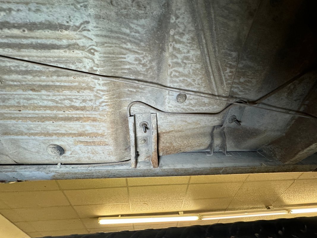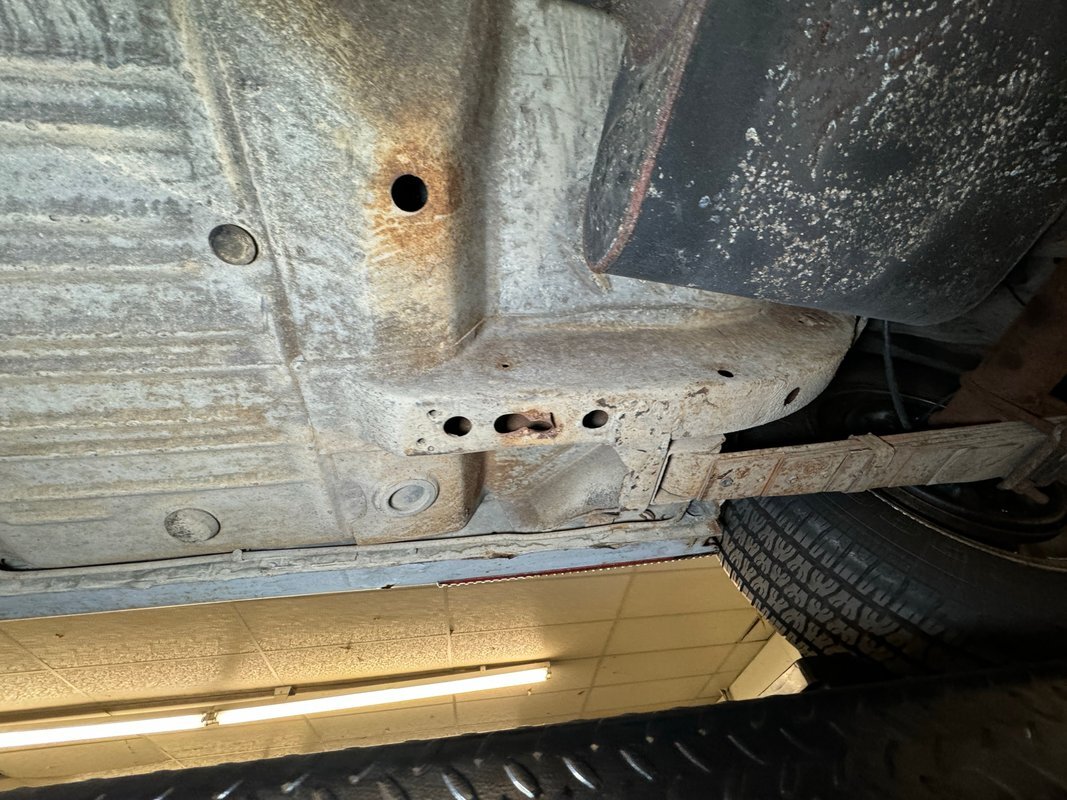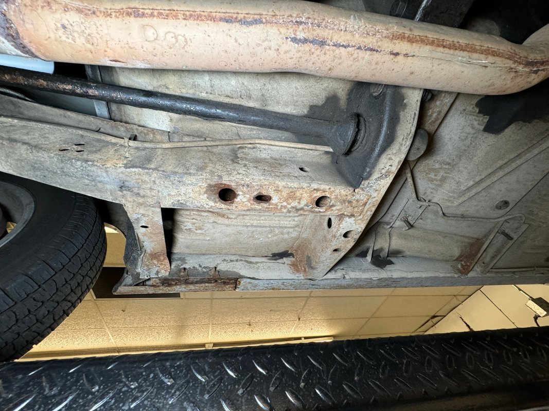 Driver quality underneath with plenty of typical surface rust. No oil is present under the engine but we do note some fluid on the back drums, and some residual oil on the rear differential. The dual exhaust passes through a pair of Flowmaster mufflers before exiting out the back via chrome tips. Suspension consists of torsion bars up front and leaf springs in the back.