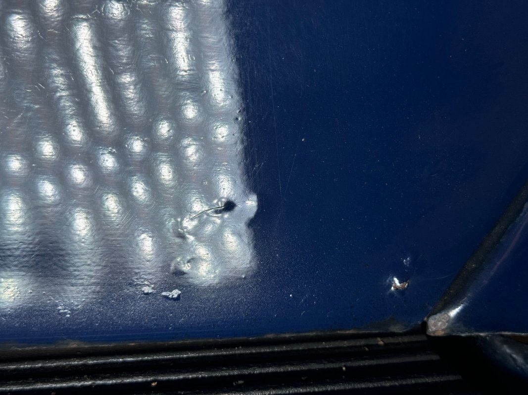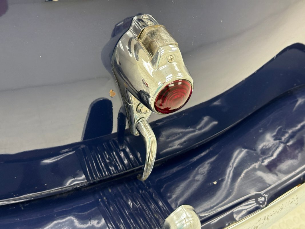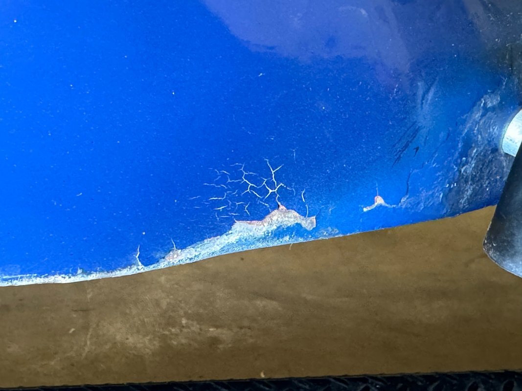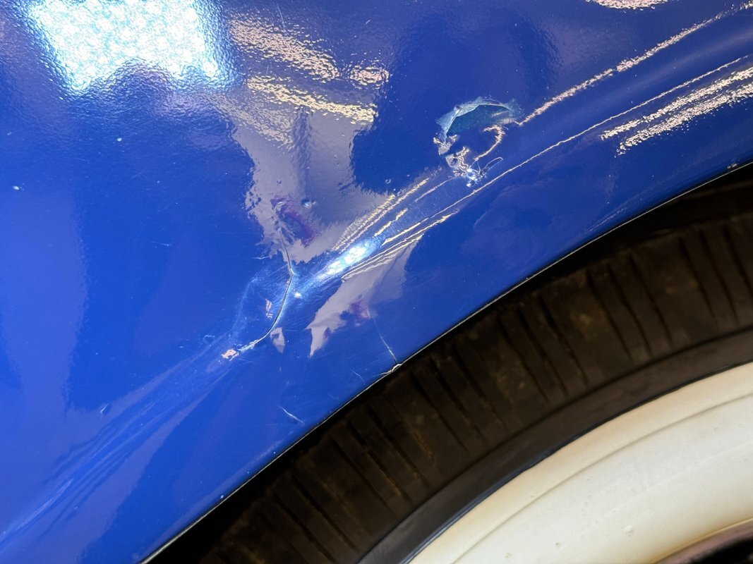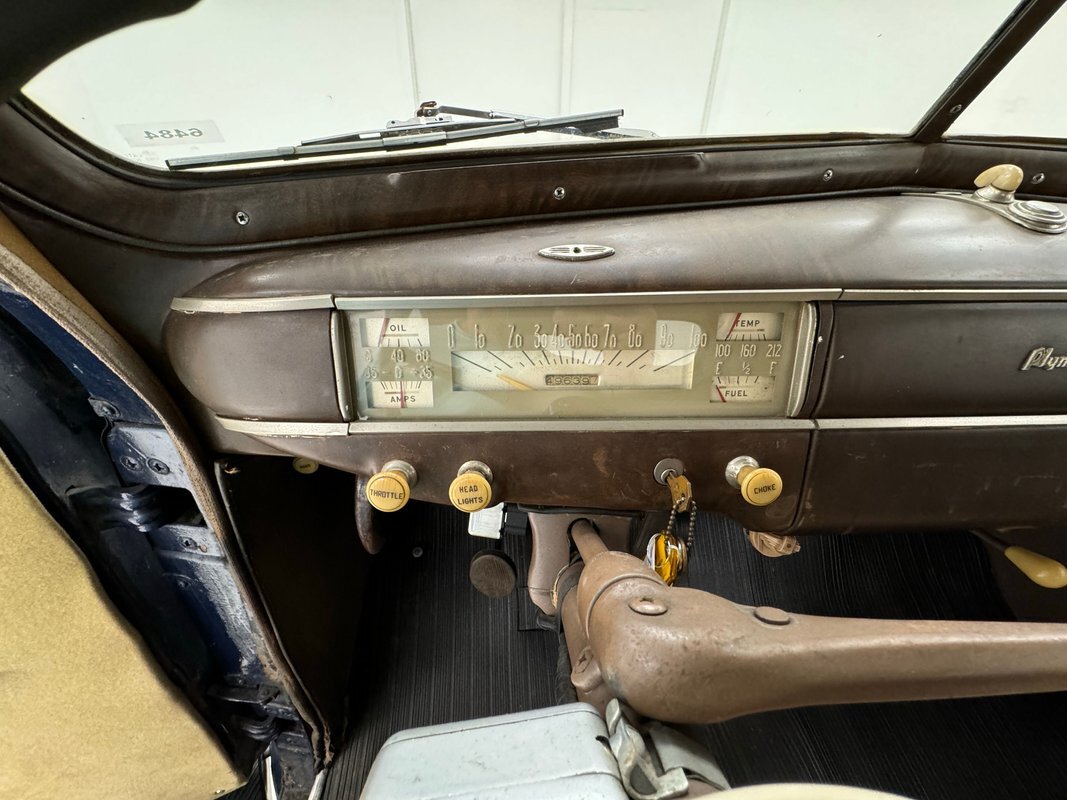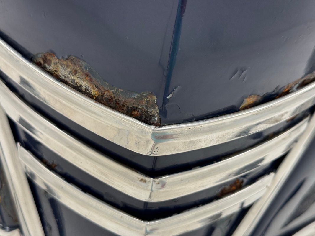 A pointed front V splits the grilles which are large rounded openings with horizontal slats that are mirrored in the trip below the hood line. It's quite a dramatic face and in this case, surrounded by dark blue paint accented with ornate chrome pieces and a body trim bar that rises from the front and heads straight to the back. The articulated fenders are embossed with three accent lines on their back edge and a running board effectively connects the fenders. There is a forward leaning attitude to the profile of the car, as if in motion and the front has leading points in the hood ornament and marker lights above the headlights. 16-inch wheels are painted blue with remnants of pinstriping, and the hubcaps are lightly engraved with the Plymouth sailboat. The metalwork is intact but could benefit from polishing or rechroming. Other needs and imperfections include a cracked rubber frame around the rear window, some rust at the front edge of the hood and nose piece, areas of rough paint, cracking, large chips, scratches, bubbling, peeling paint, and some invasive rust on the door edge and running board.