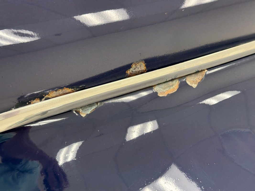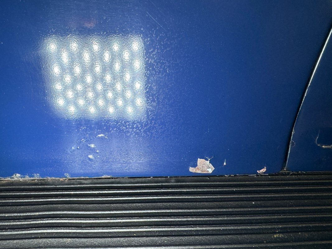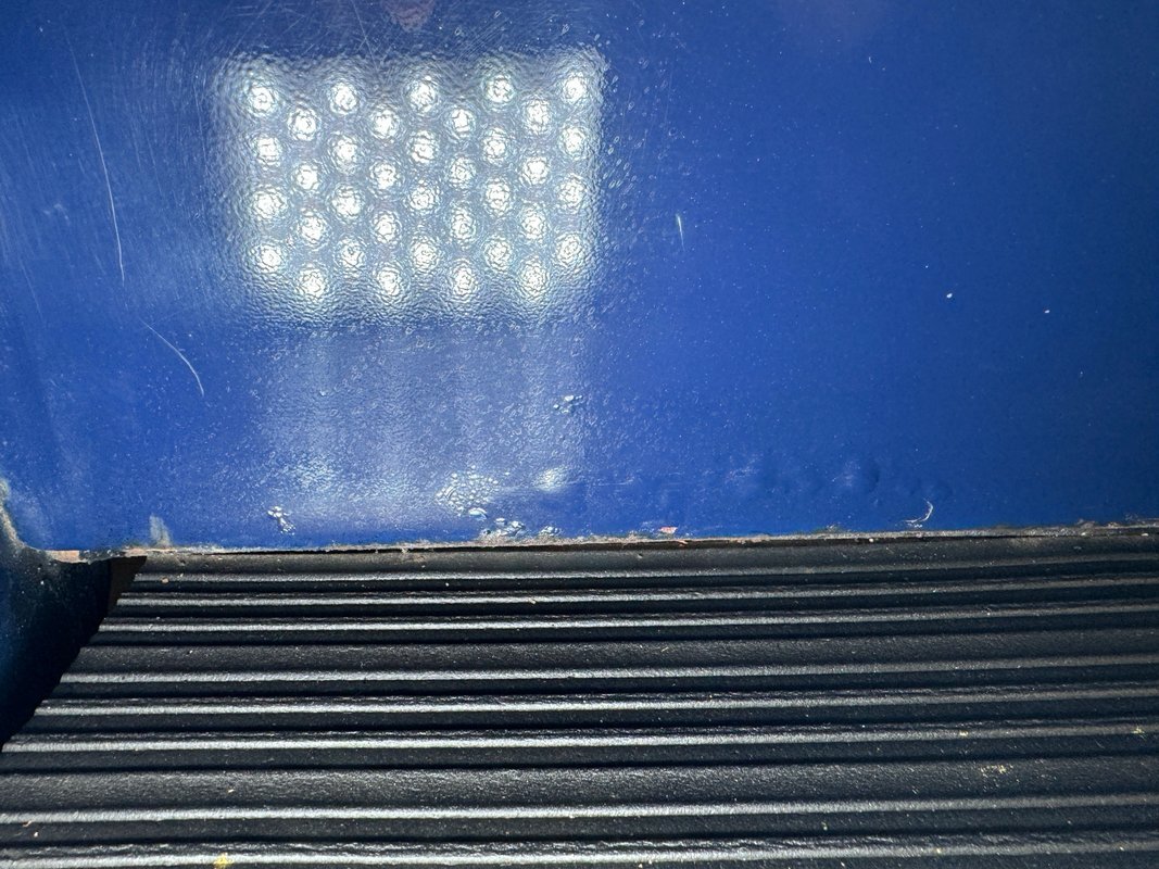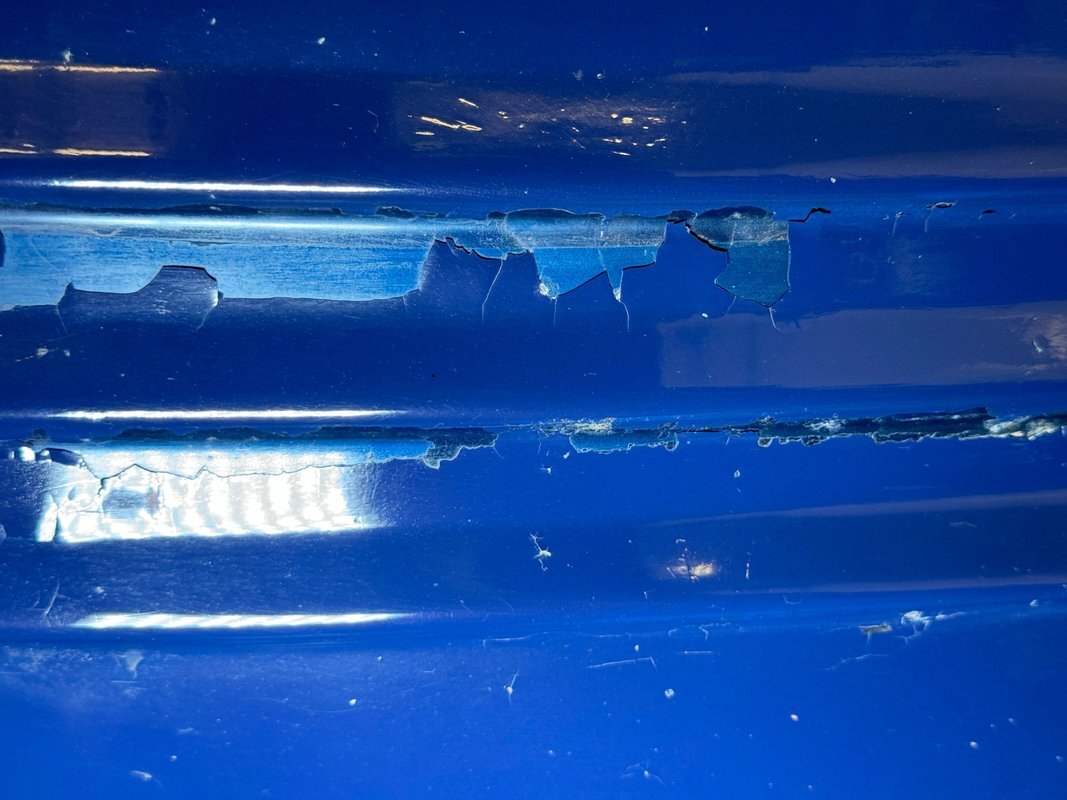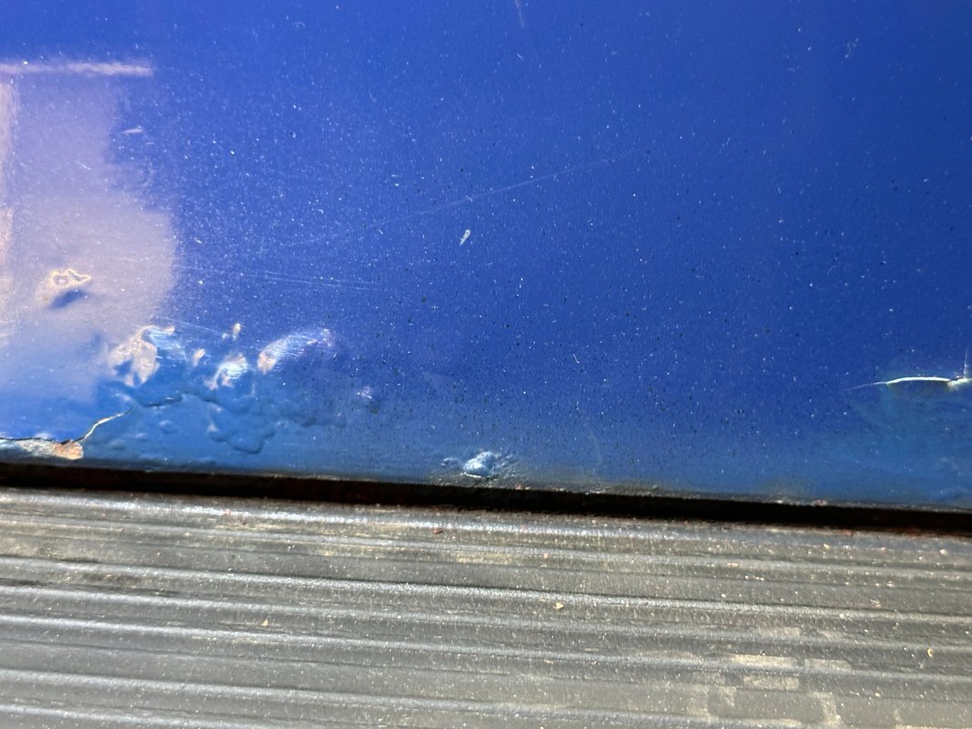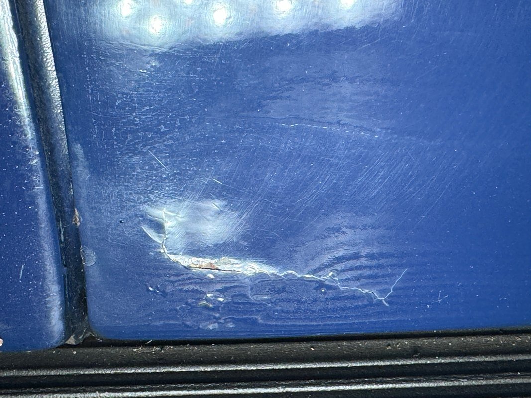 A pointed front V splits the grilles which are large rounded openings with horizontal slats that are mirrored in the trip below the hood line. It's quite a dramatic face and in this case, surrounded by dark blue paint accented with ornate chrome pieces and a body trim bar that rises from the front and heads straight to the back. The articulated fenders are embossed with three accent lines on their back edge and a running board effectively connects the fenders. There is a forward leaning attitude to the profile of the car, as if in motion and the front has leading points in the hood ornament and marker lights above the headlights. 16-inch wheels are painted blue with remnants of pinstriping, and the hubcaps are lightly engraved with the Plymouth sailboat. The metalwork is intact but could benefit from polishing or rechroming. Other needs and imperfections include a cracked rubber frame around the rear window, some rust at the front edge of the hood and nose piece, areas of rough paint, cracking, large chips, scratches, bubbling, peeling paint, and some invasive rust on the door edge and running board.