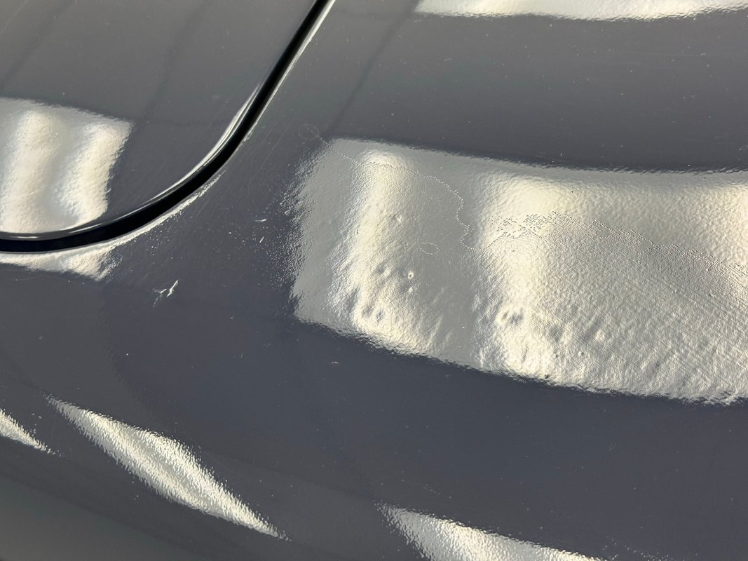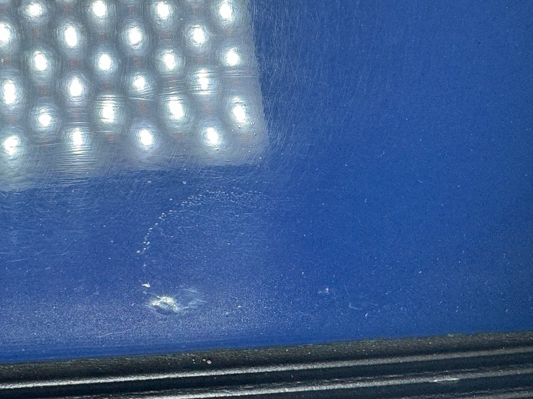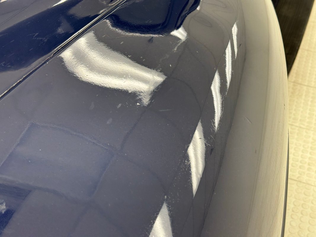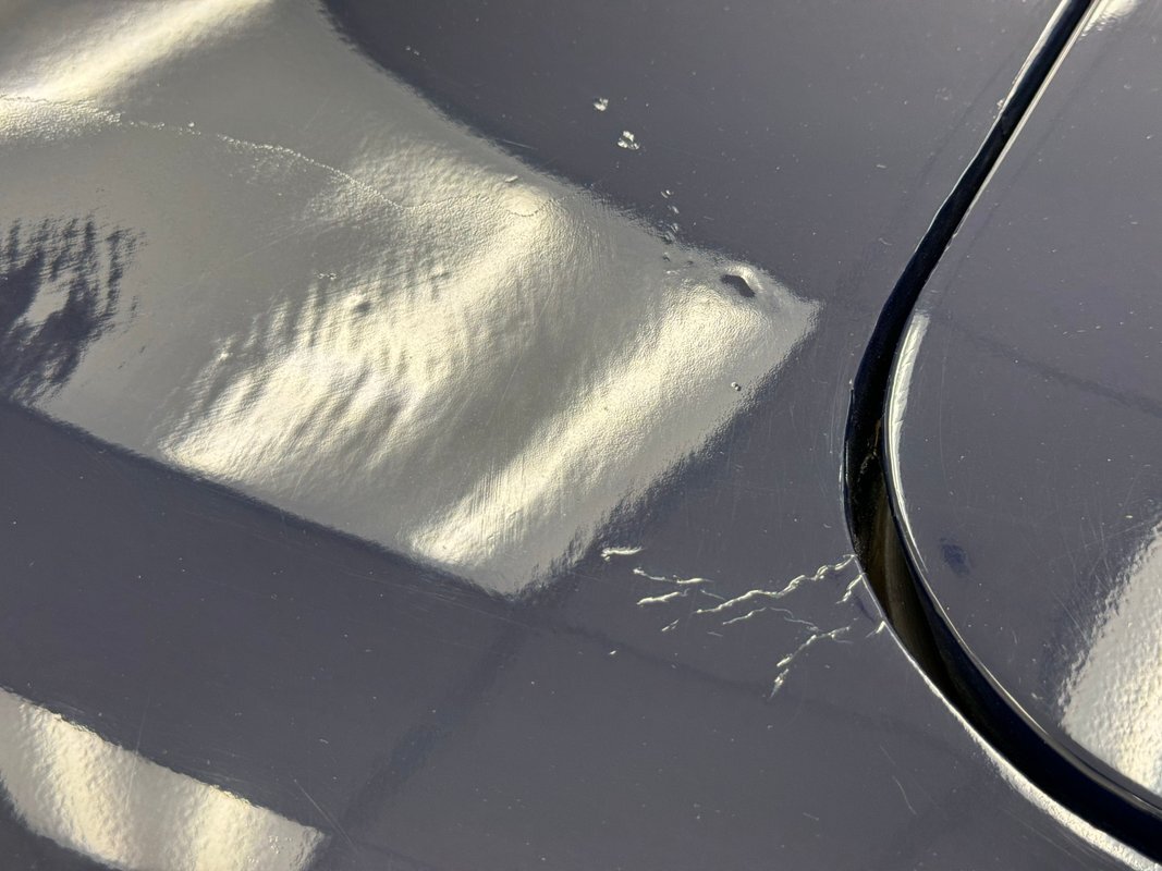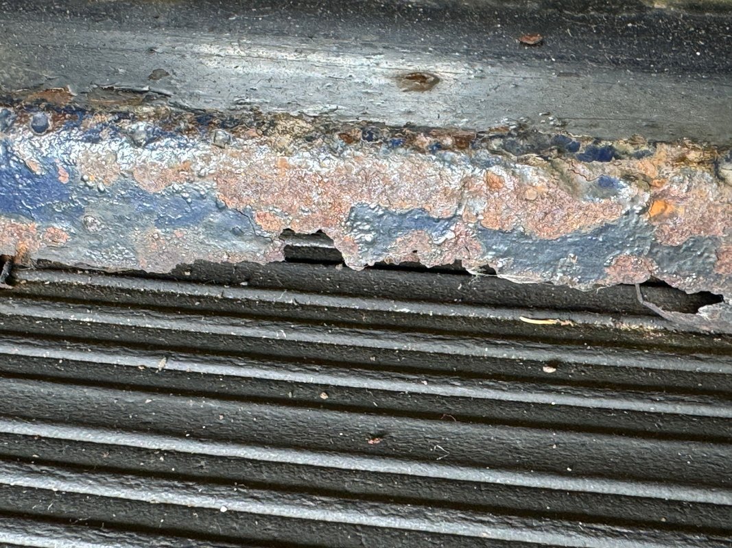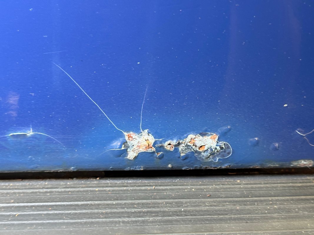 A pointed front V splits the grilles which are large rounded openings with horizontal slats that are mirrored in the trip below the hood line. It's quite a dramatic face and in this case, surrounded by dark blue paint accented with ornate chrome pieces and a body trim bar that rises from the front and heads straight to the back. The articulated fenders are embossed with three accent lines on their back edge and a running board effectively connects the fenders. There is a forward leaning attitude to the profile of the car, as if in motion and the front has leading points in the hood ornament and marker lights above the headlights. 16-inch wheels are painted blue with remnants of pinstriping, and the hubcaps are lightly engraved with the Plymouth sailboat. The metalwork is intact but could benefit from polishing or rechroming. Other needs and imperfections include a cracked rubber frame around the rear window, some rust at the front edge of the hood and nose piece, areas of rough paint, cracking, large chips, scratches, bubbling, peeling paint, and some invasive rust on the door edge and running board.