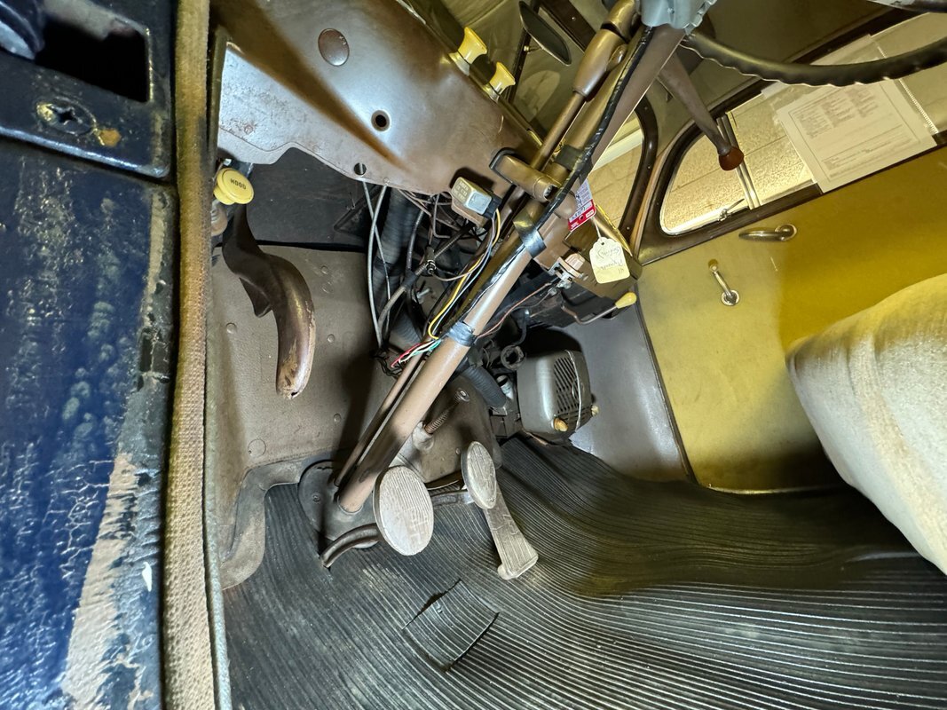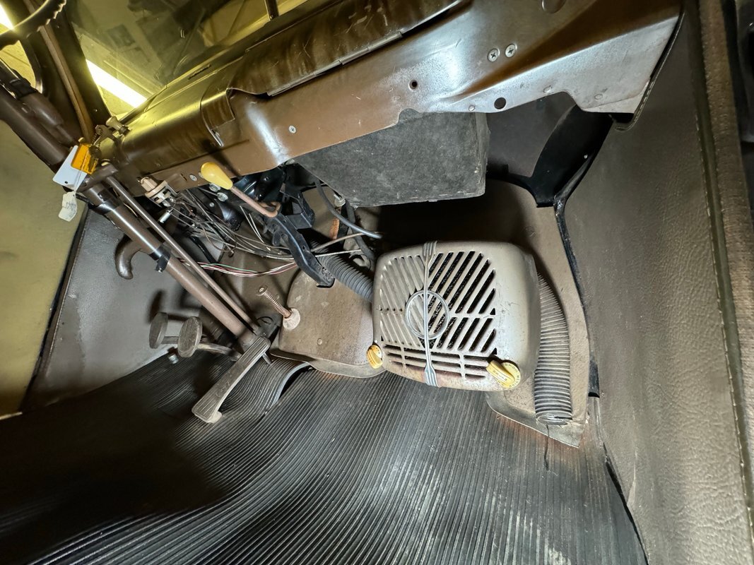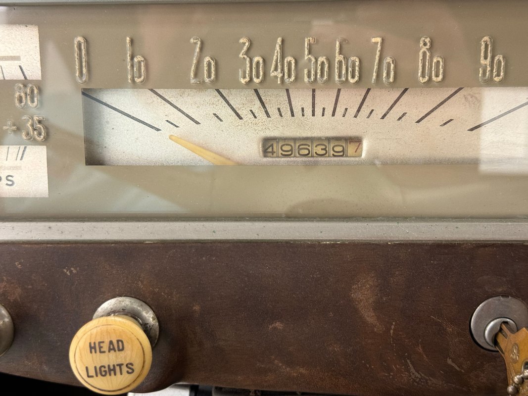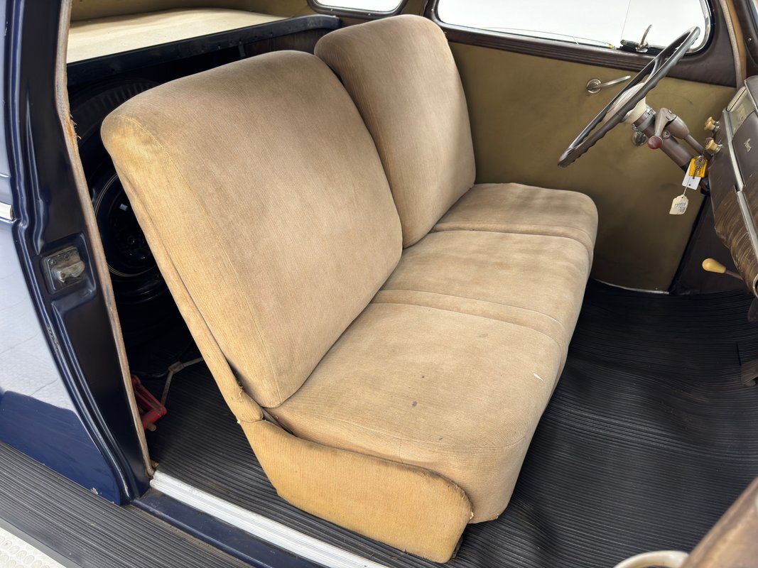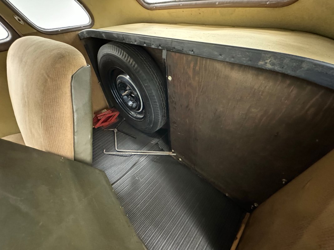 Simple tan cloth door panels are fully intact and perhaps a bit dirty while the window frame shows some fading. The cloth split bench seat is mostly intact but has some tears on the driver's side upper and lower sections, and the shell will need to be recovered. The package shelf and rear storage behind the seats is in decent shape and a spare tire is conveniently mounted vertically on the back wall, thus preventing the salesman from having to remove the contents of the trunk to get to the spare. The steering wheel may have been completely white at some point and now only remnants of that color remain and its nicely patina'd. The shifter is mounted above the steering column and not integrated as they would become in later years. A simple dash contains a rectangular gauge pod with horizontal meters on a plain, brown dashboard. Labeled knobs and switches are ivory colored and a heater is located in the footwell on the passenger's side. A textured rubberized mat covers the floor and the tan headliner may have been lighter in the past, but it's intact and in good shape.