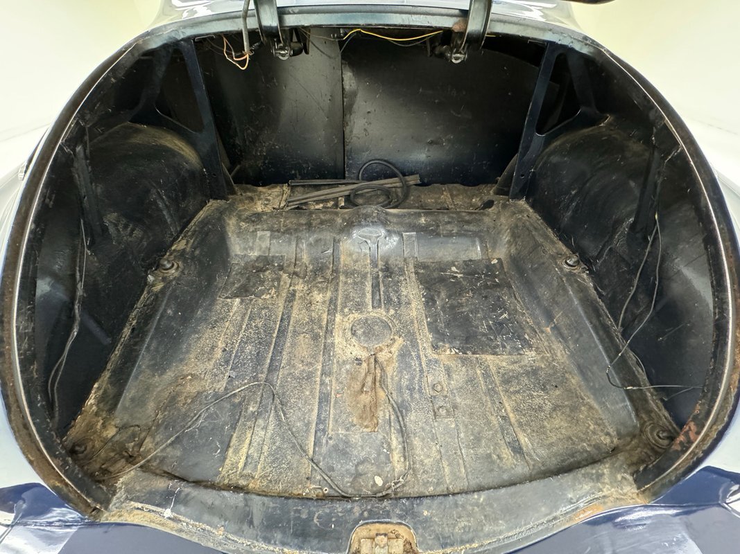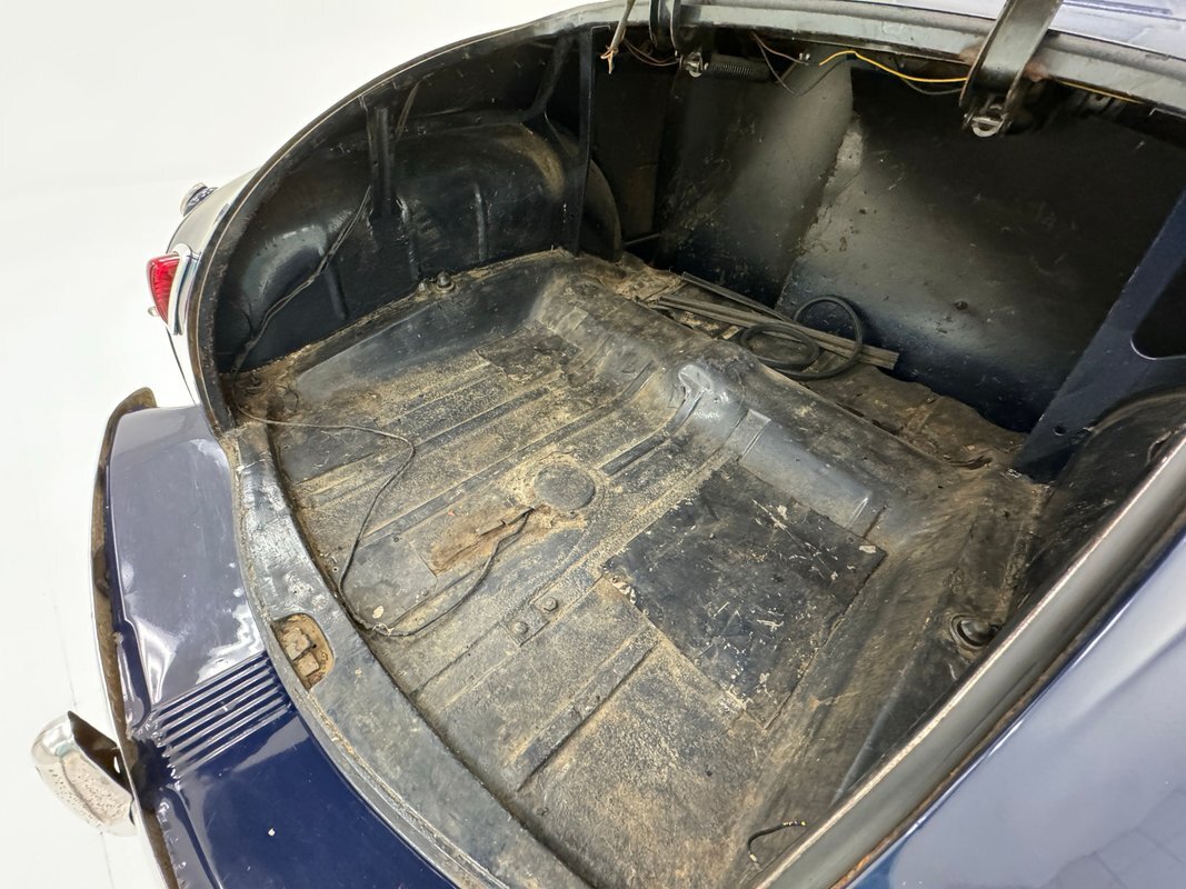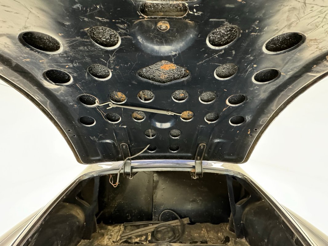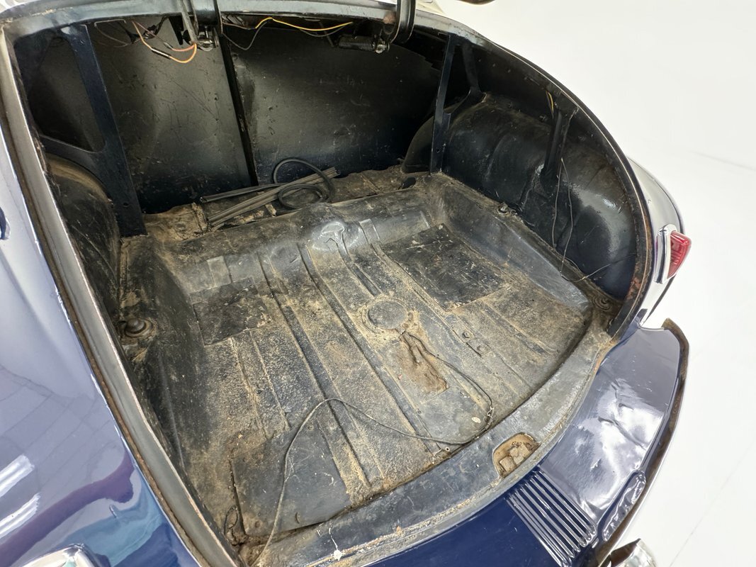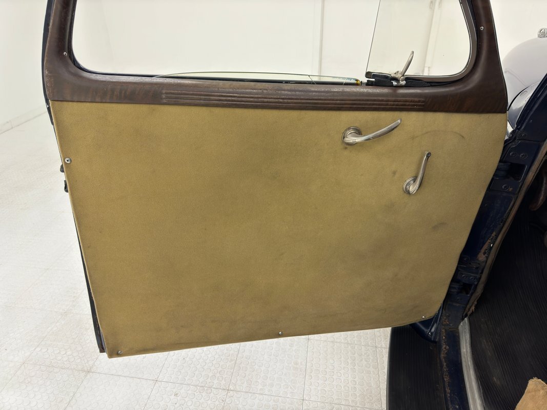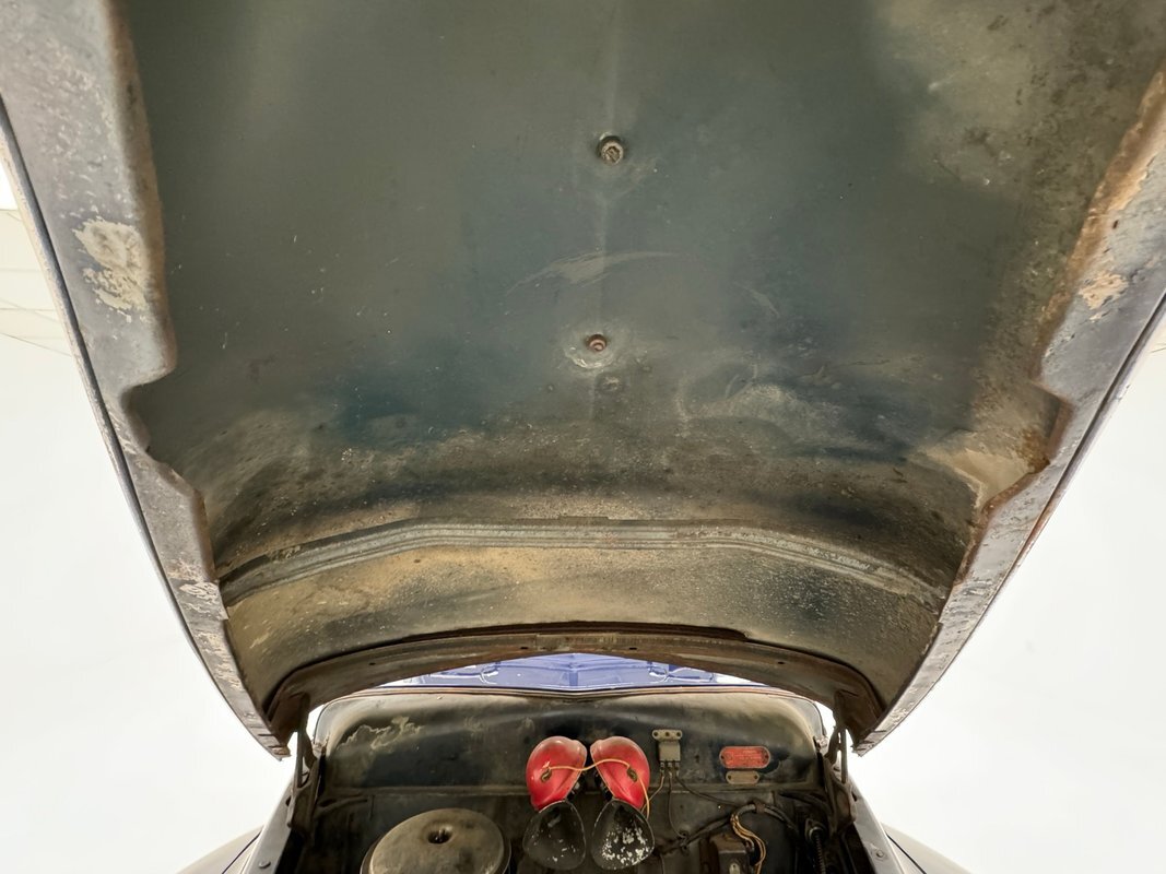 Simple tan cloth door panels are fully intact and perhaps a bit dirty while the window frame shows some fading. The cloth split bench seat is mostly intact but has some tears on the driver's side upper and lower sections, and the shell will need to be recovered. The package shelf and rear storage behind the seats is in decent shape and a spare tire is conveniently mounted vertically on the back wall, thus preventing the salesman from having to remove the contents of the trunk to get to the spare. The steering wheel may have been completely white at some point and now only remnants of that color remain and its nicely patina'd. The shifter is mounted above the steering column and not integrated as they would become in later years. A simple dash contains a rectangular gauge pod with horizontal meters on a plain, brown dashboard. Labeled knobs and switches are ivory colored and a heater is located in the footwell on the passenger's side. A textured rubberized mat covers the floor and the tan headliner may have been lighter in the past, but it's intact and in good shape.