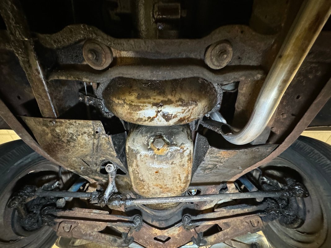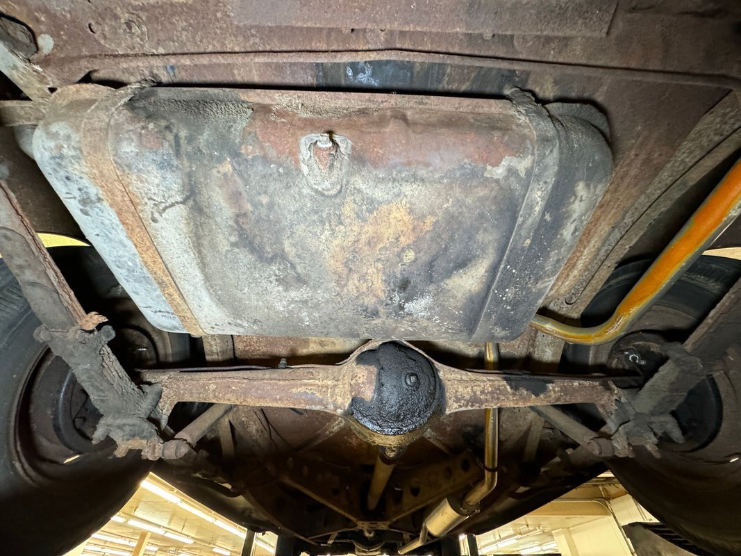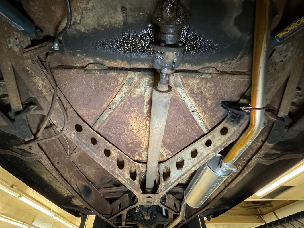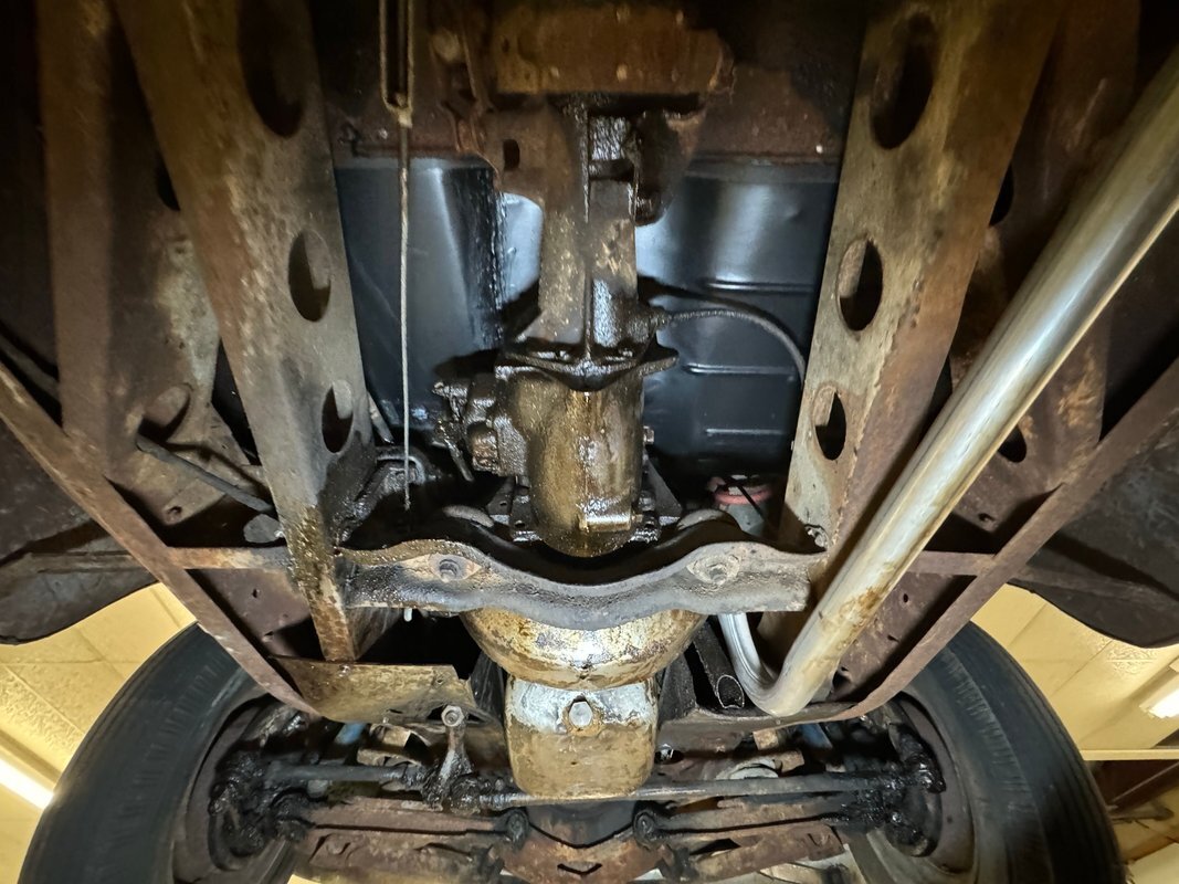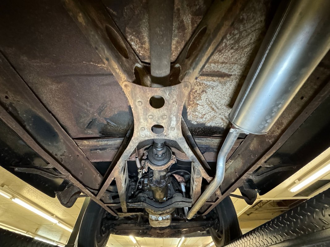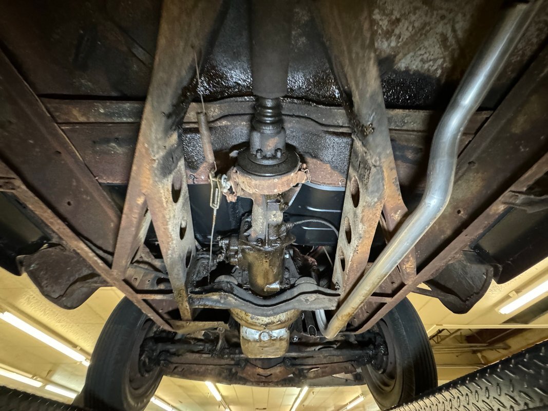There's a good amount of surface rust underneath and some invasive rust as well on the inner rocker panels. A buildup of grease is found on the knuckles and oil is on the rear differential and sprayed on the underbody around the U-joint, on the transmission pan and a few drops on the oil pan. On a positive note, the exhaust is newer, and the single pipe encounters a stock style muffler before exiting out the back. Suspension consists of coil springs in front and leaf springs in the back.