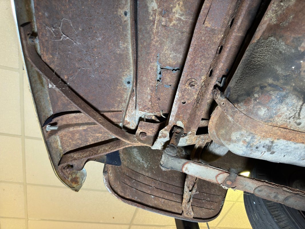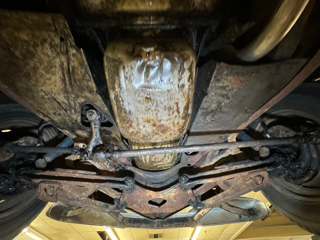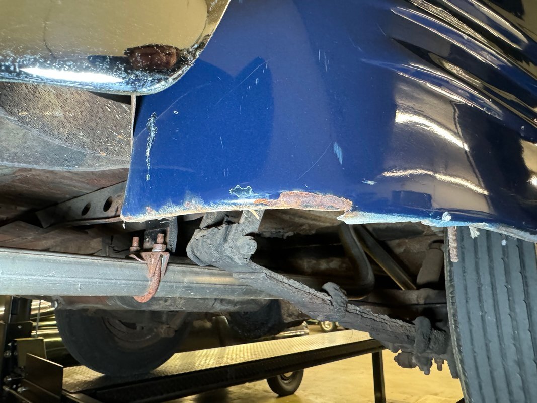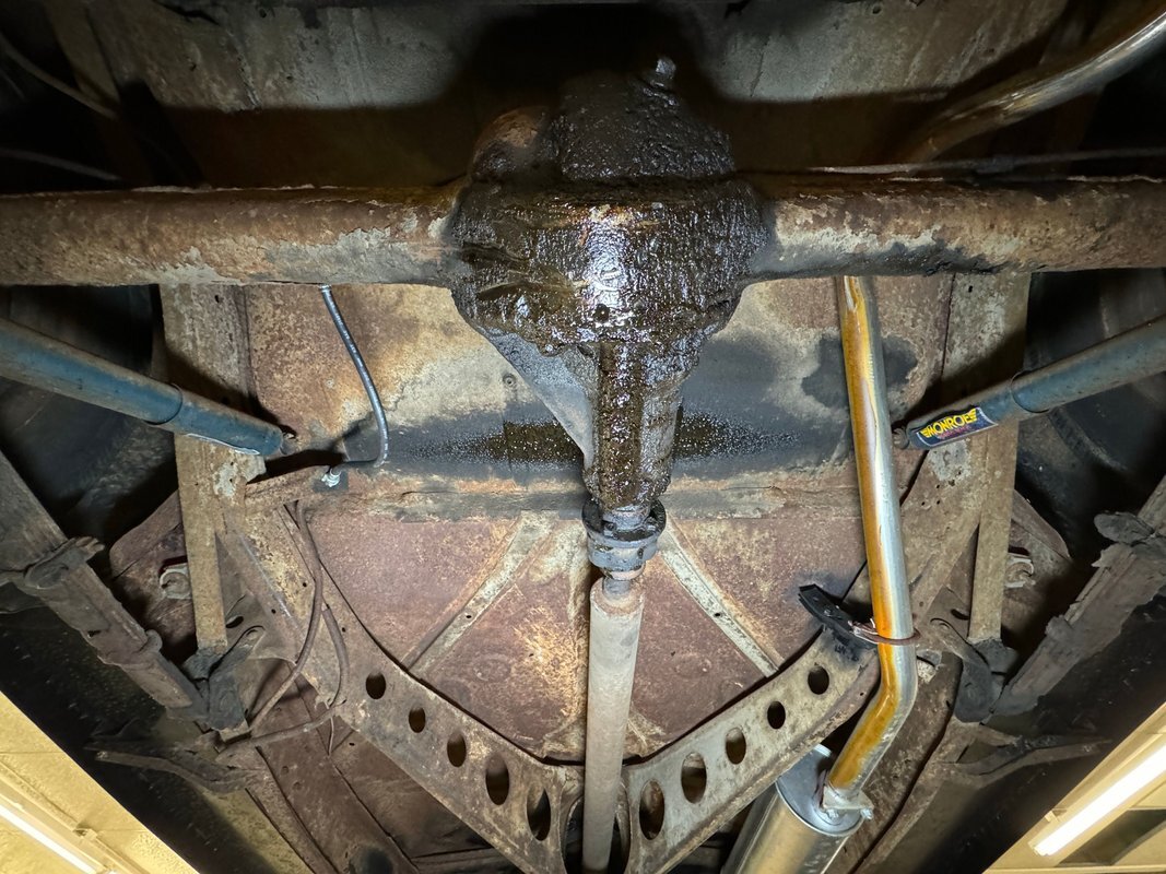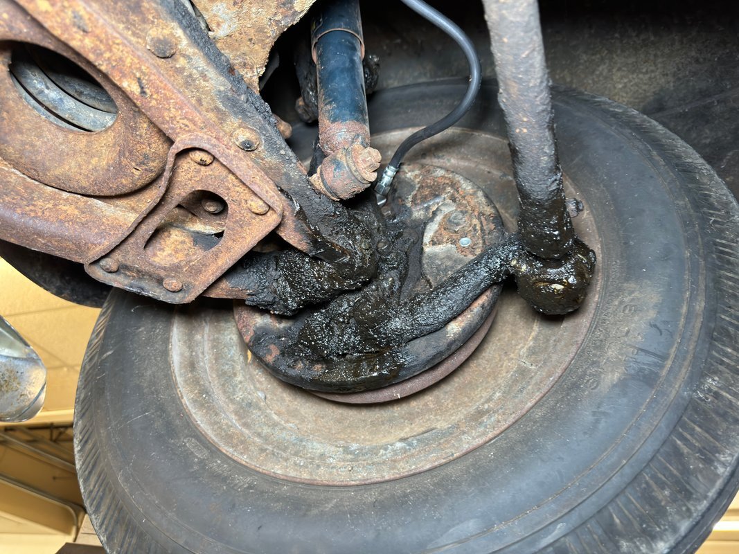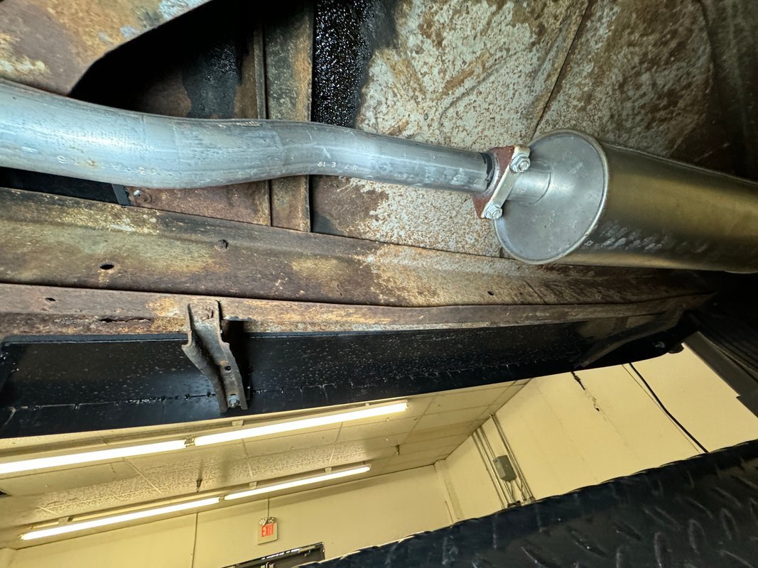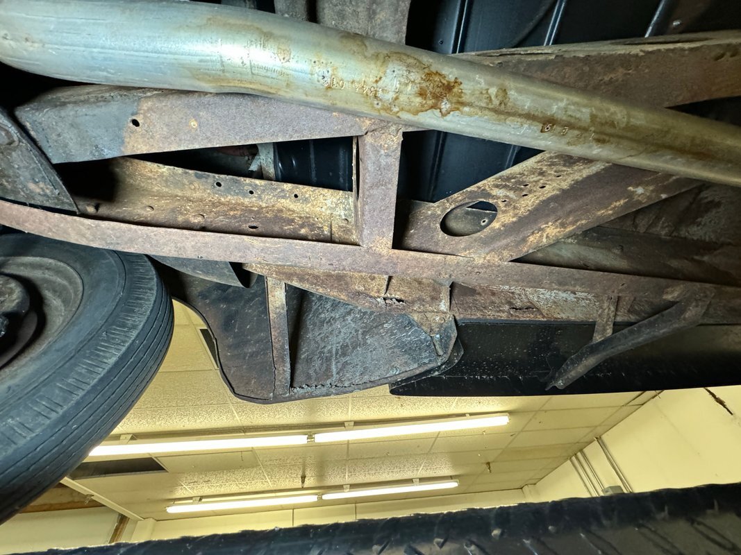 There's a good amount of surface rust underneath and some invasive rust as well on the inner rocker panels. A buildup of grease is found on the knuckles and oil is on the rear differential and sprayed on the underbody around the U-joint, on the transmission pan and a few drops on the oil pan. On a positive note, the exhaust is newer, and the single pipe encounters a stock style muffler before exiting out the back. Suspension consists of coil springs in front and leaf springs in the back.