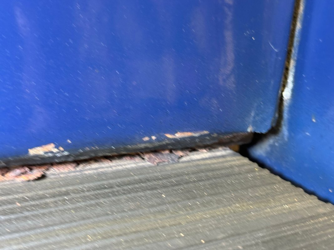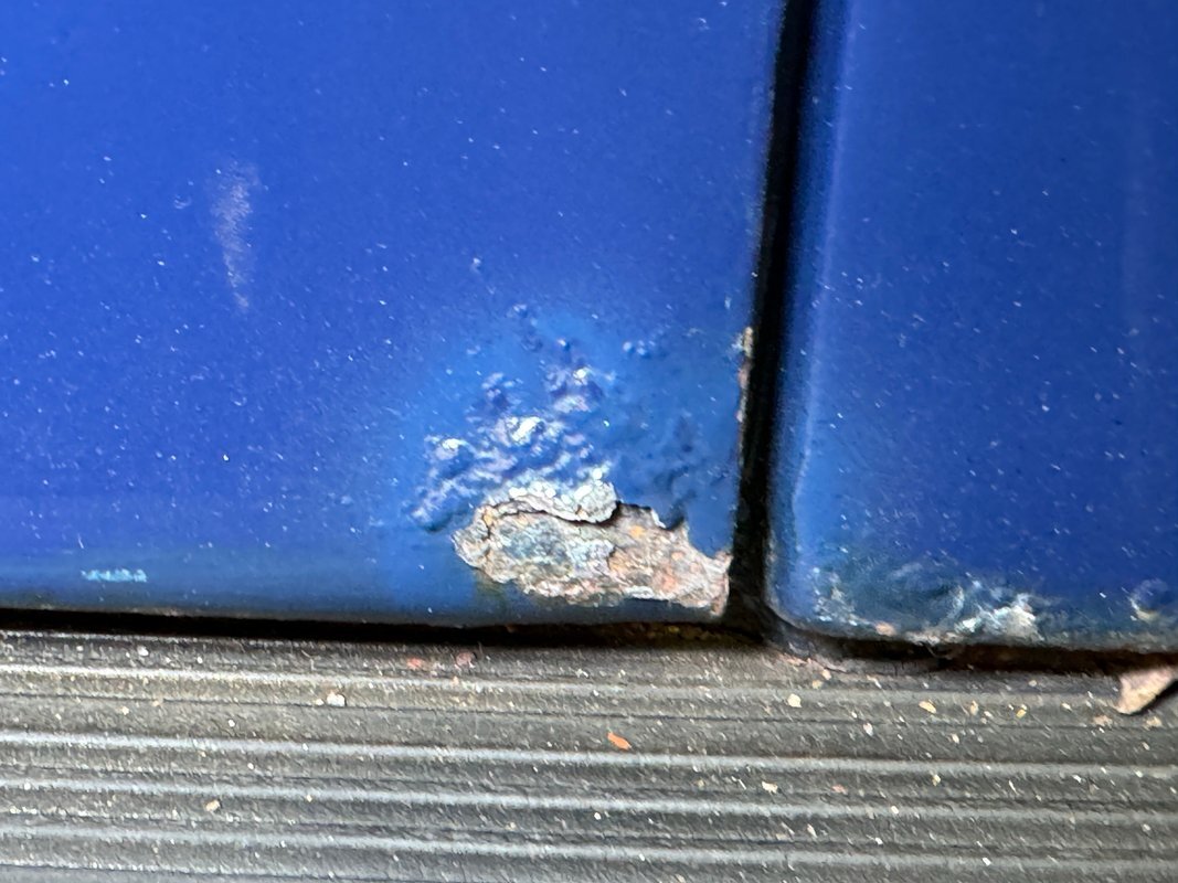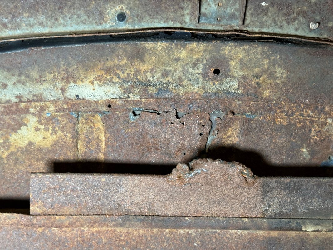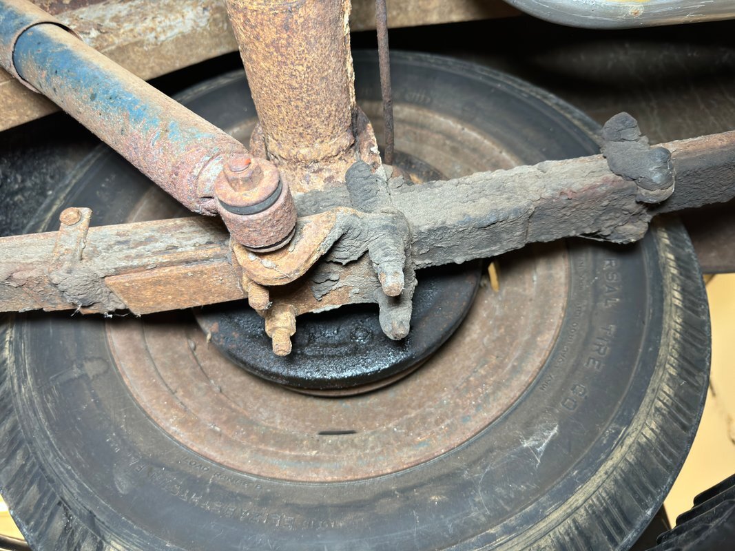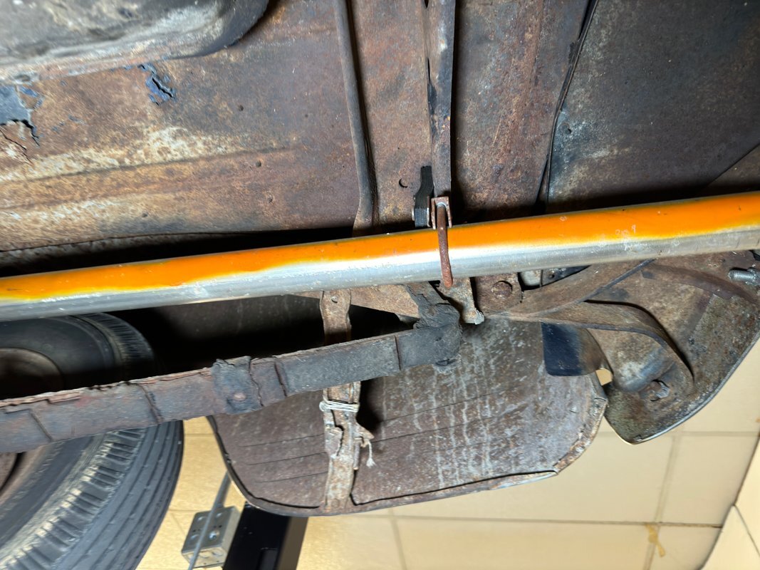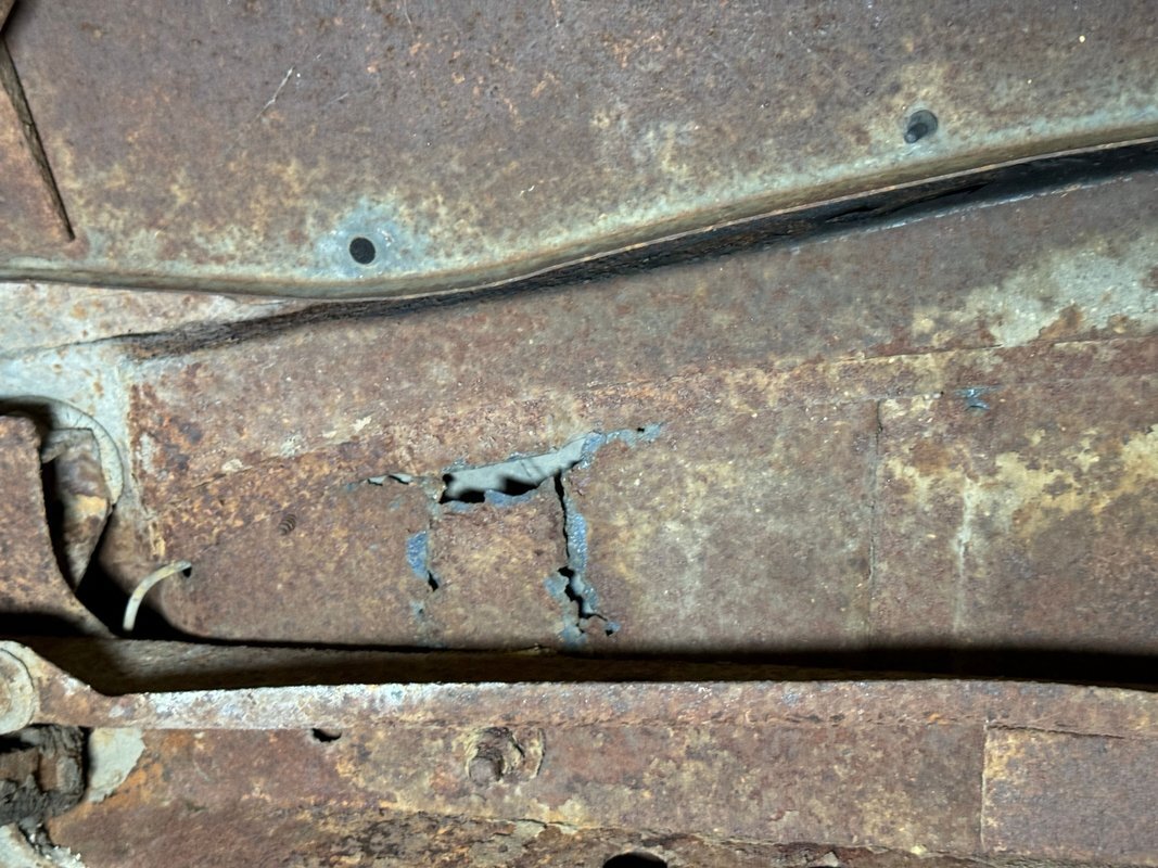 There's a good amount of surface rust underneath and some invasive rust as well on the inner rocker panels. A buildup of grease is found on the knuckles and oil is on the rear differential and sprayed on the underbody around the U-joint, on the transmission pan and a few drops on the oil pan. On a positive note, the exhaust is newer, and the single pipe encounters a stock style muffler before exiting out the back. Suspension consists of coil springs in front and leaf springs in the back.