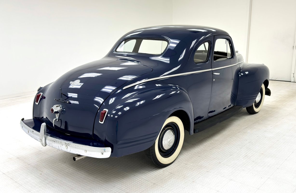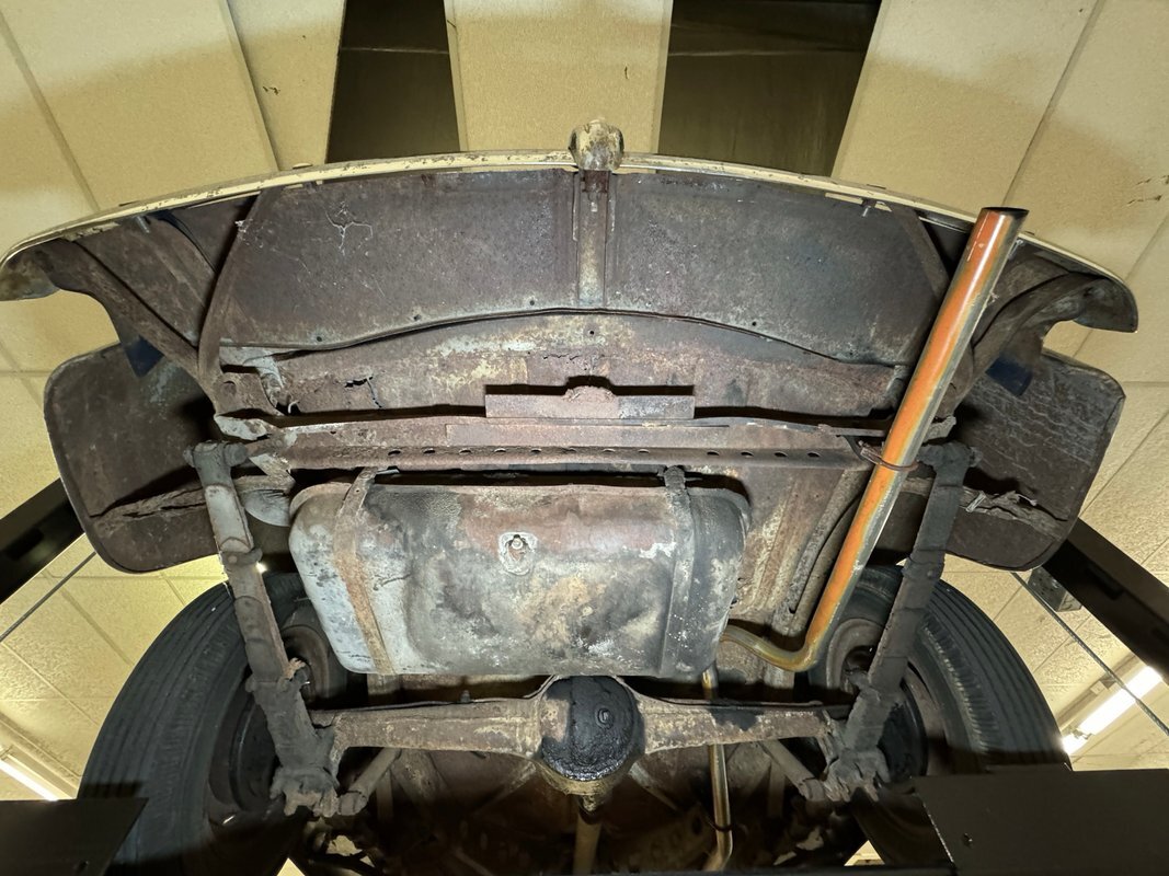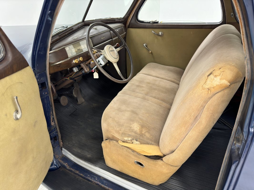 The 201.3ci L-head inline 6 cylinder engine is in driver condition under the hood with dust and surface rust and age. It's rated at 87 horsepower and receives fuel through a 1-barrel carburetor and is set into motion with a 3-speed manual transmission sending power to 4.10 gears in the back. Drum brakes all around for this '41 business coupe.