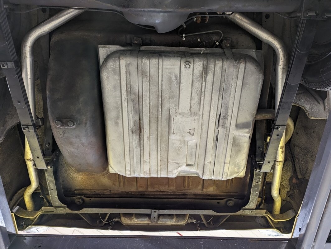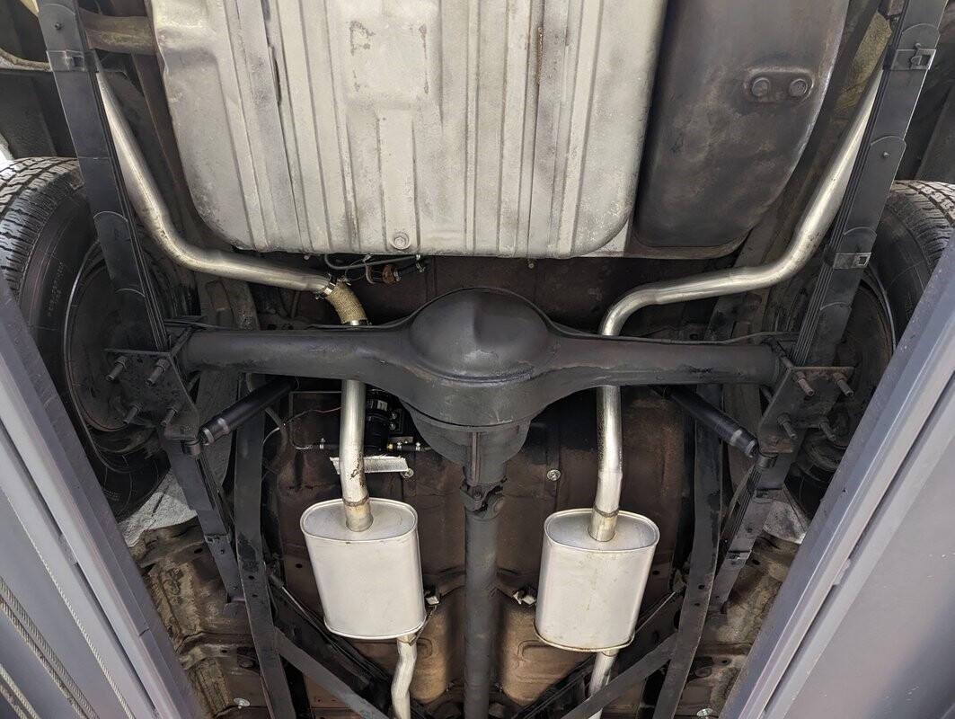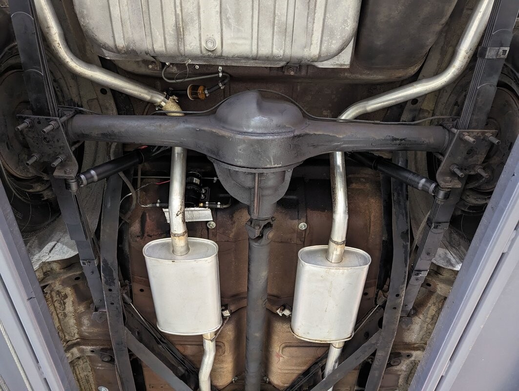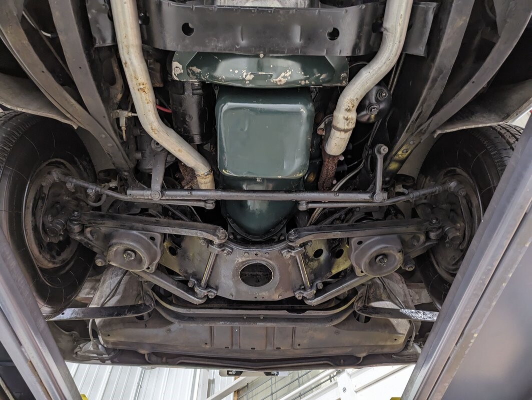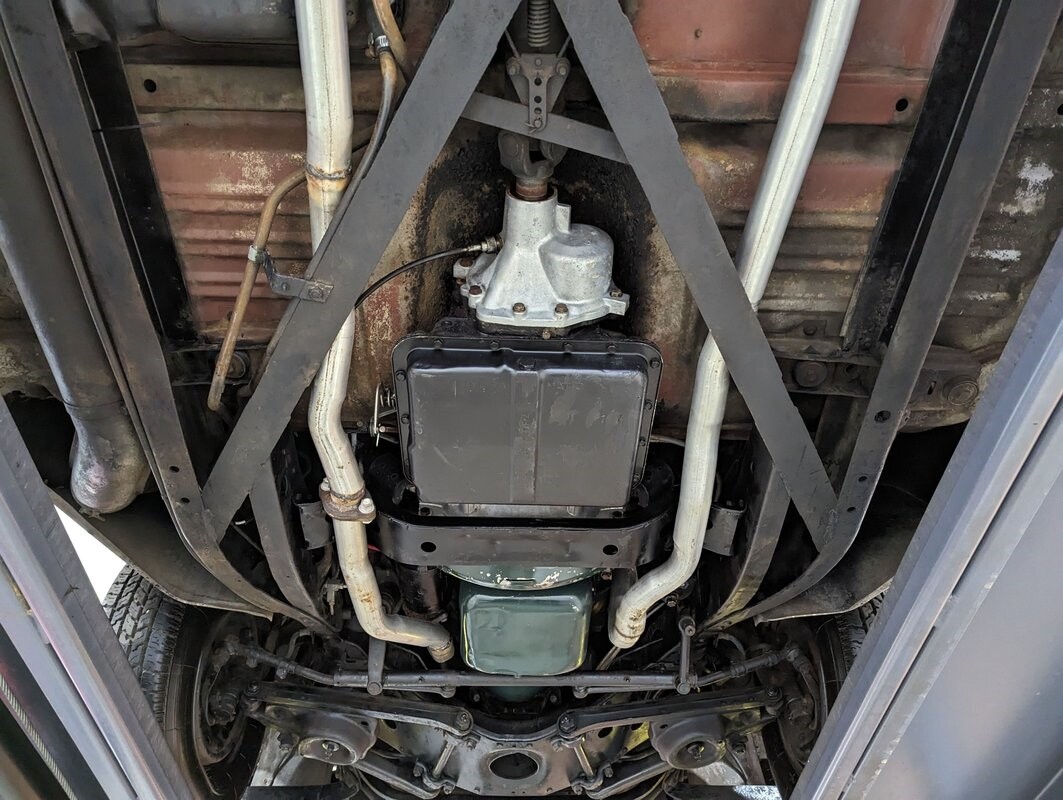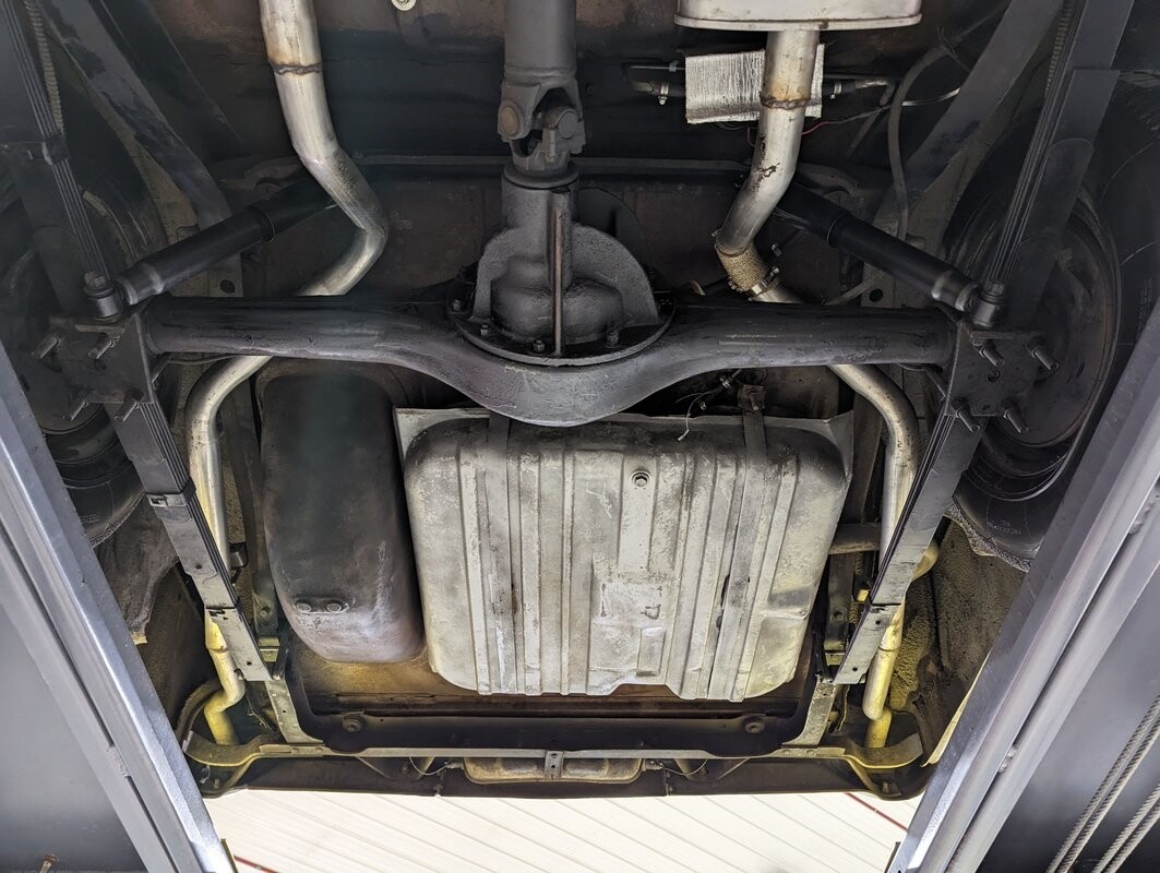 UNDERSIDE: It appears to be bone dry, rust-free original metal. It's still wearing its original primer and a little bit of undercoat that it left the factory with. It has been maintained as needed. The shocks look new, dual exhaust system looks recent; fuel tank is clean. Looking up at the motor it's actually very clean and so is the Hydramatic transmission. It very probable it has been rebuilt or serviced.