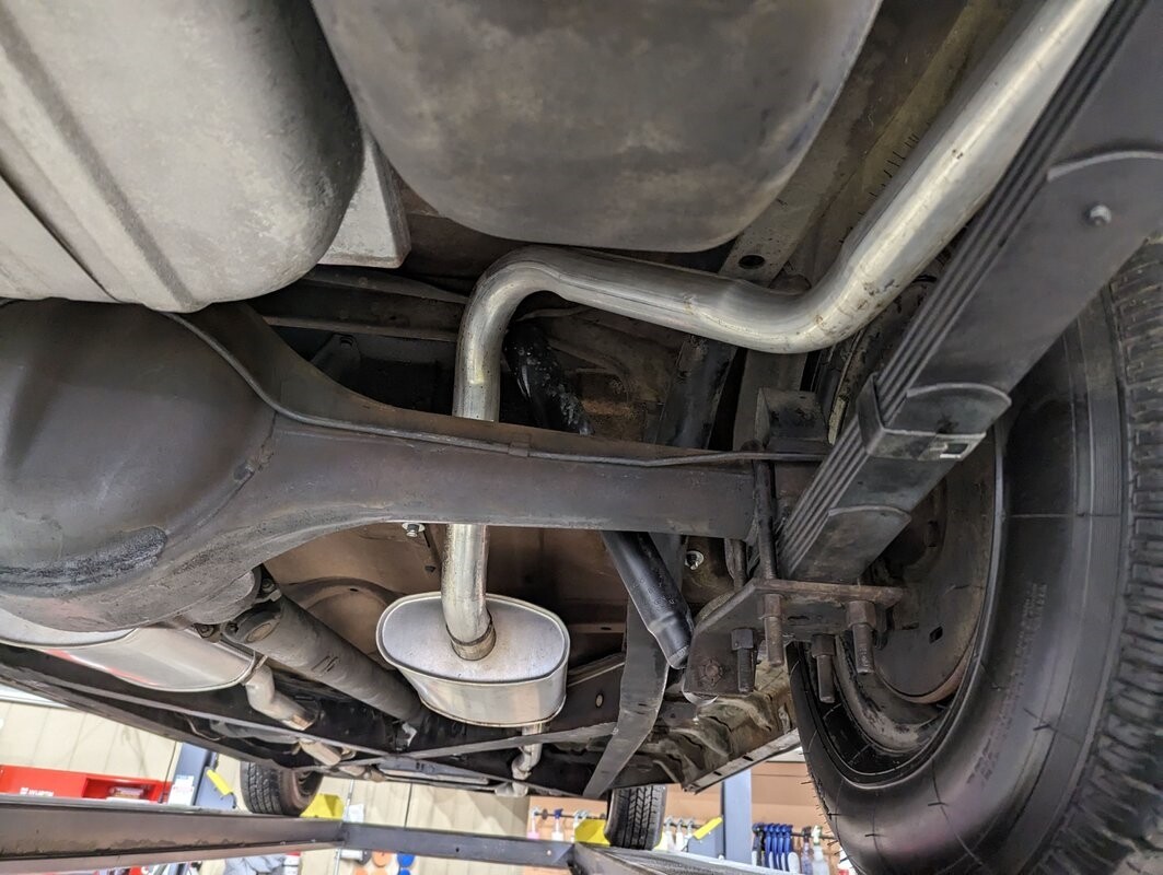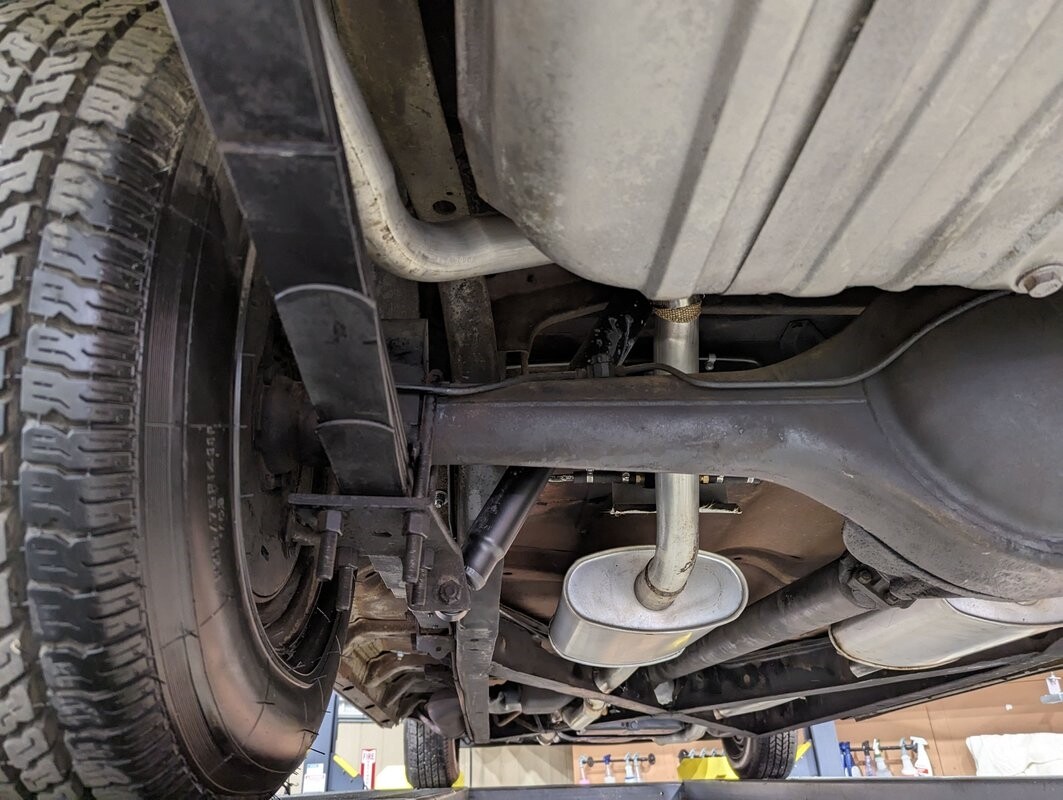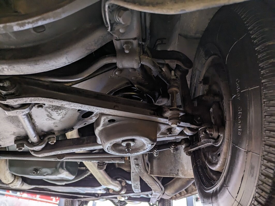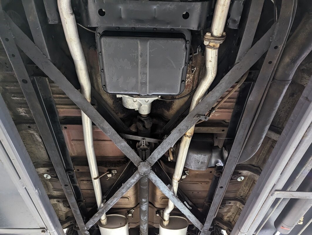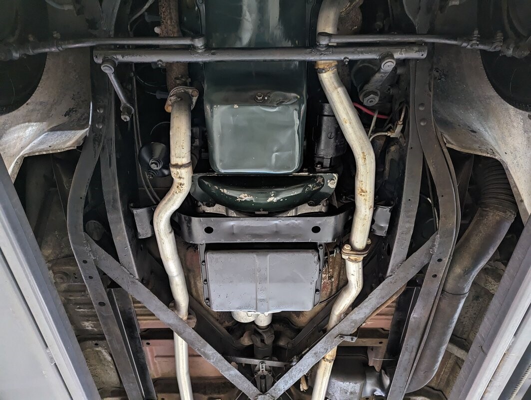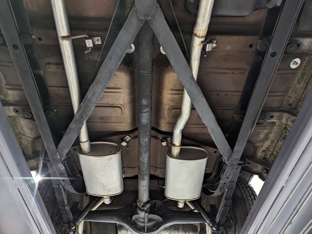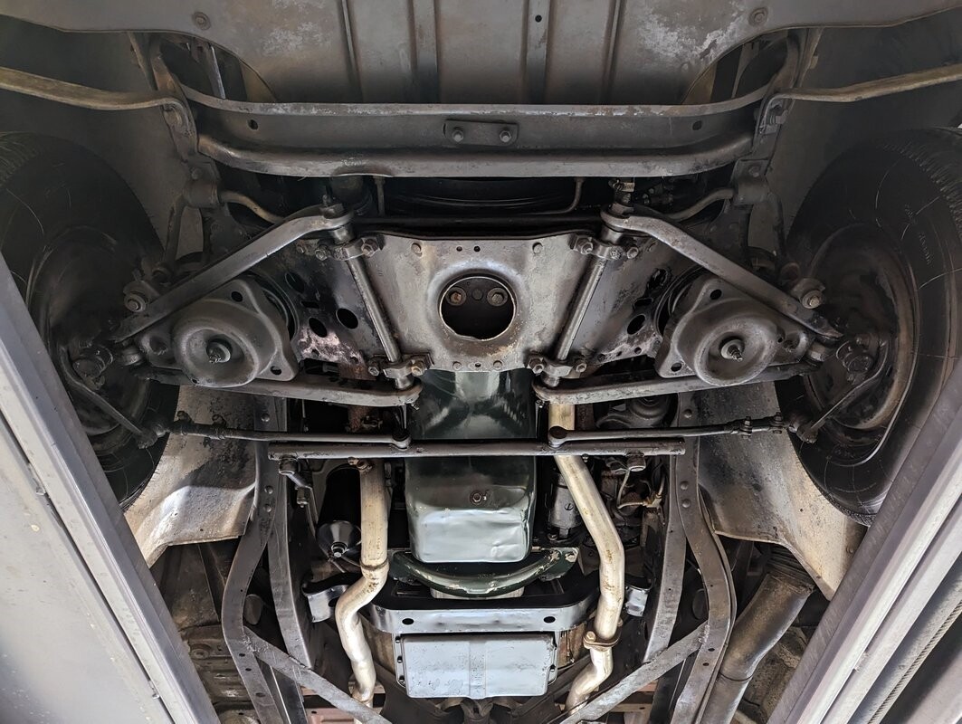 UNDERSIDE: It appears to be bone dry, rust-free original metal. It's still wearing its original primer and a little bit of undercoat that it left the factory with. It has been maintained as needed. The shocks look new, dual exhaust system looks recent; fuel tank is clean. Looking up at the motor it's actually very clean and so is the Hydramatic transmission. It very probable it has been rebuilt or serviced.
