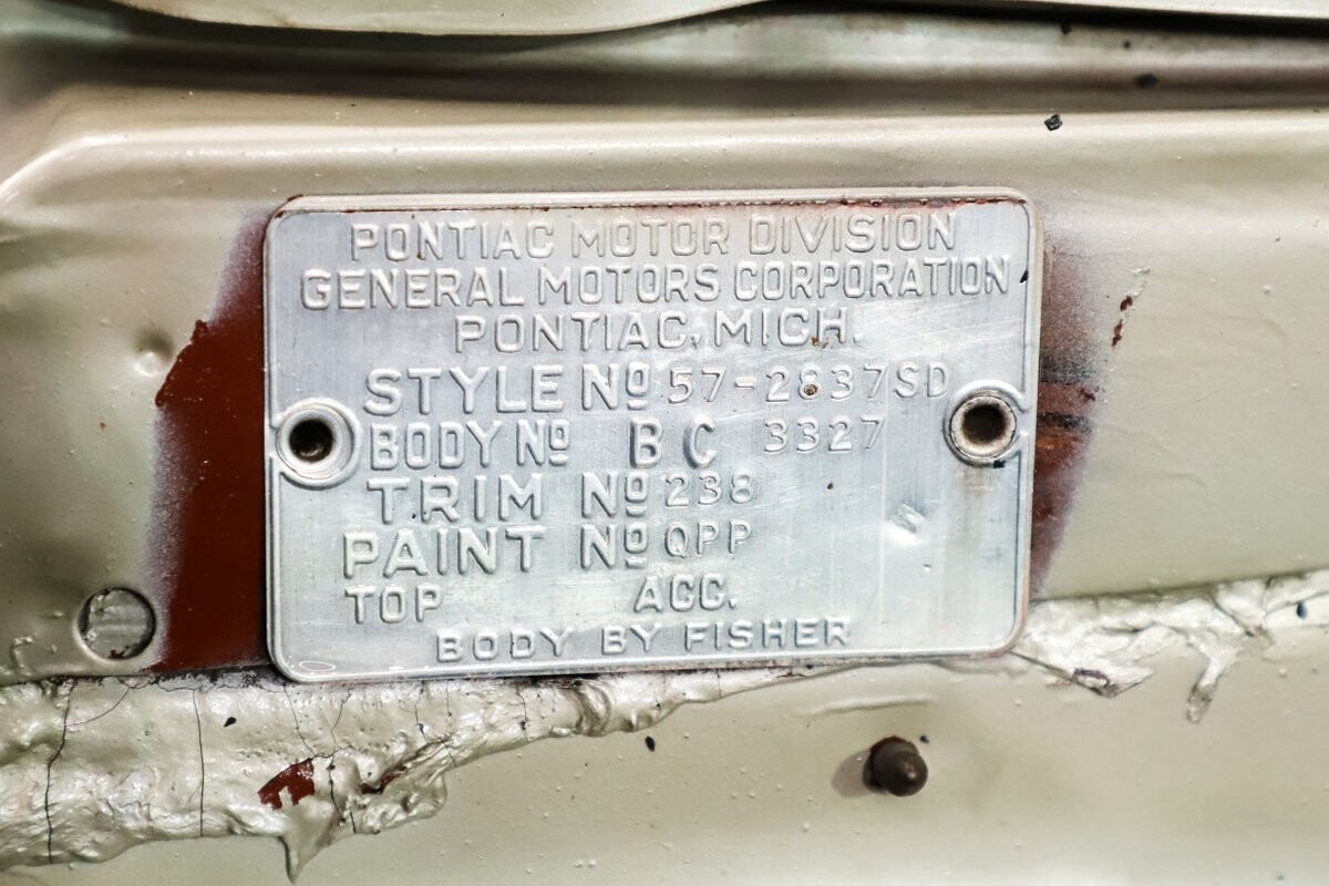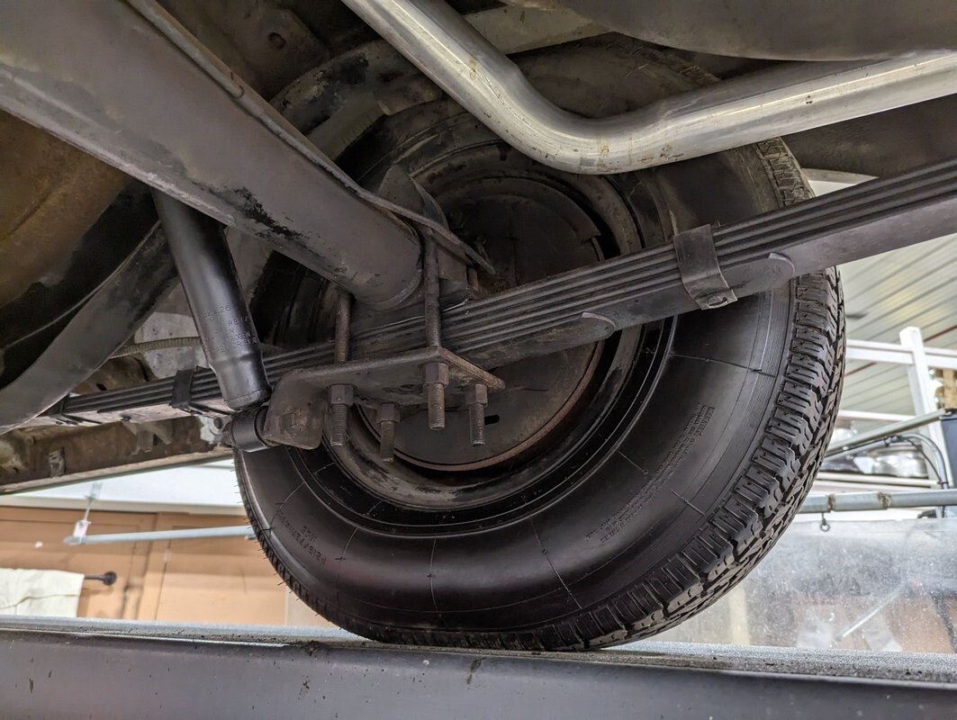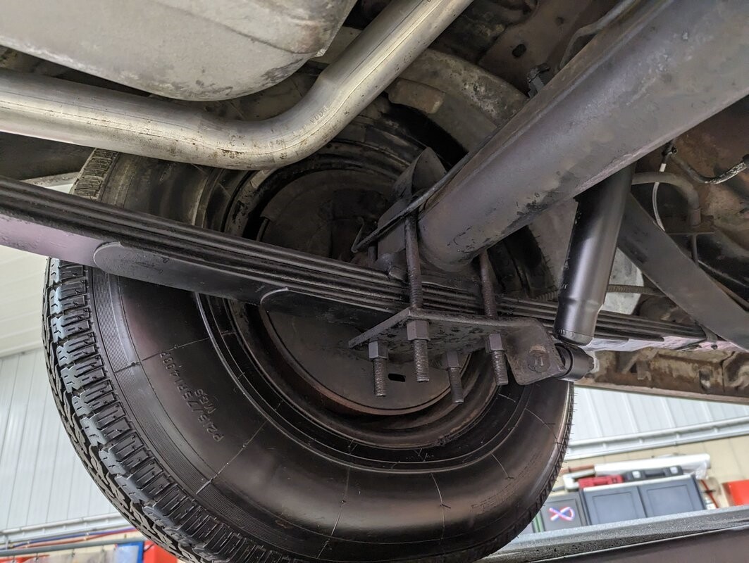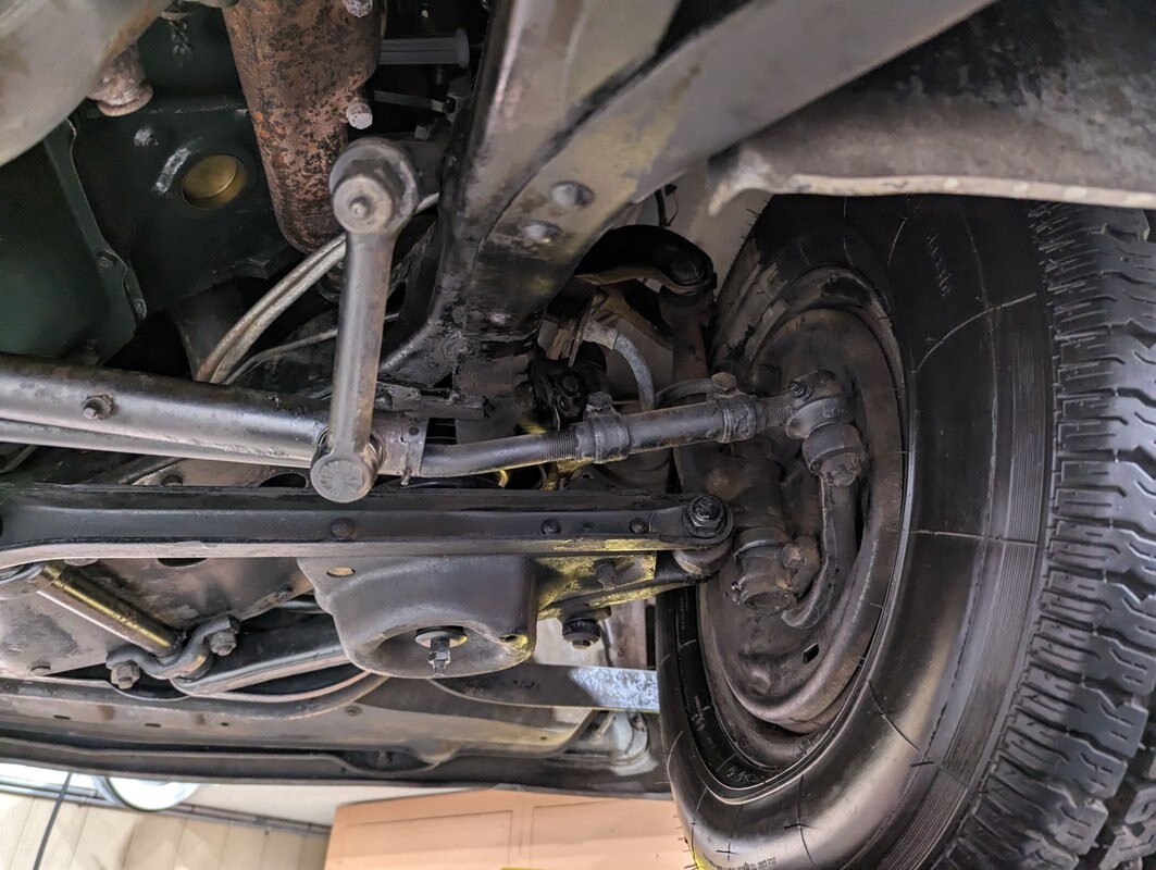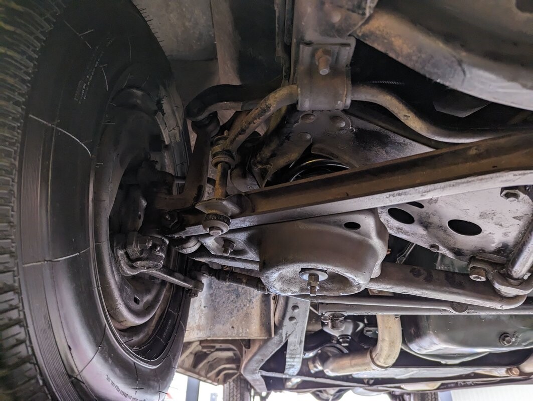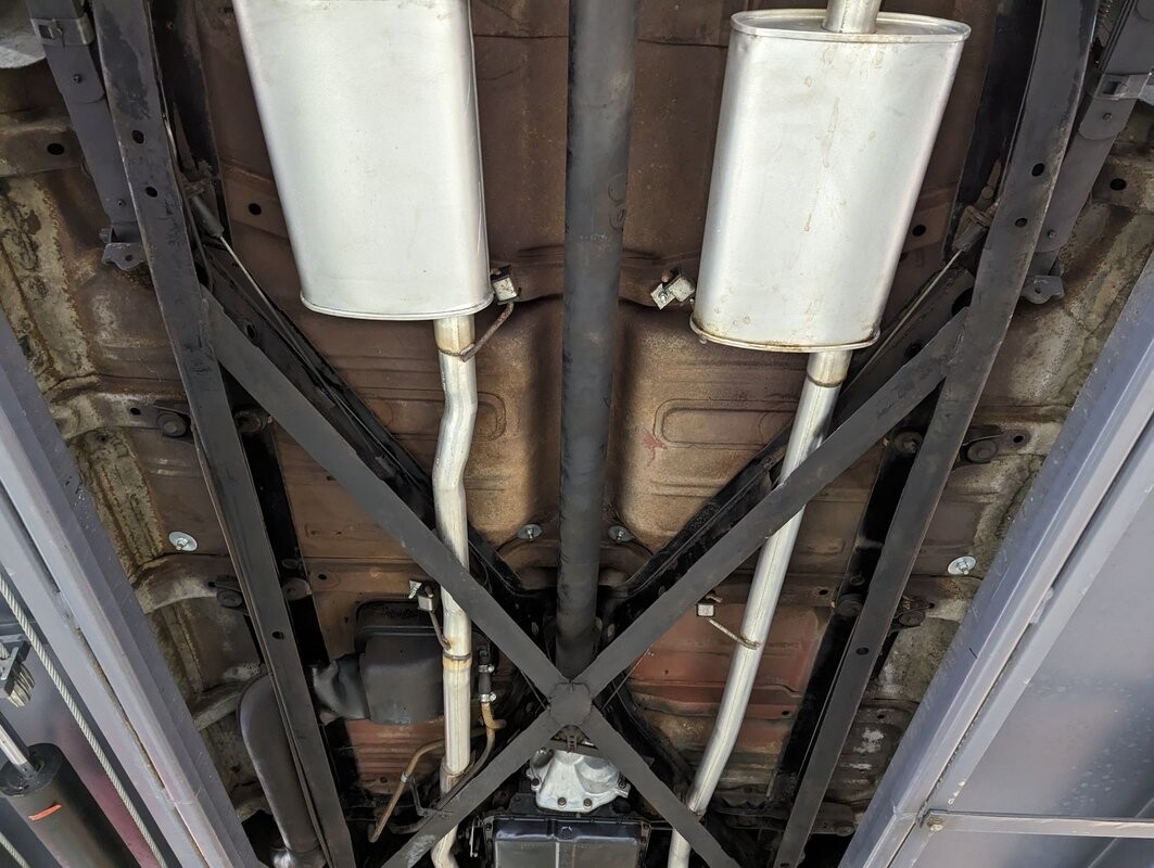 UNDERSIDE: It appears to be bone dry, rust-free original metal. It's still wearing its original primer and a little bit of undercoat that it left the factory with. It has been maintained as needed. The shocks look new, dual exhaust system looks recent; fuel tank is clean. Looking up at the motor it's actually very clean and so is the Hydramatic transmission. It very probable it has been rebuilt or serviced.