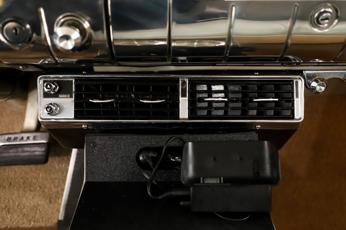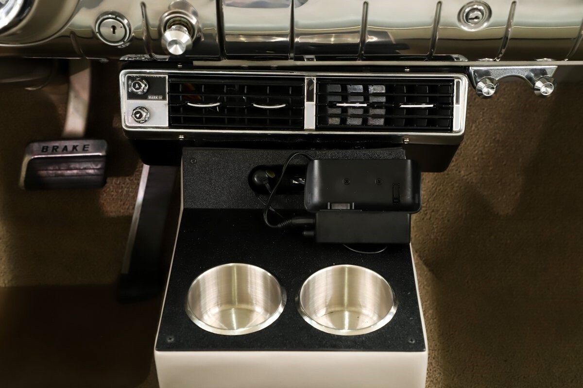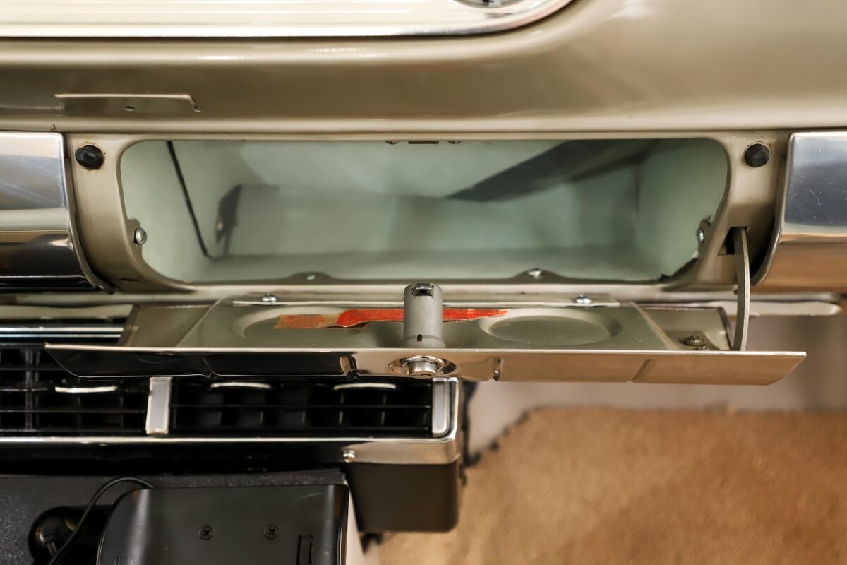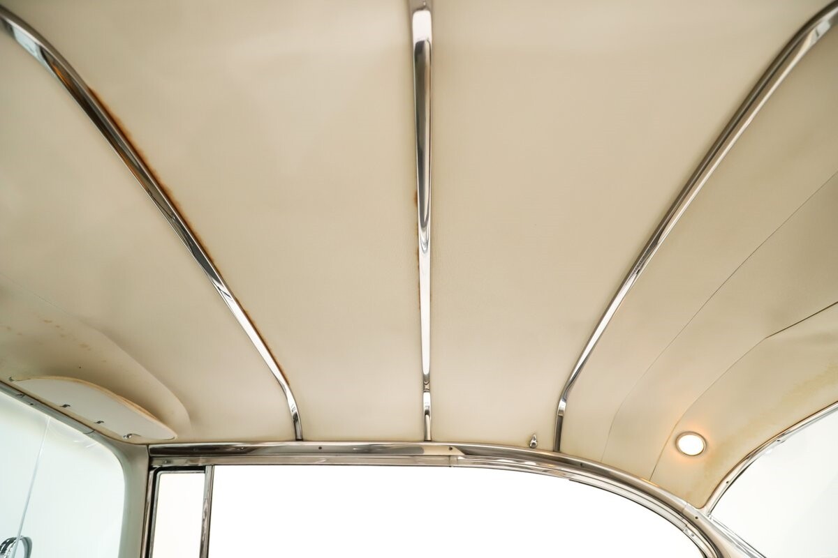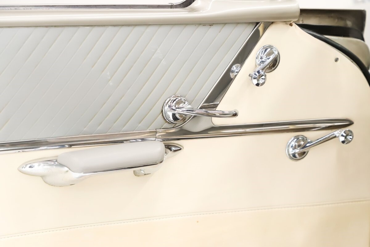 INTERIOR: It's impressive inside too, no shortage of chrome! The seat was reupholstered in glove soft leather using the correct patterns. New carpet. Very good original door panels. Original headliner has a seam that came apart. Looking at the dash it is very clean original condition. The original radio has a stereo conversion internally, the clock and interior lights work. The air conditioning was neatly installed under the dash. Seat belts were added front and back. It also has a removable console in front and armrest in back.
