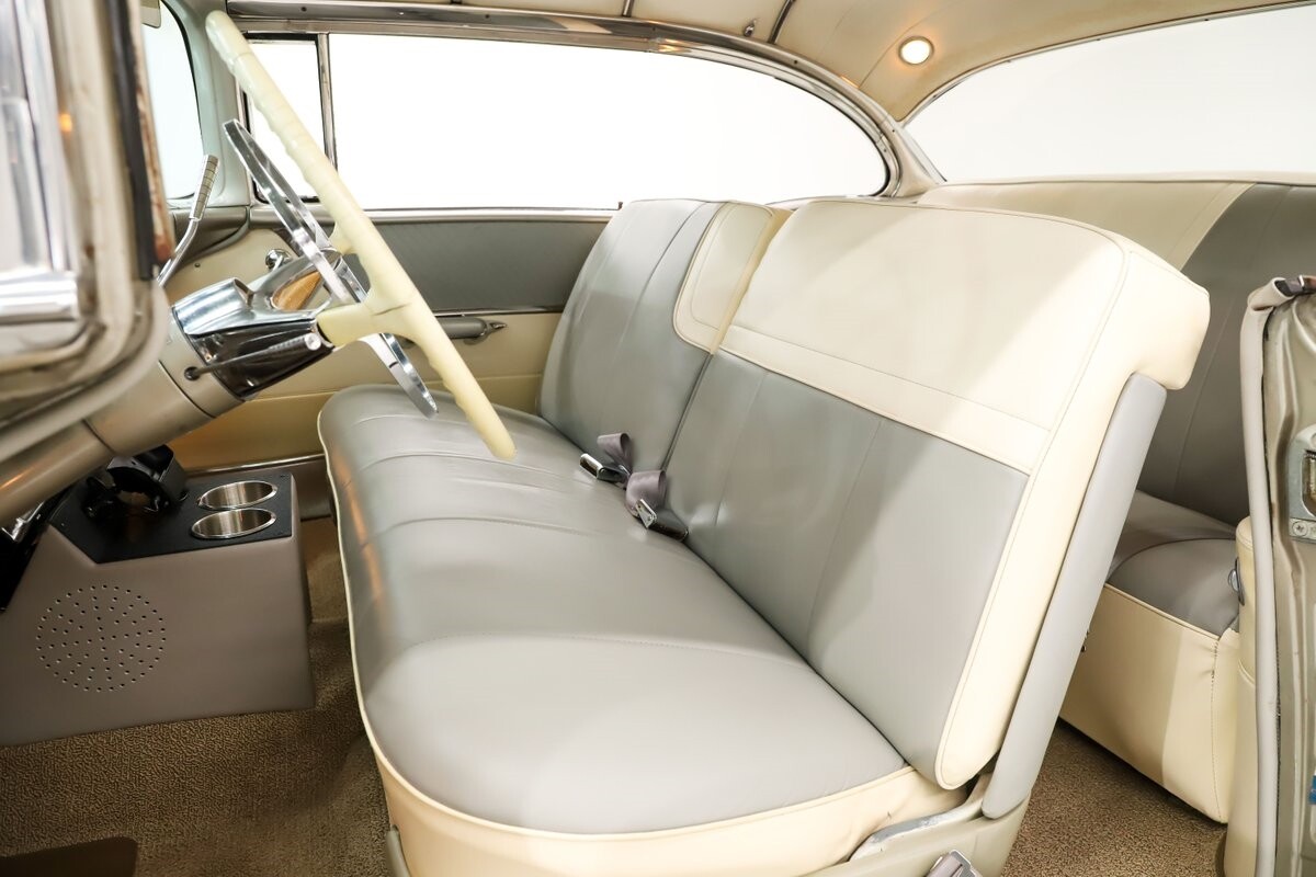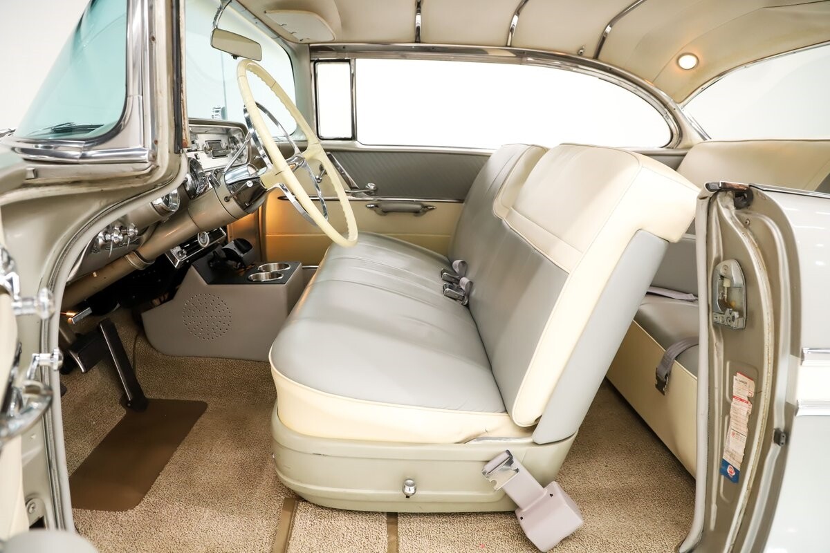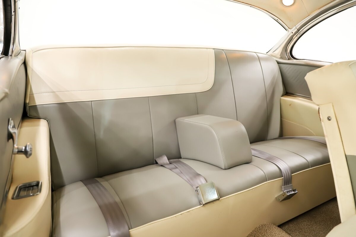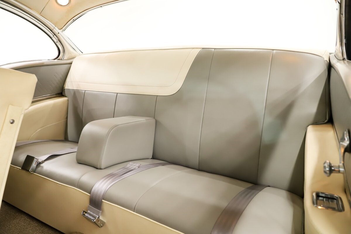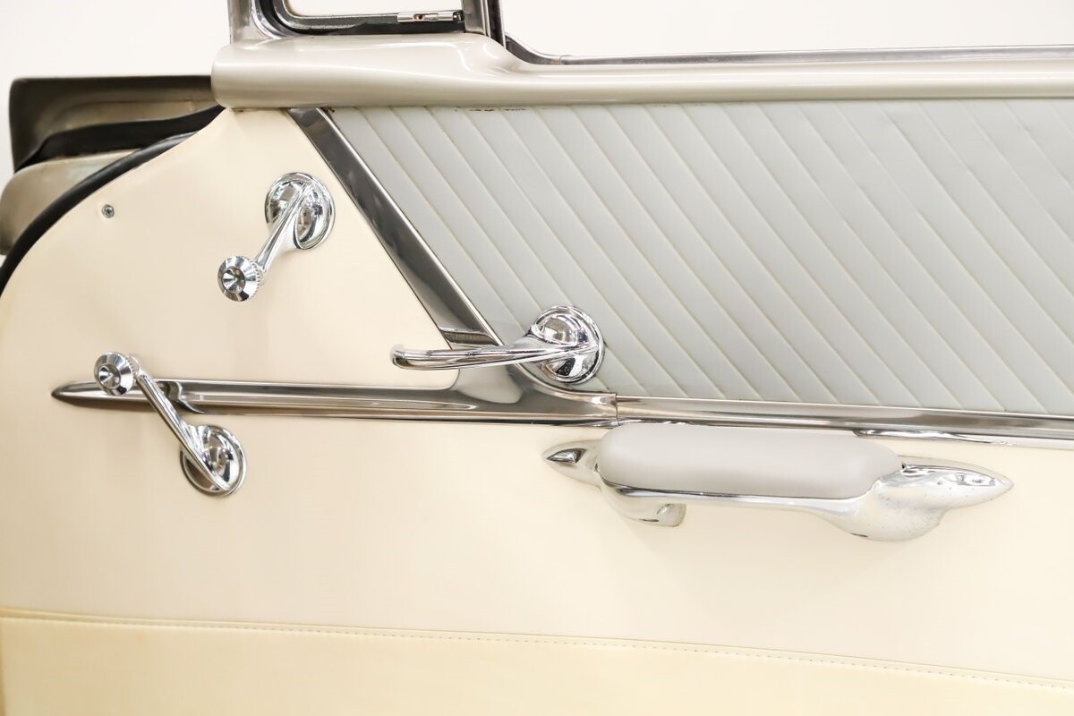 INTERIOR: It's impressive inside too, no shortage of chrome! The seat was reupholstered in glove soft leather using the correct patterns. New carpet. Very good original door panels. Original headliner has a seam that came apart. Looking at the dash it is very clean original condition. The original radio has a stereo conversion internally, the clock and interior lights work. The air conditioning was neatly installed under the dash. Seat belts were added front and back. It also has a removable console in front and armrest in back.