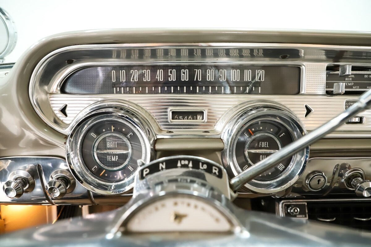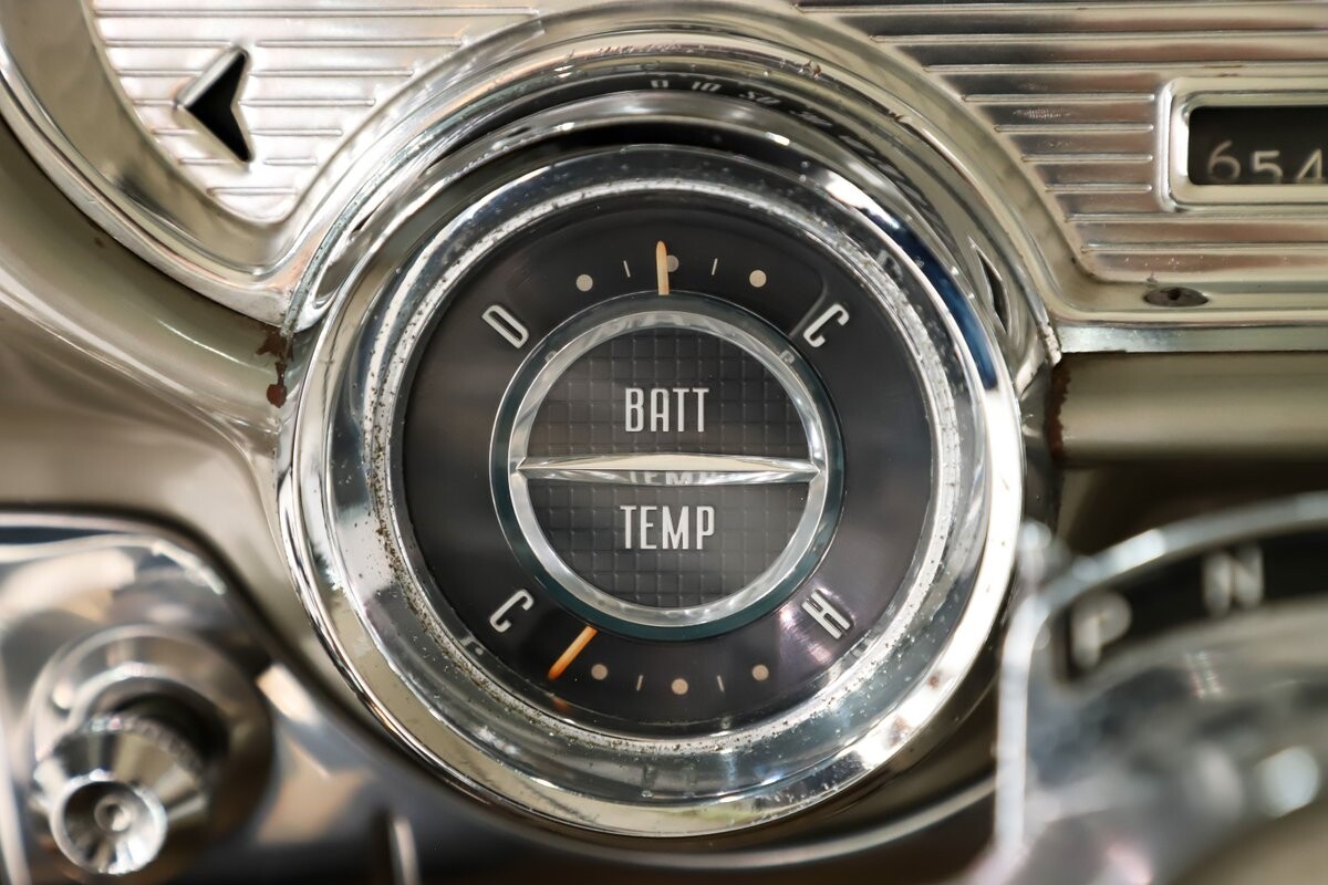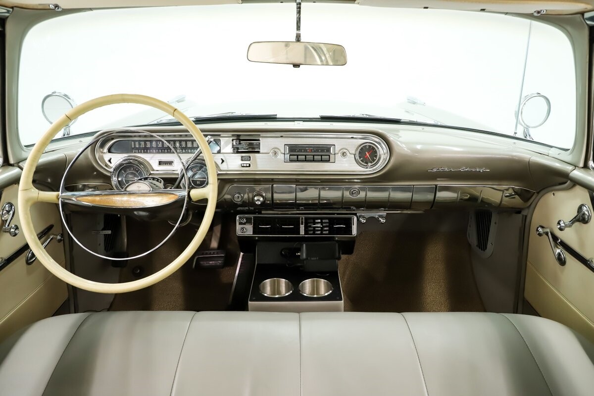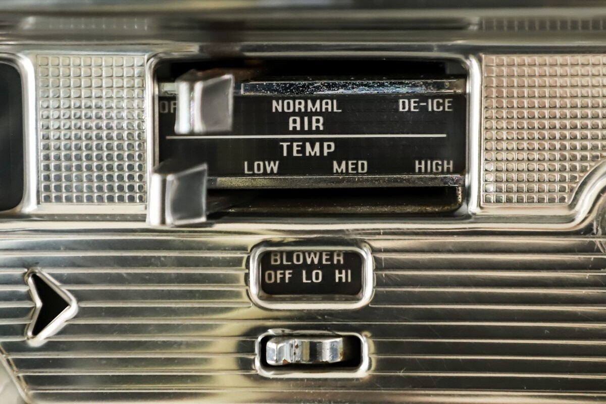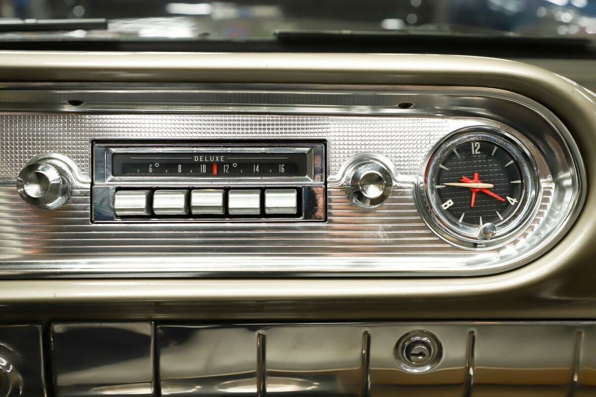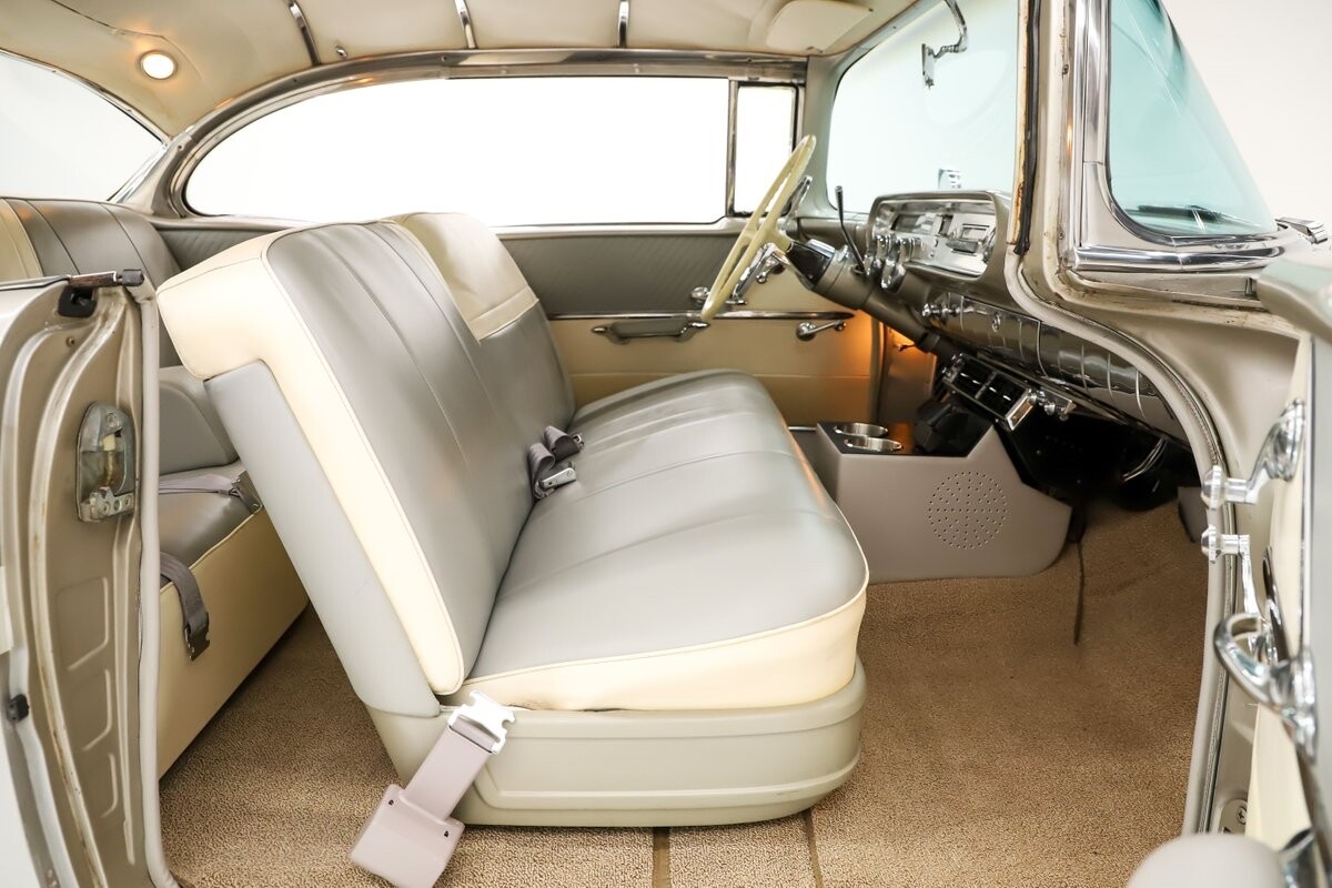 INTERIOR: It's impressive inside too, no shortage of chrome! The seat was reupholstered in glove soft leather using the correct patterns. New carpet. Very good original door panels. Original headliner has a seam that came apart. Looking at the dash it is very clean original condition. The original radio has a stereo conversion internally, the clock and interior lights work. The air conditioning was neatly installed under the dash. Seat belts were added front and back. It also has a removable console in front and armrest in back.