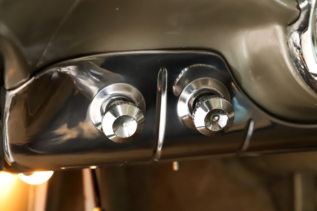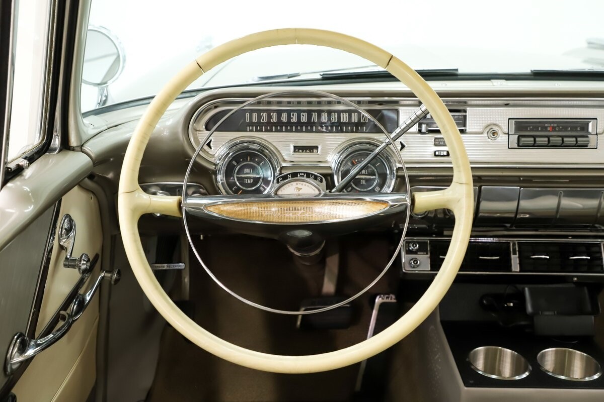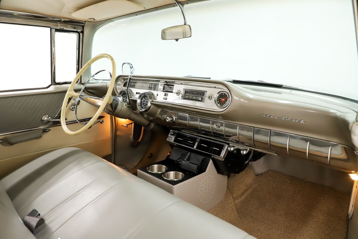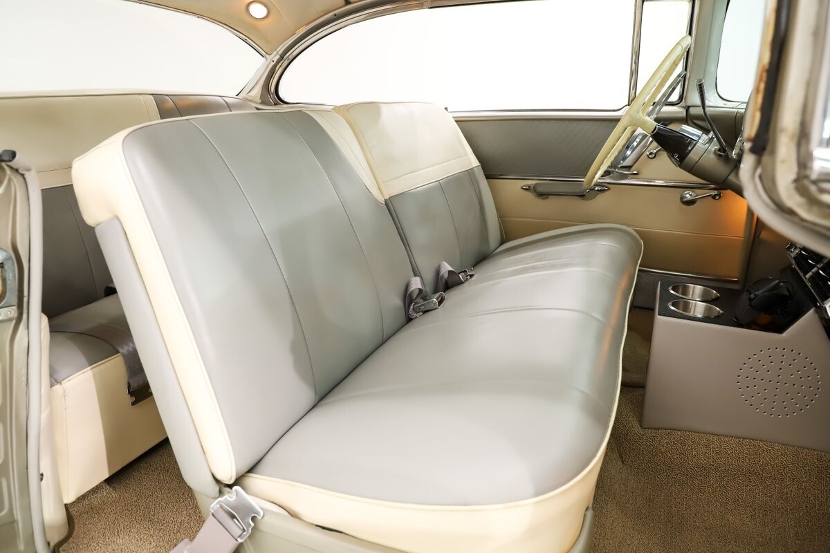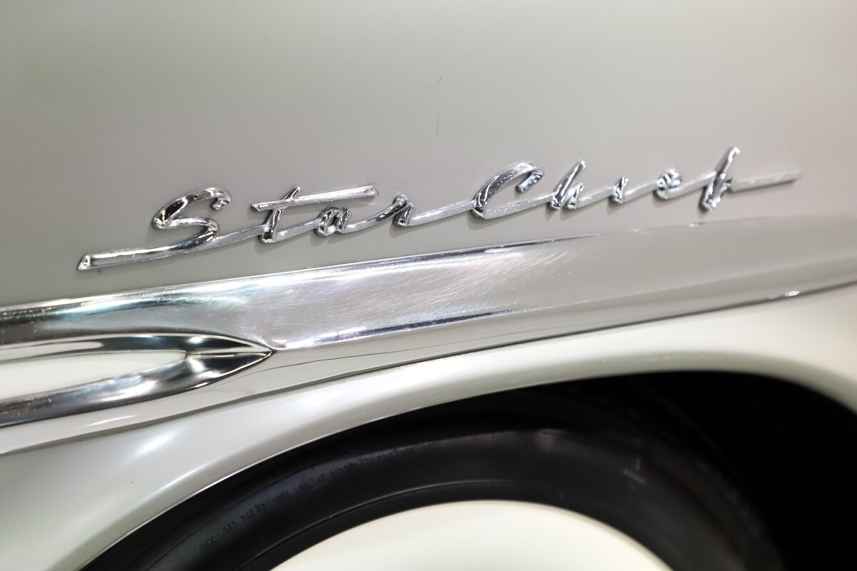 INTERIOR: It's impressive inside too, no shortage of chrome! The seat was reupholstered in glove soft leather using the correct patterns. New carpet. Very good original door panels. Original headliner has a seam that came apart. Looking at the dash it is very clean original condition. The original radio has a stereo conversion internally, the clock and interior lights work. The air conditioning was neatly installed under the dash. Seat belts were added front and back. It also has a removable console in front and armrest in back.