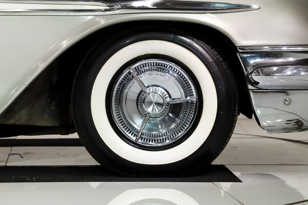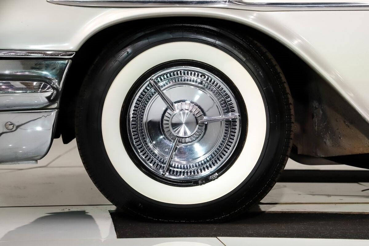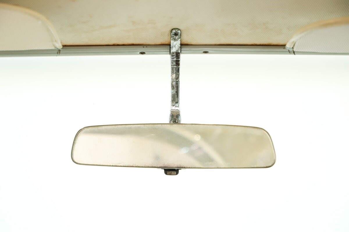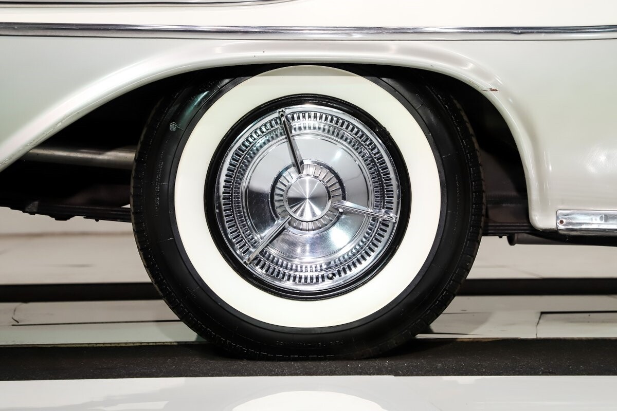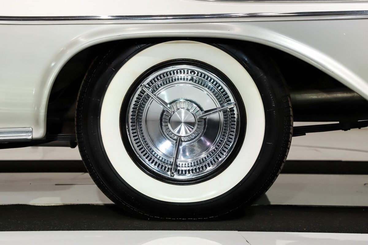 EXTERIOR: Very handsome design, it's big yet stylish. Excellent, rust-free original body. Really, the body is mint. The doors click shut effortlessly. It is claimed to have original paint, but I think it has been partially repainted. The jambs are still original paint with paper oil change stickers from the 70s! The paint shows very well but has gentle patina. There is an abundance of chrome, and it is all original, it is still straight and shiny but also has patina. The original spinner hubcaps are wrapped in radial whitewalls.