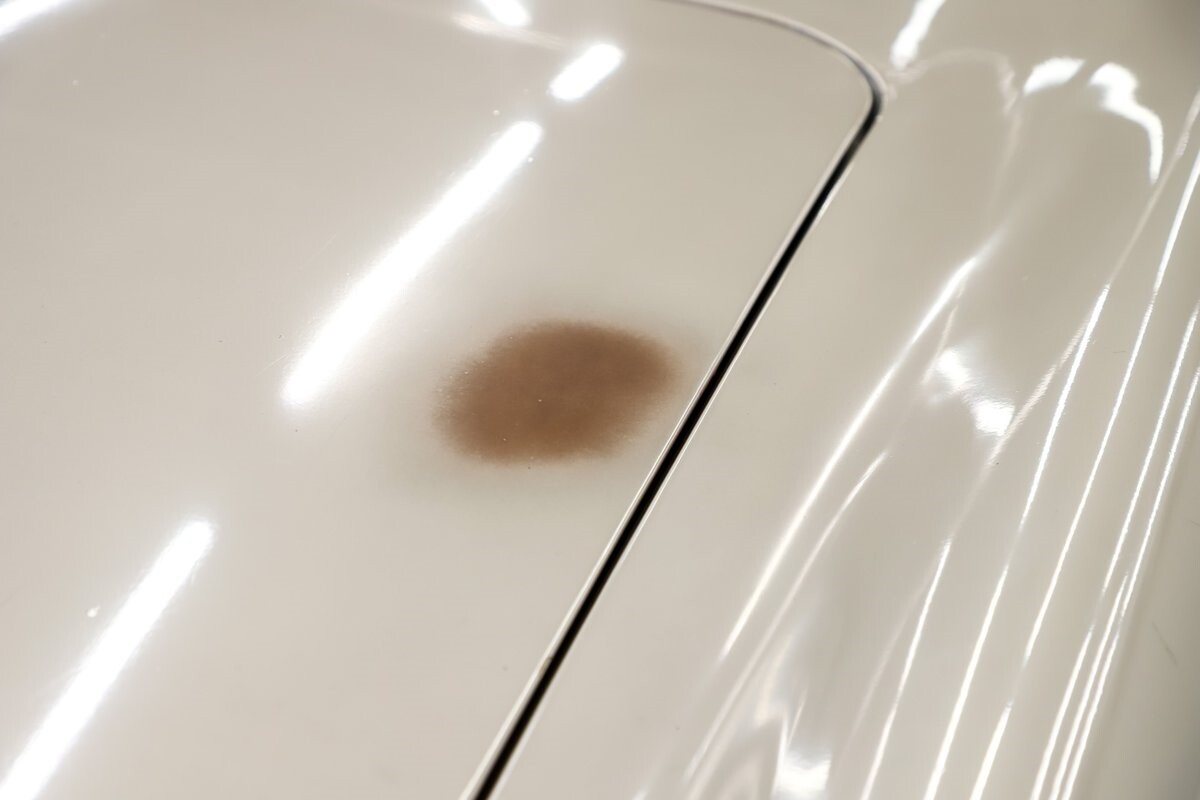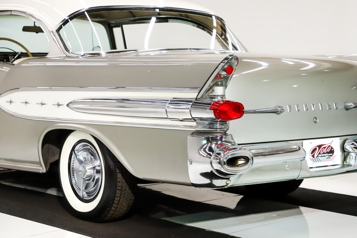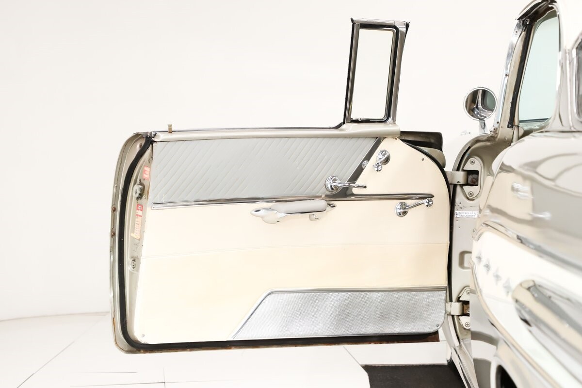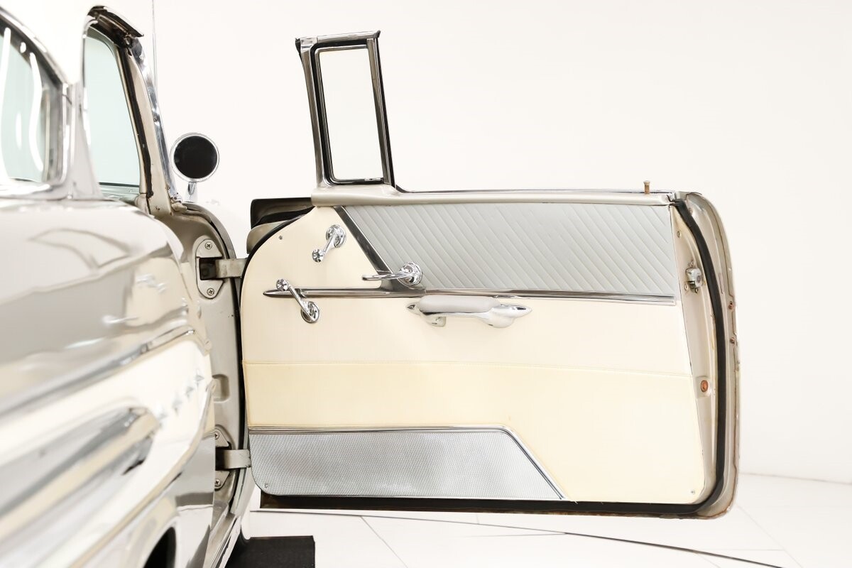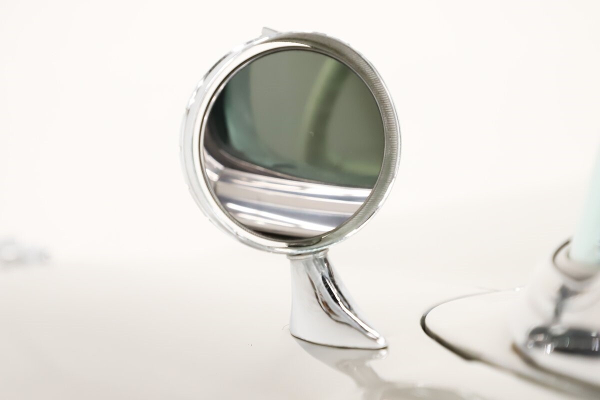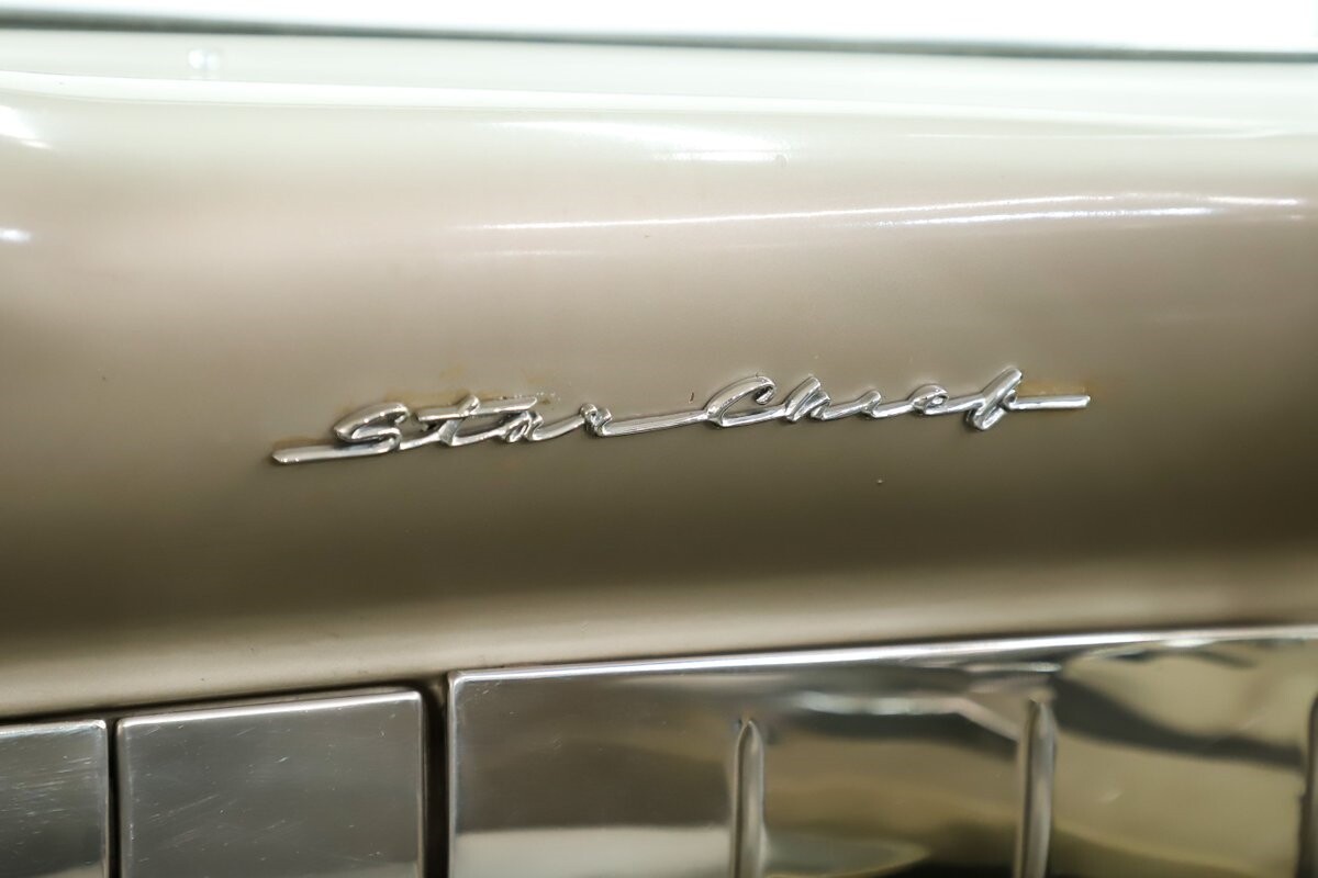 EXTERIOR: Very handsome design, it's big yet stylish. Excellent, rust-free original body. Really, the body is mint. The doors click shut effortlessly. It is claimed to have original paint, but I think it has been partially repainted. The jambs are still original paint with paper oil change stickers from the 70s! The paint shows very well but has gentle patina. There is an abundance of chrome, and it is all original, it is still straight and shiny but also has patina. The original spinner hubcaps are wrapped in radial whitewalls.