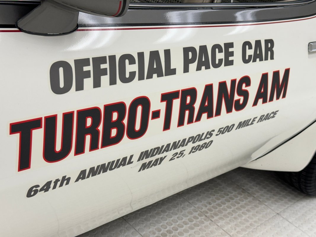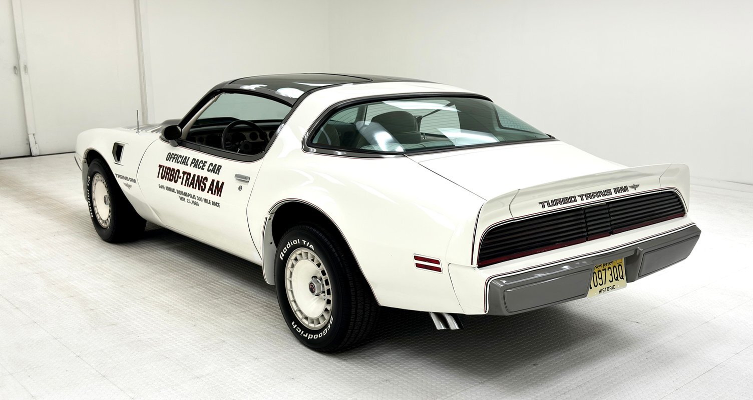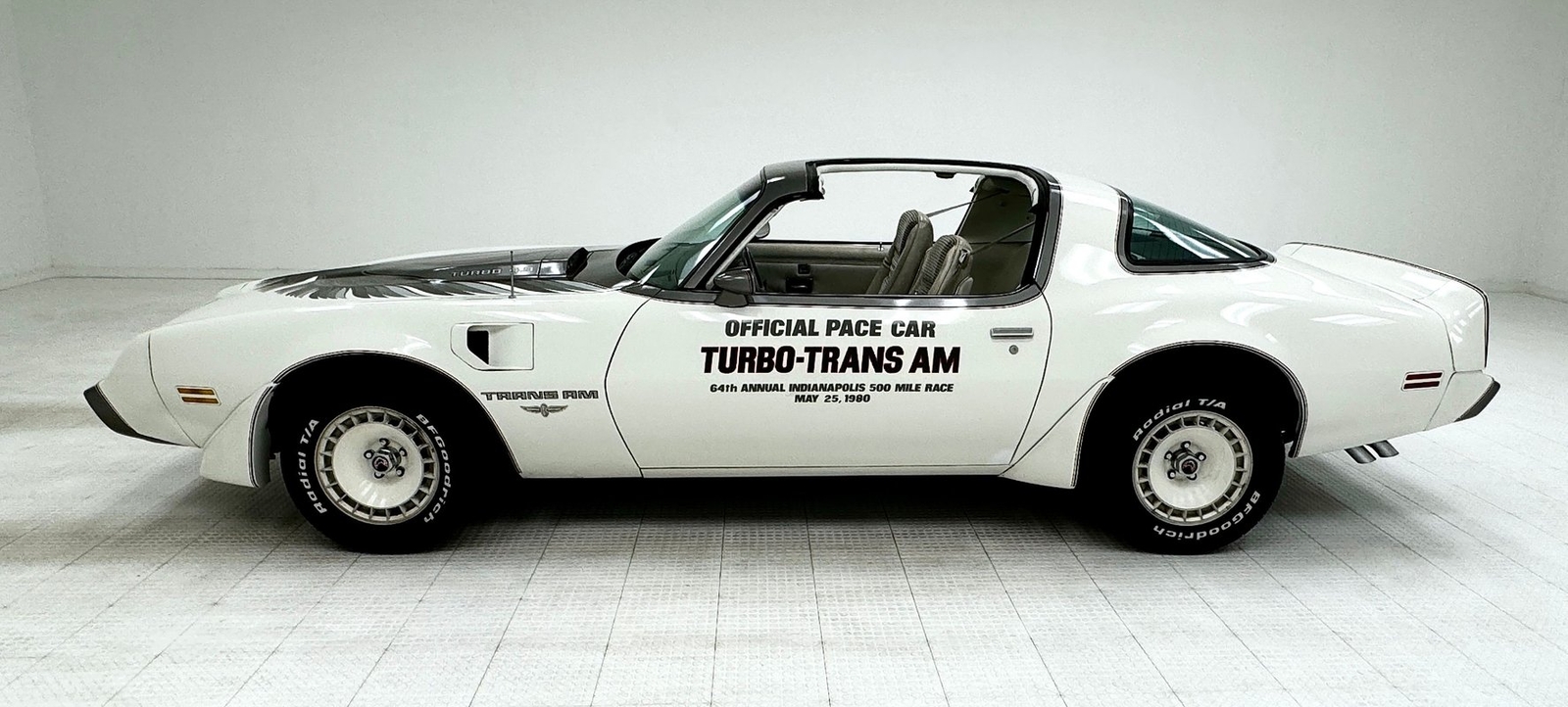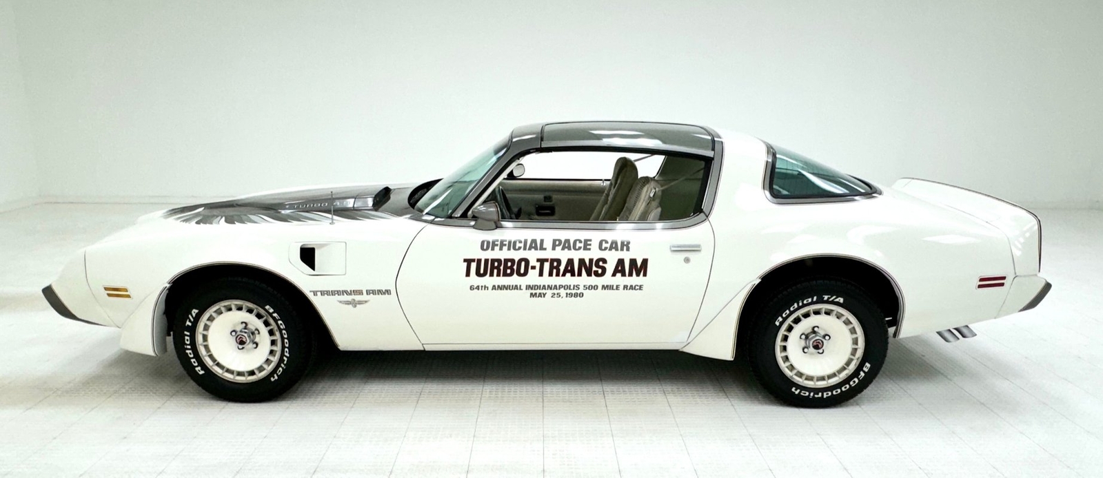 For consignment, a 1980 Pontiac Firebird Turbo Trans Am with a special pace car paint scheme, and designation printed on the doors. For the turbo version, Trans Am's notorious shaker hood was replaced with an asymmetrical flowing rise in the hood, a great design that was so good, it would reappear in the next generation of Trans Ams.