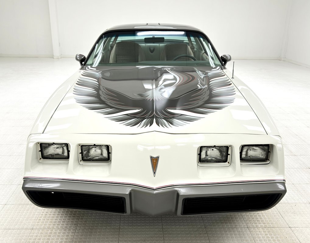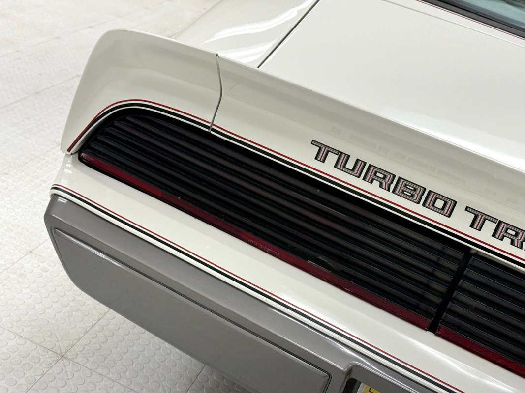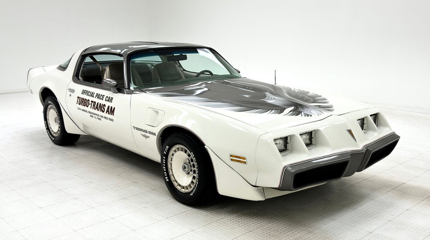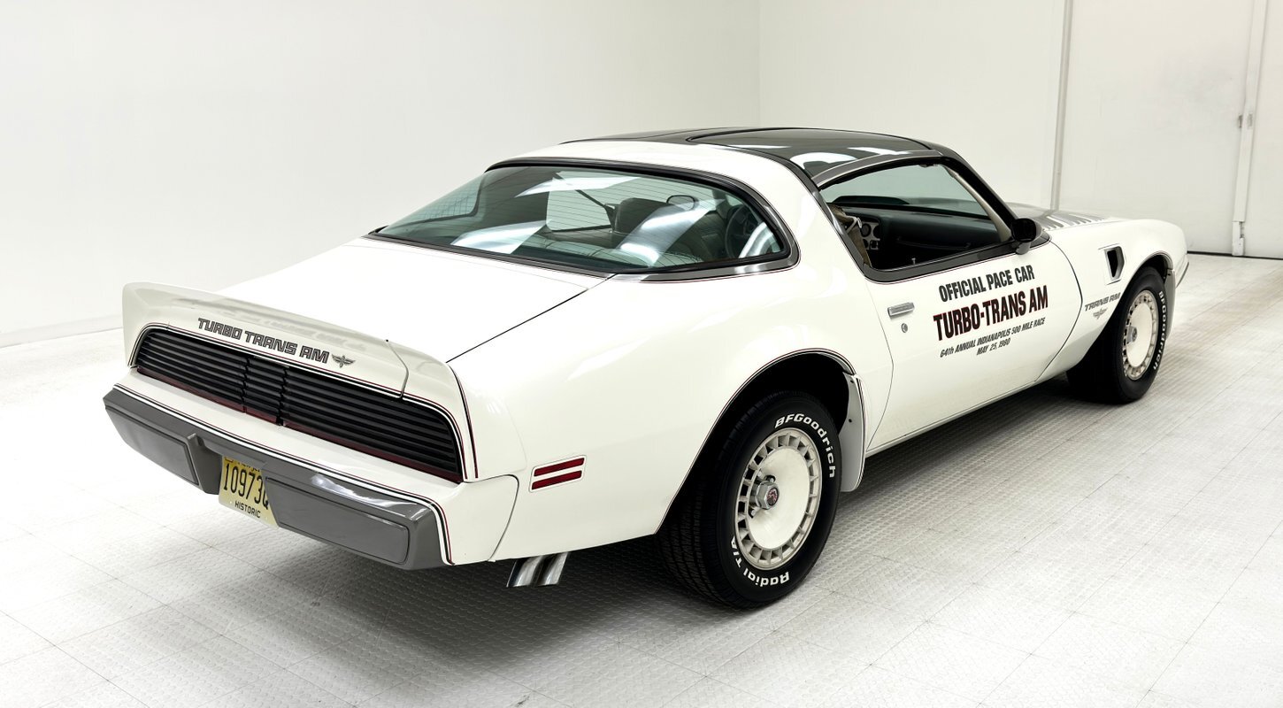 For consignment, a 1980 Pontiac Firebird Turbo Trans Am with a special pace car paint scheme, and designation printed on the doors. For the turbo version, Trans Am's notorious shaker hood was replaced with an asymmetrical flowing rise in the hood, a great design that was so good, it would reappear in the next generation of Trans Ams.