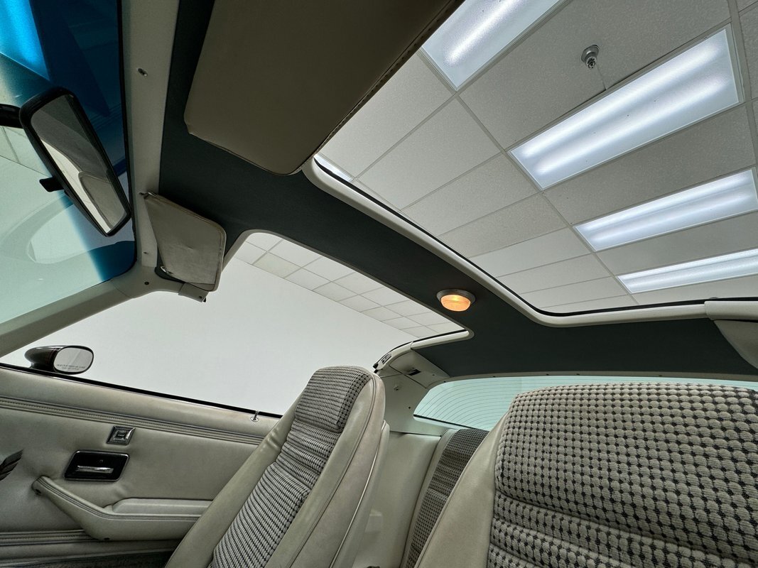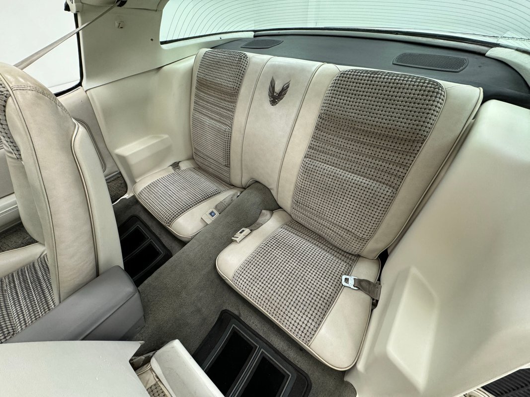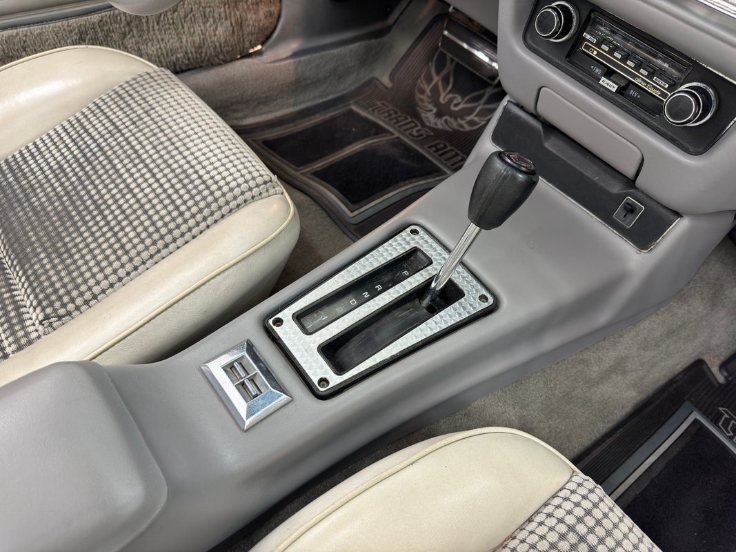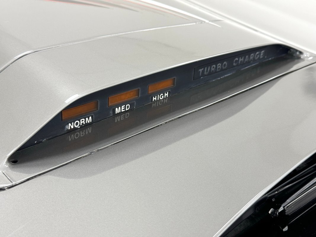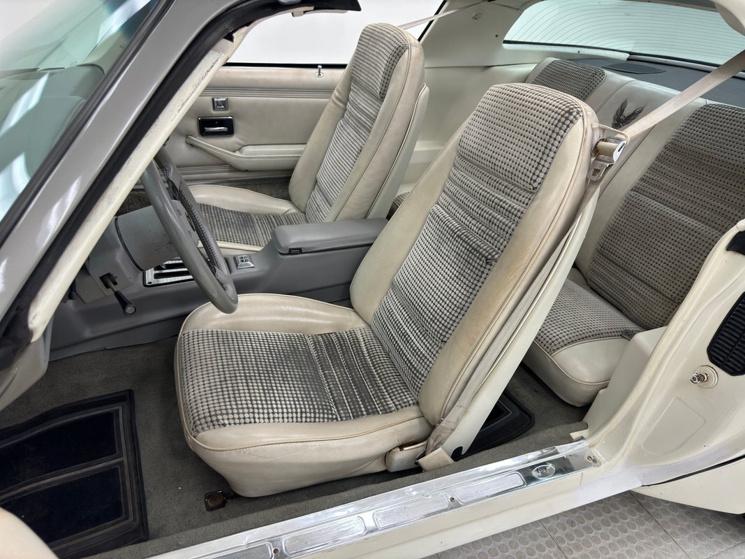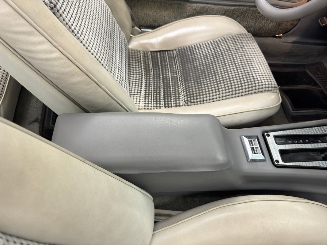 Oyster gray vinyl over the gray carpeted footer is presented in standard Trans Am door panel configuration for the period, and the carpet shows a bit of age. Oyster cloth seats are also in standard configuration and register wear as when the checkered black pattern begins to merge, as seen on the seat of the driver's side. Aftermarket covers are available if the new owner chooses to go in that direction. As is, they are not torn, and the back seats look fantastic with the screaming chicken embroidered on the center panel. Gray leather wraps the sport steering wheel mounted on GM's widely used steering column in front of the turned metal dash where standard gauges fall in a line and an added Sunpro boost gauge has been added. Climate controls also fall within the turned metal area while down lower, an AM/FM/Cassette radio is situated over the ashtray. Turned metal applique also covers the shifter plate in the center console followed by window switches and an armrest over the storage bin, all in great shape. Gray plush carpet covers the floor and the T-tops look great and so does the frame around them. Showing a bit of usage, the trunk is lined with a gray mat and has space saver spare, jack, and T-top covers.