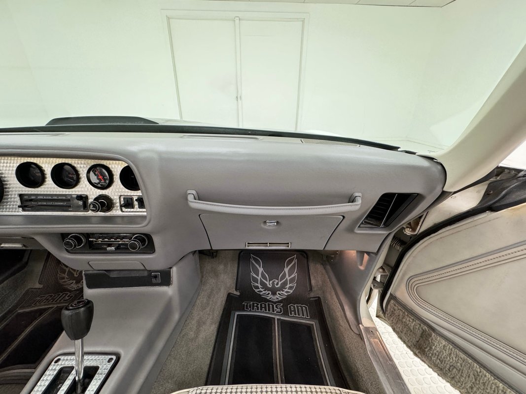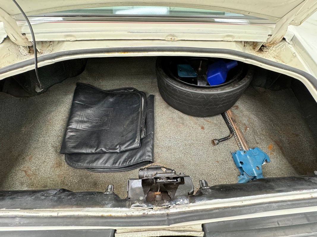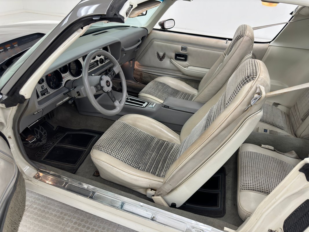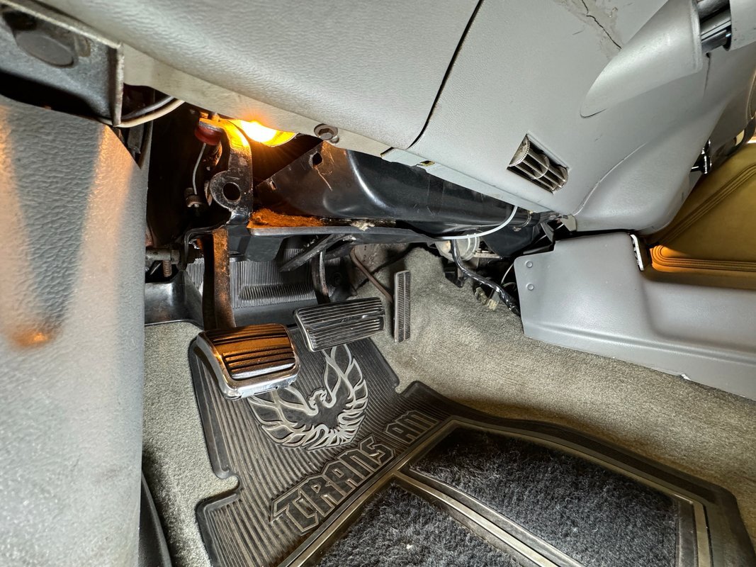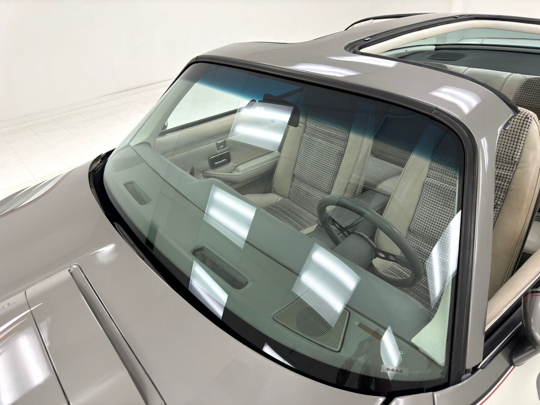 Oyster gray vinyl over the gray carpeted footer is presented in standard Trans Am door panel configuration for the period, and the carpet shows a bit of age. Oyster cloth seats are also in standard configuration and register wear as when the checkered black pattern begins to merge, as seen on the seat of the driver's side. Aftermarket covers are available if the new owner chooses to go in that direction. As is, they are not torn, and the back seats look fantastic with the screaming chicken embroidered on the center panel. Gray leather wraps the sport steering wheel mounted on GM's widely used steering column in front of the turned metal dash where standard gauges fall in a line and an added Sunpro boost gauge has been added. Climate controls also fall within the turned metal area while down lower, an AM/FM/Cassette radio is situated over the ashtray. Turned metal applique also covers the shifter plate in the center console followed by window switches and an armrest over the storage bin, all in great shape. Gray plush carpet covers the floor and the T-tops look great and so does the frame around them. Showing a bit of usage, the trunk is lined with a gray mat and has space saver spare, jack, and T-top covers.