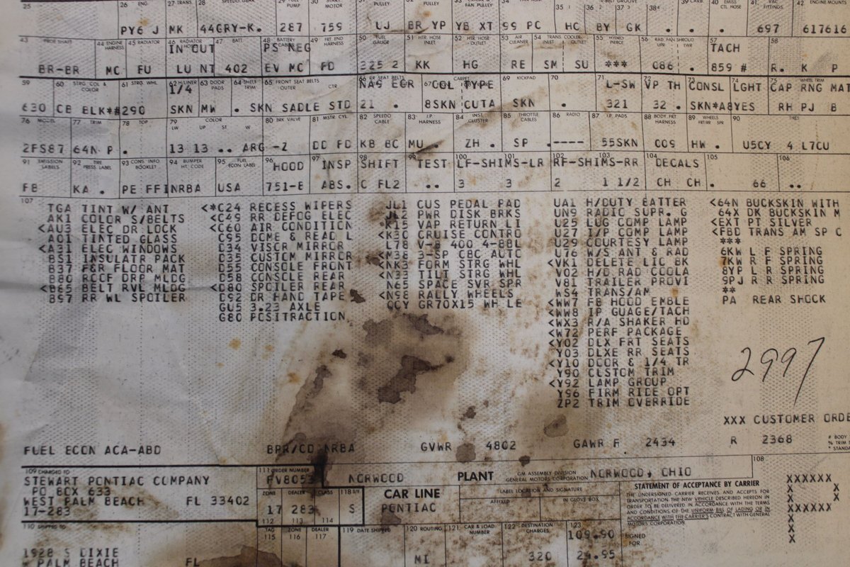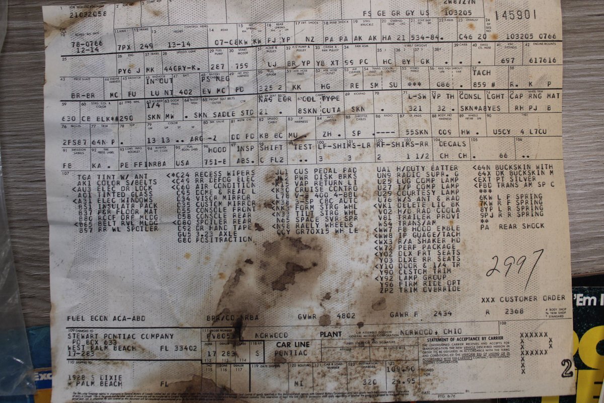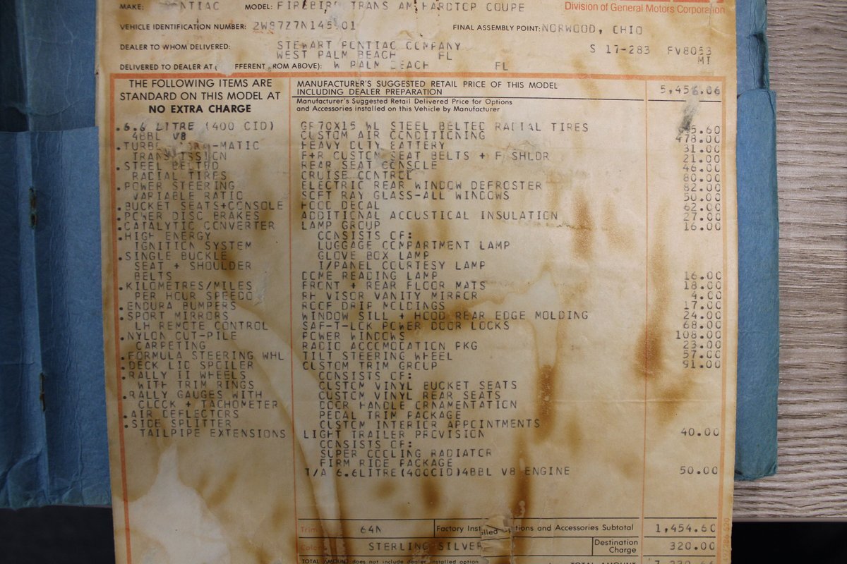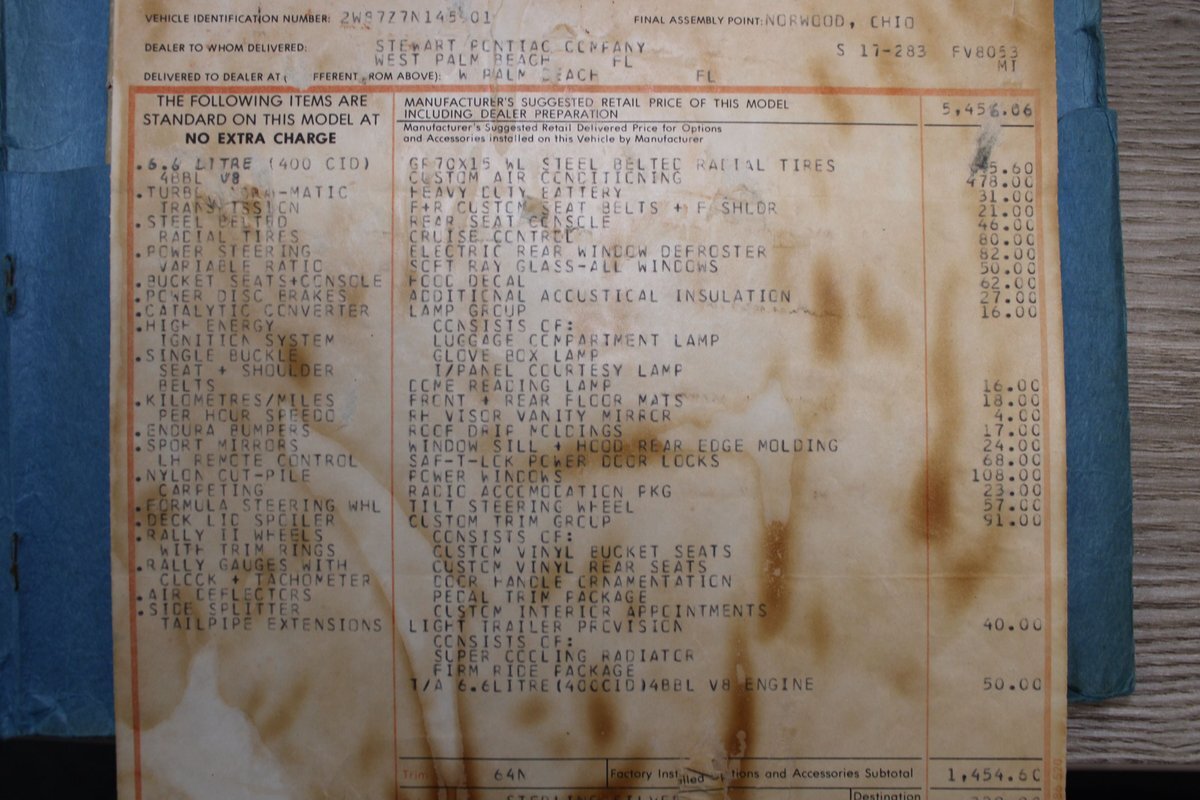 This highly original, two-owner example was optioned with power steering, power disc brakes, rear seat console, power windows, tilt column, and the T/A 6.6L 400ci four-barrel V8 engine. Also included are the original window sticker, build sheet, service records, lowered suspension, chassis bracing, an updated aluminum Holly intake manifold, along with a VSC oil pan and VSC wheels.