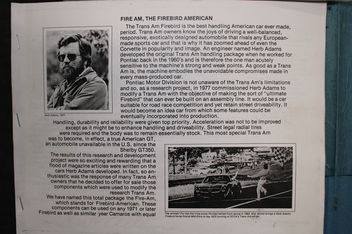 "What is a Fire Am?" and believe it or not that is a great question. The answer...It's everything the Trans Am could have been and should have been. In the height of the muscle car era, GM was turning out some of the best performance cars this world has ever known. A man by the name of Herb Adams was an automotive engineer and diehard racer and just happened to work for the GM Pontiac division. His contributions led to the now infamous Super Duty 455 engine, as well as the Ram Air V program. Perhaps his greatest contribution came after his official departure from Pontiac. On a contractual endeavor, Herb was brought in to conduct a performance-handling exercise of sorts. In 1977 Herb and his newly founded company VSE (Very Special Equipment) built 8 race-ready Trans Ams for Pontiac's IROC racing program. The program did not succeed at that time, but the improvements made to those 8 Trans Ams were not lost. Several of the key components went on to become the WS6 performance package in 1978. The rest of the improvements were deemed unsuitable for a production car and VSE was granted permission to offer those components themselves and the Fire Am was born.