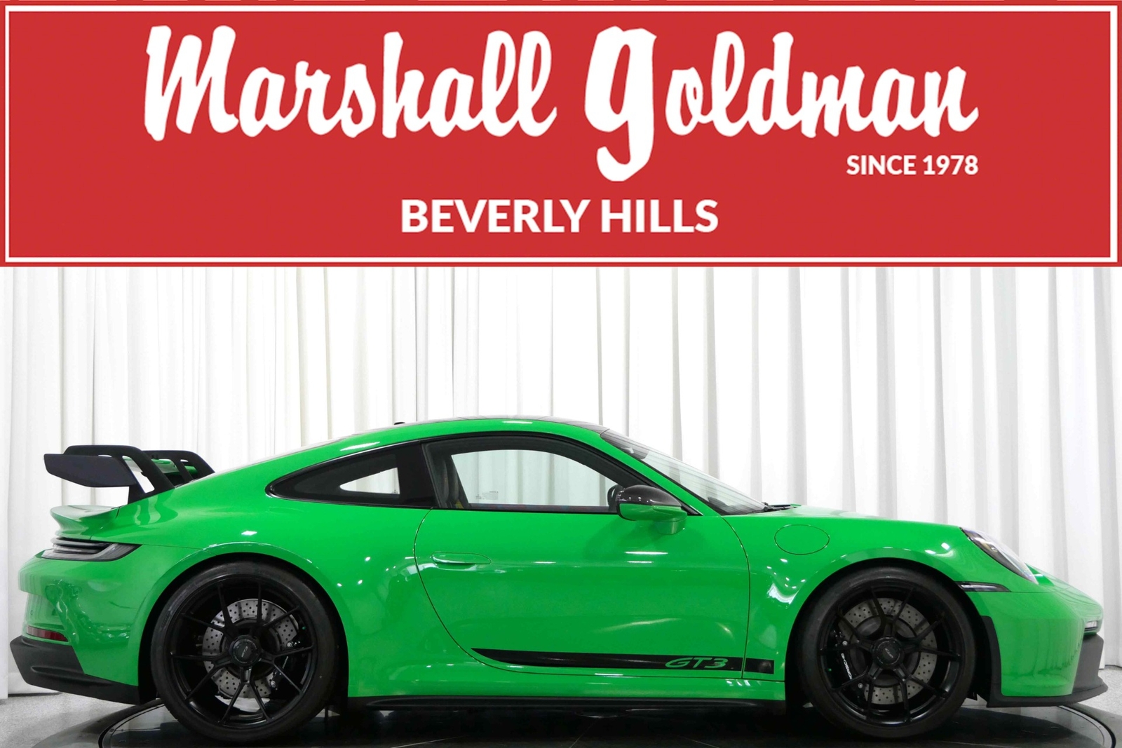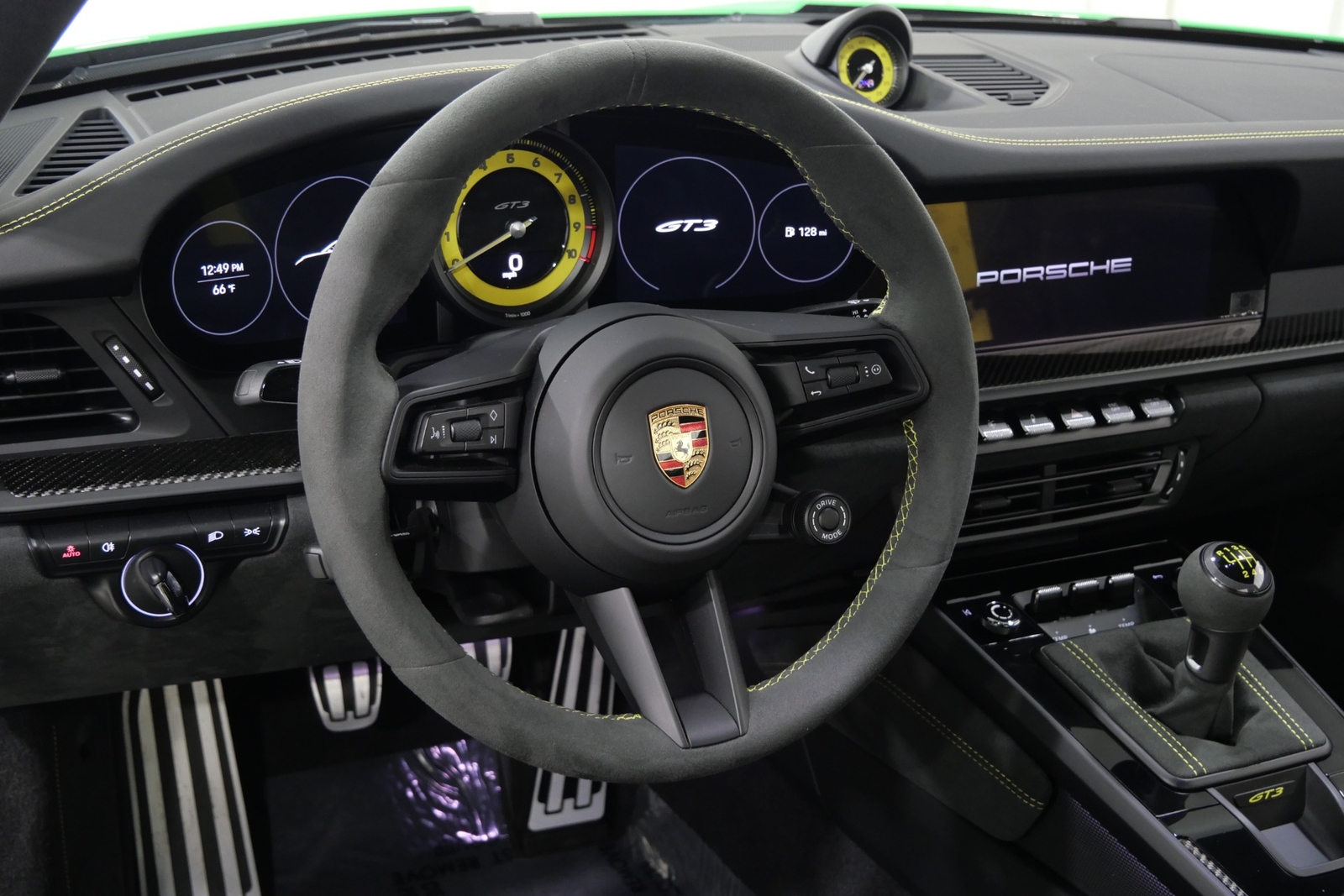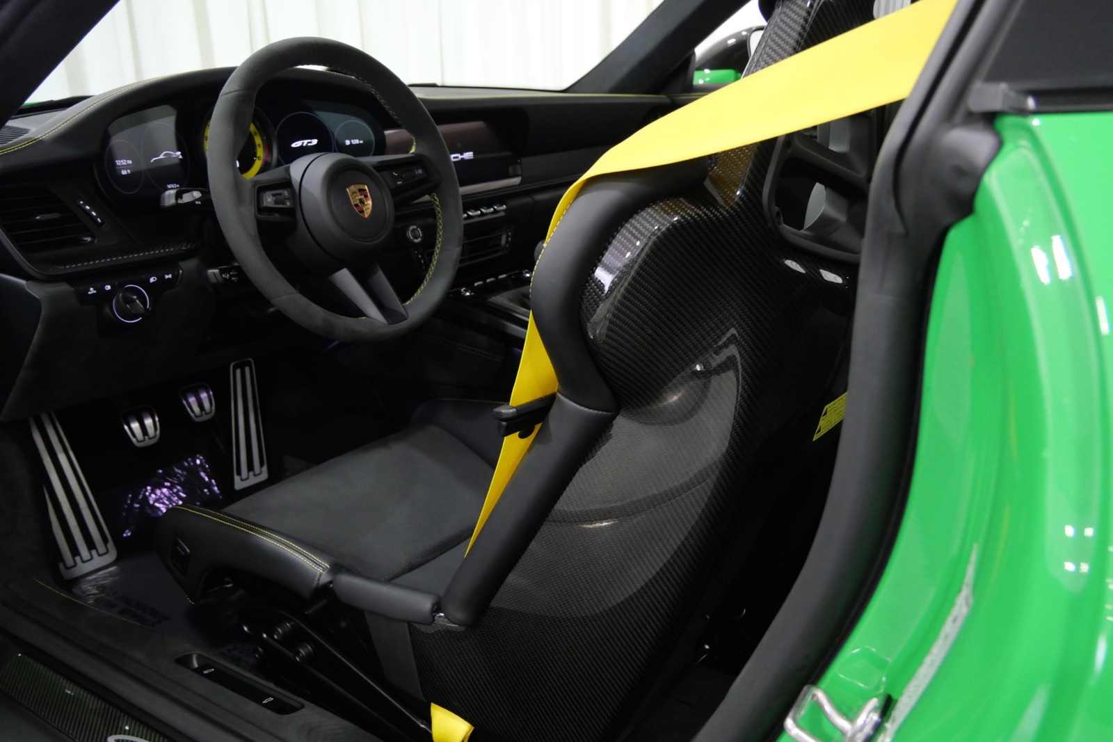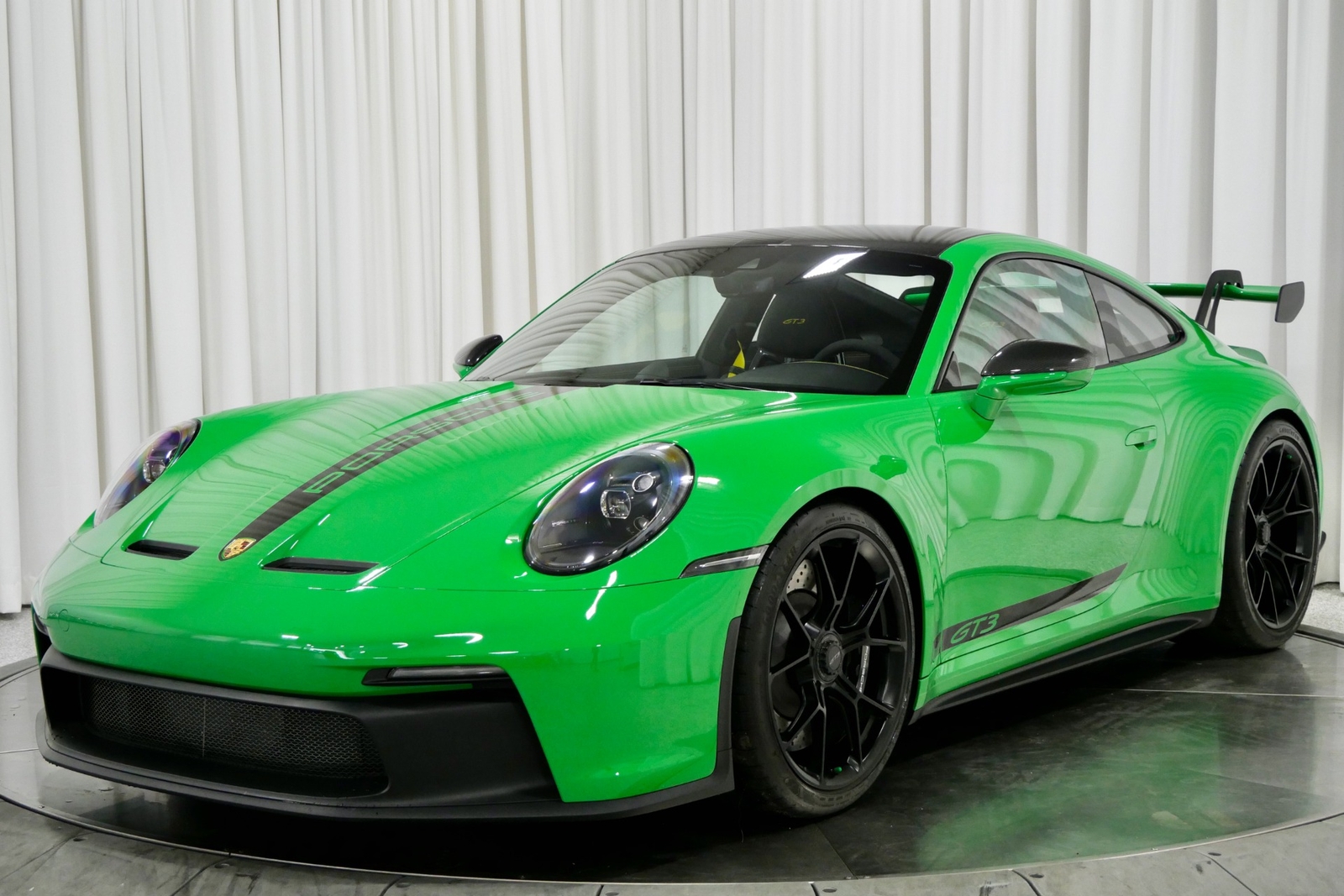 We have just added to our extensive exotic car inventory a beautiful 2023 Porsche 911 GT3 in Python Green over Black interior and only 1,474 miles. This GT3 is loaded with: 4.0 Liter H6, 6 speed manual transmission, 20/21 inch centerlock wheels in satin black, black brake calipers, front axle lift, carbon fiber roof, Motorsport decal on top in black, model designation decals on sides in black, LED headlamps in black with dynamic lighting, Exclusive Design taillights, window triangle trims in carbon fiber, leather and Race-Tex interior with yellow stitching, carbon fiber racing buckets, interior inlays in carbon fiber, center console lid with Porsche script, extended Race-Tex package, deviated stitching interior package in yellow (dashboard, rear side panels, center console lid, knee pad, door panels), Bose surround sound, tachometer in Racing Yellow, Chrono package with preparation for lap trigger, Sport Chrono face in Racing Yellow, Porsche PCM with navigation, preparation for Porsche dashcam, floor mats, extended range fuel tank, exclusive design fuel cap, under door puddle light projectors, seat belts in Racing Yellow, pedals and footrest in aluminum, ambient lighting and much more.
