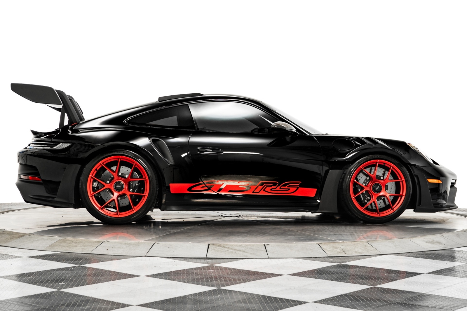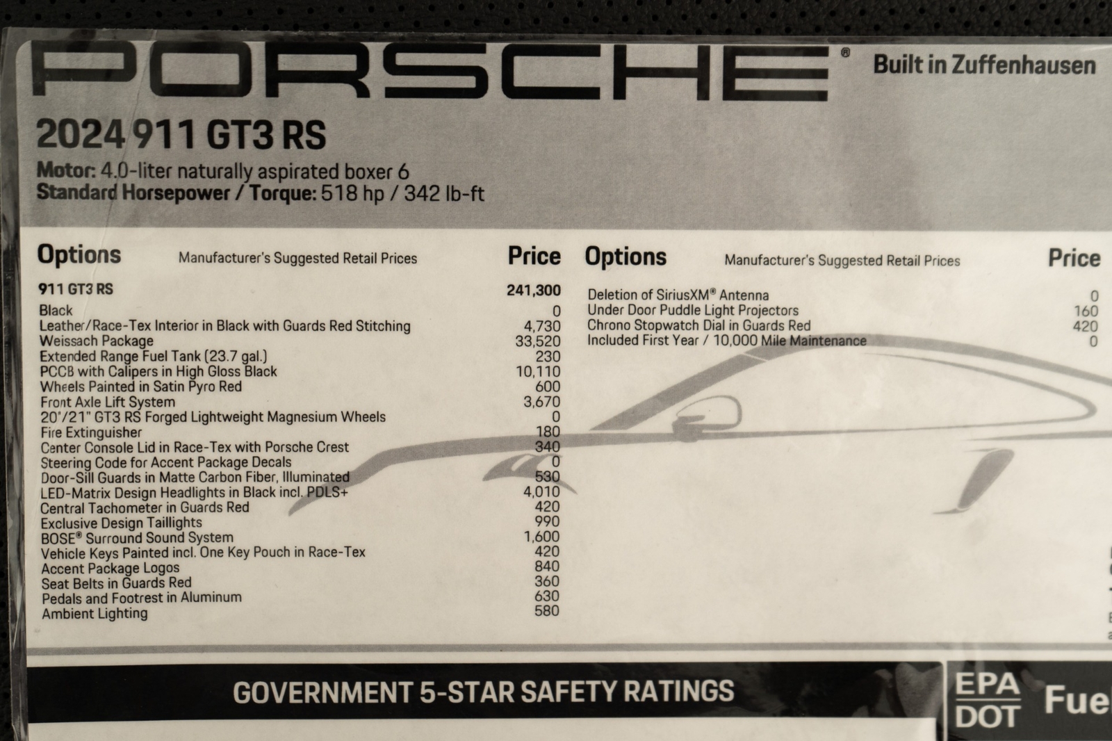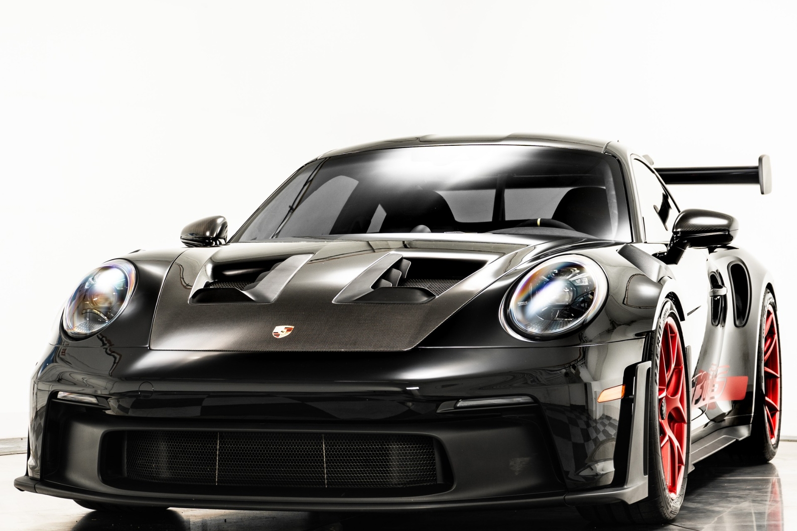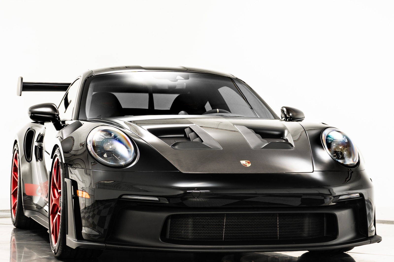 We have just added to our extensive exotic car inventory a beautiful 2024 Porsche 911 GT3 RS in Black over Black interior and only 1,394 miles. This GT3 is loaded with: 4.0 Liter H6, 7 speed PDK transmission, Weissach package (20/21 inch magnesium centerlock wheels, exposed carbon fiber hood, roof, mirrors, window triangle trims and rear wing, door grab handles in matte carbon, magnesium shift paddles, upper part of gearshift panel in Race-Tex, headrest embroidery, CFRP sway bars, CFRP coupling rods and underbody panel on rear axle), wheels painted in satin Pyro Red, black brake calipers, front axle lift, model designation decals on sides in red, LED headlamps in black with dynamic lighting, Exclusive Design taillights, illuminated carbon fiber door sills, carbon fiber racing buckets, interior inlays in carbon fiber, center console lid with Porsche logo, Bose surround sound, tachometer in Guards Red, Sport Chrono face in Guards Red, Porsche PCM with navigation, floor mats, extended range fuel tank, under door puddle light projectors, seat belts in Guards Red, pedals and footrest in aluminum, ambient lighting, deletion of satellite radio antenna and much more.